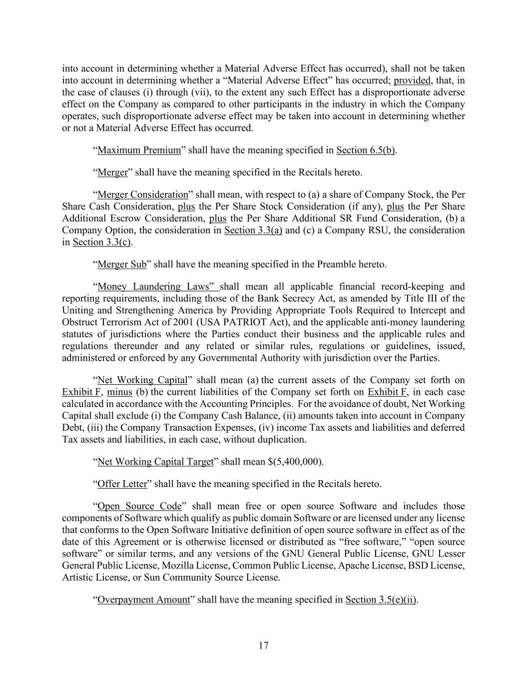17 into account in determining whether a Material Adverse Effect has occurred), shall not be taken into account in determining whether a “Material Adverse Effect” has occurred; provided, that, in the case of clauses (i) through (vii), to the extent any such Effect has a disproportionate adverse effect on the Company as compared to other participants in the industry in which the Company operates, such disproportionate adverse effect may be taken into account in determining whether or not a Material Adverse Effect has occurred. “Maximum Premium” shall have the meaning specified in Section 6.5(b). “Merger” shall have the meaning specified in the Recitals hereto. “Merger Consideration” shall mean, with respect to (a) a share of Company Stock, the Per Share Cash Consideration, plus the Per Share Stock Consideration (if any), plus the Per Share Additional Escrow Consideration, plus the Per Share Additional SR Fund Consideration, (b) a Company Option, the consideration in Section 3.3(a) and (c) a Company RSU, the consideration in Section 3.3(c). “Merger Sub” shall have the meaning specified in the Preamble hereto. “Money Laundering Laws” shall mean all applicable financial record-keeping and reporting requirements, including those of the Bank Secrecy Act, as amended by Title III of the Uniting and Strengthening America by Providing Appropriate Tools Required to Intercept and Obstruct Terrorism Act of 2001 (USA PATRIOT Act), and the applicable anti-money laundering statutes of jurisdictions where the Parties conduct their business and the applicable rules and regulations thereunder and any related or similar rules, regulations or guidelines, issued, administered or enforced by any Governmental Authority with jurisdiction over the Parties. “Net Working Capital” shall mean (a) the current assets of the Company set forth on Exhibit F, minus (b) the current liabilities of the Company set forth on Exhibit F, in each case calculated in accordance with the Accounting Principles. For the avoidance of doubt, Net Working Capital shall exclude (i) the Company Cash Balance, (ii) amounts taken into account in Company Debt, (iii) the Company Transaction Expenses, (iv) income Tax assets and liabilities and deferred Tax assets and liabilities, in each case, without duplication. “Net Working Capital Target” shall mean $(5,400,000). “Offer Letter” shall have the meaning specified in the Recitals hereto. “Open Source Code” shall mean free or open source Software and includes those components of Software which qualify as public domain Software or are licensed under any license that conforms to the Open Software Initiative definition of open source software in effect as of the date of this Agreement or is otherwise licensed or distributed as “free software,” “open source software” or similar terms, and any versions of the GNU General Public License, GNU Lesser General Public License, Mozilla License, Common Public License, Apache License, BSD License, Artistic License, or Sun Community Source License. “Overpayment Amount” shall have the meaning specified in Section 3.5(e)(ii).