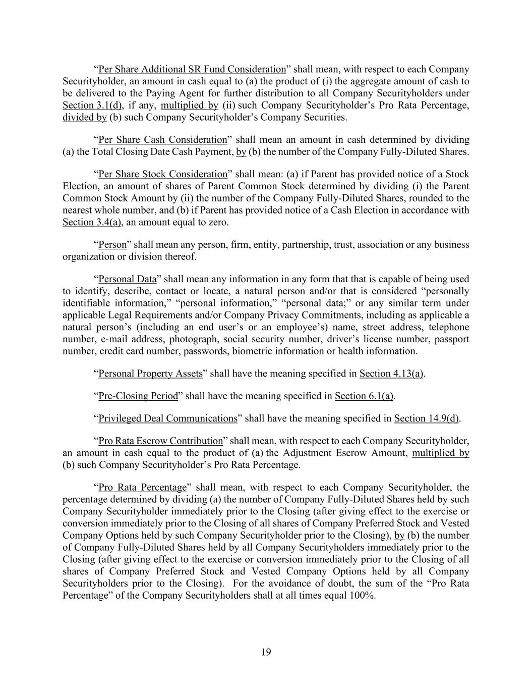 19 “Per Share Additional SR Fund Consideration” shall mean, with respect to each Company Securityholder, an amount in cash equal to (a) the product of (i) the aggregate amount of cash to be delivered to the Paying Agent for further distribution to all Company Securityholders under Section 3.1(d), if any, multiplied by (ii) such Company Securityholder’s Pro Rata Percentage, divided by (b) such Company Securityholder’s Company Securities. “Per Share Cash Consideration” shall mean an amount in cash determined by dividing (a) the Total Closing Date Cash Payment, by (b) the number of the Company Fully-Diluted Shares. “Per Share Stock Consideration” shall mean: (a) if Parent has provided notice of a Stock Election, an amount of shares of Parent Common Stock determined by dividing (i) the Parent Common Stock Amount by (ii) the number of the Company Fully-Diluted Shares, rounded to the nearest whole number, and (b) if Parent has provided notice of a Cash Election in accordance with Section 3.4(a), an amount equal to zero. “Person” shall mean any person, firm, entity, partnership, trust, association or any business organization or division thereof. “Personal Data” shall mean any information in any form that that is capable of being used to identify, describe, contact or locate, a natural person and/or that is considered “personally identifiable information,” “personal information,” “personal data;” or any similar term under applicable Legal Requirements and/or Company Privacy Commitments, including as applicable a natural person’s (including an end user’s or an employee’s) name, street address, telephone number, e-mail address, photograph, social security number, driver’s license number, passport number, credit card number, passwords, biometric information or health information. “Personal Property Assets” shall have the meaning specified in Section 4.13(a). “Pre-Closing Period” shall have the meaning specified in Section 6.1(a). “Privileged Deal Communications” shall have the meaning specified in Section 14.9(d). “Pro Rata Escrow Contribution” shall mean, with respect to each Company Securityholder, an amount in cash equal to the product of (a) the Adjustment Escrow Amount, multiplied by (b) such Company Securityholder’s Pro Rata Percentage. “Pro Rata Percentage” shall mean, with respect to each Company Securityholder, the percentage determined by dividing (a) the number of Company Fully-Diluted Shares held by such Company Securityholder immediately prior to the Closing (after giving effect to the exercise or conversion immediately prior to the Closing of all shares of Company Preferred Stock and Vested Company Options held by such Company Securityholder prior to the Closing), by (b) the number of Company Fully-Diluted Shares held by all Company Securityholders immediately prior to the Closing (after giving effect to the exercise or conversion immediately prior to the Closing of all shares of Company Preferred Stock and Vested Company Options held by all Company Securityholders prior to the Closing). For the avoidance of doubt, the sum of the “Pro Rata Percentage” of the Company Securityholders shall at all times equal 100%.