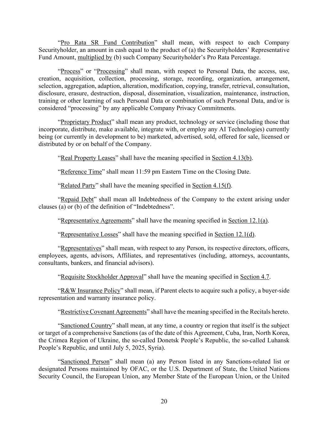 20 “Pro Rata SR Fund Contribution” shall mean, with respect to each Company Securityholder, an amount in cash equal to the product of (a) the Securityholders’ Representative Fund Amount, multiplied by (b) such Company Securityholder’s Pro Rata Percentage. “Process” or “Processing” shall mean, with respect to Personal Data, the access, use, creation, acquisition, collection, processing, storage, recording, organization, arrangement, selection, aggregation, adaption, alteration, modification, copying, transfer, retrieval, consultation, disclosure, erasure, destruction, disposal, dissemination, visualization, maintenance, instruction, training or other learning of such Personal Data or combination of such Personal Data, and/or is considered “processing” by any applicable Company Privacy Commitments. “Proprietary Product” shall mean any product, technology or service (including those that incorporate, distribute, make available, integrate with, or employ any AI Technologies) currently being (or currently in development to be) marketed, advertised, sold, offered for sale, licensed or distributed by or on behalf of the Company. “Real Property Leases” shall have the meaning specified in Section 4.13(b). “Reference Time” shall mean 11:59 pm Eastern Time on the Closing Date. “Related Party” shall have the meaning specified in Section 4.15(f). “Repaid Debt” shall mean all Indebtedness of the Company to the extent arising under clauses (a) or (b) of the definition of “Indebtedness”. “Representative Agreements” shall have the meaning specified in Section 12.1(a). “Representative Losses” shall have the meaning specified in Section 12.1(d). “Representatives” shall mean, with respect to any Person, its respective directors, officers, employees, agents, advisors, Affiliates, and representatives (including, attorneys, accountants, consultants, bankers, and financial advisors). “Requisite Stockholder Approval” shall have the meaning specified in Section 4.7. “R&W Insurance Policy” shall mean, if Parent elects to acquire such a policy, a buyer-side representation and warranty insurance policy. “Restrictive Covenant Agreements” shall have the meaning specified in the Recitals hereto. “Sanctioned Country” shall mean, at any time, a country or region that itself is the subject or target of a comprehensive Sanctions (as of the date of this Agreement, Cuba, Iran, North Korea, the Crimea Region of Ukraine, the so-called Donetsk People’s Republic, the so-called Luhansk People’s Republic, and until July 5, 2025, Syria). “Sanctioned Person” shall mean (a) any Person listed in any Sanctions-related list or designated Persons maintained by OFAC, or the U.S. Department of State, the United Nations Security Council, the European Union, any Member State of the European Union, or the United