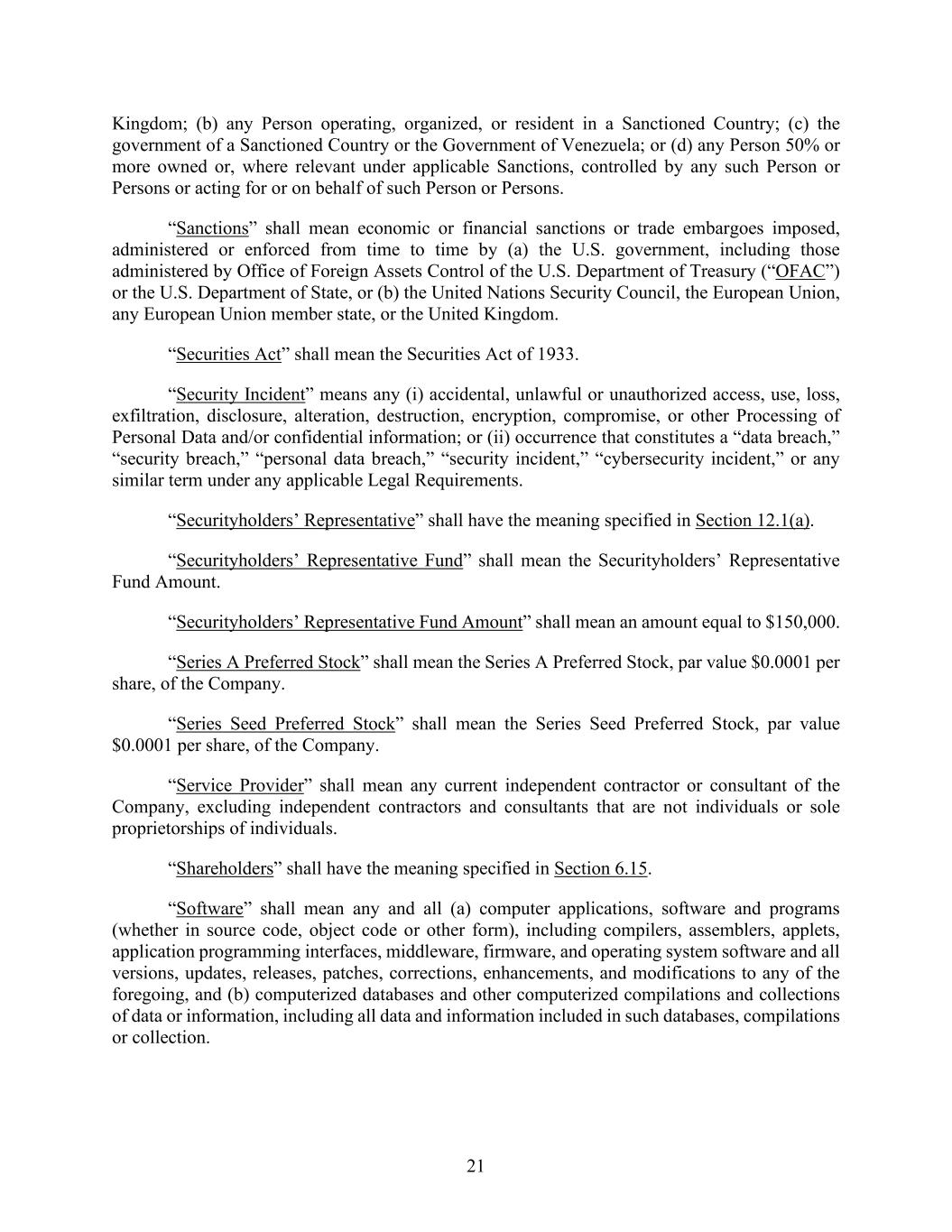 21 Kingdom; (b) any Person operating, organized, or resident in a Sanctioned Country; (c) the government of a Sanctioned Country or the Government of Venezuela; or (d) any Person 50% or more owned or, where relevant under applicable Sanctions, controlled by any such Person or Persons or acting for or on behalf of such Person or Persons. “Sanctions” shall mean economic or financial sanctions or trade embargoes imposed, administered or enforced from time to time by (a) the U.S. government, including those administered by Office of Foreign Assets Control of the U.S. Department of Treasury (“OFAC”) or the U.S. Department of State, or (b) the United Nations Security Council, the European Union, any European Union member state, or the United Kingdom. “Securities Act” shall mean the Securities Act of 1933. “Security Incident” means any (i) accidental, unlawful or unauthorized access, use, loss, exfiltration, disclosure, alteration, destruction, encryption, compromise, or other Processing of Personal Data and/or confidential information; or (ii) occurrence that constitutes a “data breach,” “security breach,” “personal data breach,” “security incident,” “cybersecurity incident,” or any similar term under any applicable Legal Requirements. “Securityholders’ Representative” shall have the meaning specified in Section 12.1(a). “Securityholders’ Representative Fund” shall mean the Securityholders’ Representative Fund Amount. “Securityholders’ Representative Fund Amount” shall mean an amount equal to $150,000. “Series A Preferred Stock” shall mean the Series A Preferred Stock, par value $0.0001 per share, of the Company. “Series Seed Preferred Stock” shall mean the Series Seed Preferred Stock, par value $0.0001 per share, of the Company. “Service Provider” shall mean any current independent contractor or consultant of the Company, excluding independent contractors and consultants that are not individuals or sole proprietorships of individuals. “Shareholders” shall have the meaning specified in Section 6.15. “Software” shall mean any and all (a) computer applications, software and programs (whether in source code, object code or other form), including compilers, assemblers, applets, application programming interfaces, middleware, firmware, and operating system software and all versions, updates, releases, patches, corrections, enhancements, and modifications to any of the foregoing, and (b) computerized databases and other computerized compilations and collections of data or information, including all data and information included in such databases, compilations or collection.