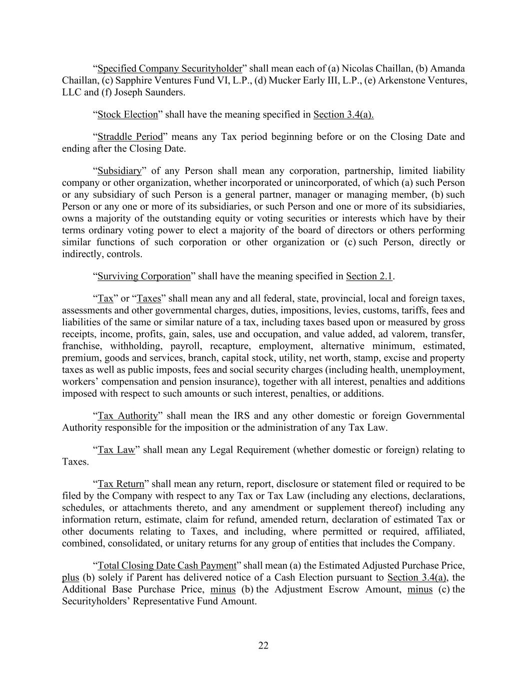 22 “Specified Company Securityholder” shall mean each of (a) Nicolas Chaillan, (b) Amanda Chaillan, (c) Sapphire Ventures Fund VI, L.P., (d) Mucker Early III, L.P., (e) Arkenstone Ventures, LLC and (f) Joseph Saunders. “Stock Election” shall have the meaning specified in Section 3.4(a). “Straddle Period” means any Tax period beginning before or on the Closing Date and ending after the Closing Date. “Subsidiary” of any Person shall mean any corporation, partnership, limited liability company or other organization, whether incorporated or unincorporated, of which (a) such Person or any subsidiary of such Person is a general partner, manager or managing member, (b) such Person or any one or more of its subsidiaries, or such Person and one or more of its subsidiaries, owns a majority of the outstanding equity or voting securities or interests which have by their terms ordinary voting power to elect a majority of the board of directors or others performing similar functions of such corporation or other organization or (c) such Person, directly or indirectly, controls. “Surviving Corporation” shall have the meaning specified in Section 2.1. “Tax” or “Taxes” shall mean any and all federal, state, provincial, local and foreign taxes, assessments and other governmental charges, duties, impositions, levies, customs, tariffs, fees and liabilities of the same or similar nature of a tax, including taxes based upon or measured by gross receipts, income, profits, gain, sales, use and occupation, and value added, ad valorem, transfer, franchise, withholding, payroll, recapture, employment, alternative minimum, estimated, premium, goods and services, branch, capital stock, utility, net worth, stamp, excise and property taxes as well as public imposts, fees and social security charges (including health, unemployment, workers’ compensation and pension insurance), together with all interest, penalties and additions imposed with respect to such amounts or such interest, penalties, or additions. “Tax Authority” shall mean the IRS and any other domestic or foreign Governmental Authority responsible for the imposition or the administration of any Tax Law. “Tax Law” shall mean any Legal Requirement (whether domestic or foreign) relating to Taxes. “Tax Return” shall mean any return, report, disclosure or statement filed or required to be filed by the Company with respect to any Tax or Tax Law (including any elections, declarations, schedules, or attachments thereto, and any amendment or supplement thereof) including any information return, estimate, claim for refund, amended return, declaration of estimated Tax or other documents relating to Taxes, and including, where permitted or required, affiliated, combined, consolidated, or unitary returns for any group of entities that includes the Company. “Total Closing Date Cash Payment” shall mean (a) the Estimated Adjusted Purchase Price, plus (b) solely if Parent has delivered notice of a Cash Election pursuant to Section 3.4(a), the Additional Base Purchase Price, minus (b) the Adjustment Escrow Amount, minus (c) the Securityholders’ Representative Fund Amount.