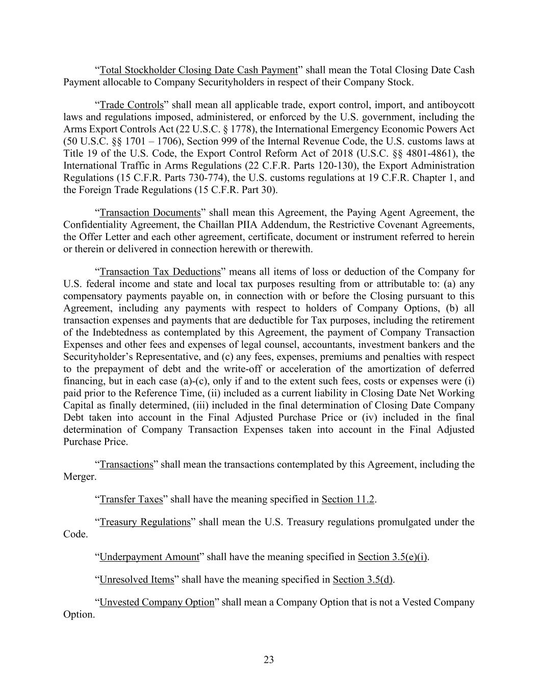 23 “Total Stockholder Closing Date Cash Payment” shall mean the Total Closing Date Cash Payment allocable to Company Securityholders in respect of their Company Stock. “Trade Controls” shall mean all applicable trade, export control, import, and antiboycott laws and regulations imposed, administered, or enforced by the U.S. government, including the Arms Export Controls Act (22 U.S.C. § 1778), the International Emergency Economic Powers Act (50 U.S.C. §§ 1701 – 1706), Section 999 of the Internal Revenue Code, the U.S. customs laws at Title 19 of the U.S. Code, the Export Control Reform Act of 2018 (U.S.C. §§ 4801-4861), the International Traffic in Arms Regulations (22 C.F.R. Parts 120-130), the Export Administration Regulations (15 C.F.R. Parts 730-774), the U.S. customs regulations at 19 C.F.R. Chapter 1, and the Foreign Trade Regulations (15 C.F.R. Part 30). “Transaction Documents” shall mean this Agreement, the Paying Agent Agreement, the Confidentiality Agreement, the Chaillan PIIA Addendum, the Restrictive Covenant Agreements, the Offer Letter and each other agreement, certificate, document or instrument referred to herein or therein or delivered in connection herewith or therewith. “Transaction Tax Deductions” means all items of loss or deduction of the Company for U.S. federal income and state and local tax purposes resulting from or attributable to: (a) any compensatory payments payable on, in connection with or before the Closing pursuant to this Agreement, including any payments with respect to holders of Company Options, (b) all transaction expenses and payments that are deductible for Tax purposes, including the retirement of the Indebtedness as contemplated by this Agreement, the payment of Company Transaction Expenses and other fees and expenses of legal counsel, accountants, investment bankers and the Securityholder’s Representative, and (c) any fees, expenses, premiums and penalties with respect to the prepayment of debt and the write-off or acceleration of the amortization of deferred financing, but in each case (a)-(c), only if and to the extent such fees, costs or expenses were (i) paid prior to the Reference Time, (ii) included as a current liability in Closing Date Net Working Capital as finally determined, (iii) included in the final determination of Closing Date Company Debt taken into account in the Final Adjusted Purchase Price or (iv) included in the final determination of Company Transaction Expenses taken into account in the Final Adjusted Purchase Price. “Transactions” shall mean the transactions contemplated by this Agreement, including the Merger. “Transfer Taxes” shall have the meaning specified in Section 11.2. “Treasury Regulations” shall mean the U.S. Treasury regulations promulgated under the Code. “Underpayment Amount” shall have the meaning specified in Section 3.5(e)(i). “Unresolved Items” shall have the meaning specified in Section 3.5(d). “Unvested Company Option” shall mean a Company Option that is not a Vested Company Option.