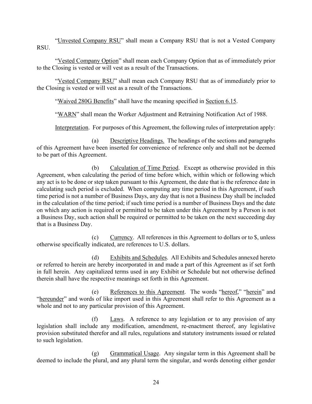 24 “Unvested Company RSU” shall mean a Company RSU that is not a Vested Company RSU. “Vested Company Option” shall mean each Company Option that as of immediately prior to the Closing is vested or will vest as a result of the Transactions. “Vested Company RSU” shall mean each Company RSU that as of immediately prior to the Closing is vested or will vest as a result of the Transactions. “Waived 280G Benefits” shall have the meaning specified in Section 6.15. “WARN” shall mean the Worker Adjustment and Retraining Notification Act of 1988. Interpretation. For purposes of this Agreement, the following rules of interpretation apply: (a) Descriptive Headings. The headings of the sections and paragraphs of this Agreement have been inserted for convenience of reference only and shall not be deemed to be part of this Agreement. (b) Calculation of Time Period. Except as otherwise provided in this Agreement, when calculating the period of time before which, within which or following which any act is to be done or step taken pursuant to this Agreement, the date that is the reference date in calculating such period is excluded. When computing any time period in this Agreement, if such time period is not a number of Business Days, any day that is not a Business Day shall be included in the calculation of the time period; if such time period is a number of Business Days and the date on which any action is required or permitted to be taken under this Agreement by a Person is not a Business Day, such action shall be required or permitted to be taken on the next succeeding day that is a Business Day. (c) Currency. All references in this Agreement to dollars or to $, unless otherwise specifically indicated, are references to U.S. dollars. (d) Exhibits and Schedules. All Exhibits and Schedules annexed hereto or referred to herein are hereby incorporated in and made a part of this Agreement as if set forth in full herein. Any capitalized terms used in any Exhibit or Schedule but not otherwise defined therein shall have the respective meanings set forth in this Agreement. (e) References to this Agreement. The words “hereof,” “herein” and “hereunder” and words of like import used in this Agreement shall refer to this Agreement as a whole and not to any particular provision of this Agreement. (f) Laws. A reference to any legislation or to any provision of any legislation shall include any modification, amendment, re-enactment thereof, any legislative provision substituted therefor and all rules, regulations and statutory instruments issued or related to such legislation. (g) Grammatical Usage. Any singular term in this Agreement shall be deemed to include the plural, and any plural term the singular, and words denoting either gender