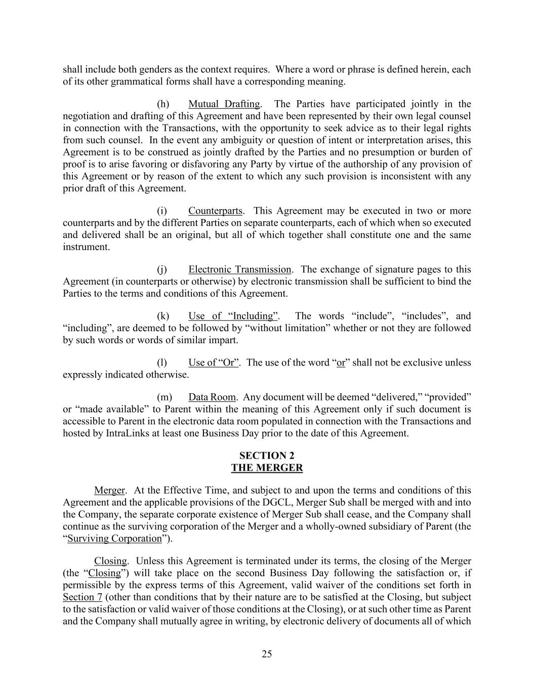 25 shall include both genders as the context requires. Where a word or phrase is defined herein, each of its other grammatical forms shall have a corresponding meaning. (h) Mutual Drafting. The Parties have participated jointly in the negotiation and drafting of this Agreement and have been represented by their own legal counsel in connection with the Transactions, with the opportunity to seek advice as to their legal rights from such counsel. In the event any ambiguity or question of intent or interpretation arises, this Agreement is to be construed as jointly drafted by the Parties and no presumption or burden of proof is to arise favoring or disfavoring any Party by virtue of the authorship of any provision of this Agreement or by reason of the extent to which any such provision is inconsistent with any prior draft of this Agreement. (i) Counterparts. This Agreement may be executed in two or more counterparts and by the different Parties on separate counterparts, each of which when so executed and delivered shall be an original, but all of which together shall constitute one and the same instrument. (j) Electronic Transmission. The exchange of signature pages to this Agreement (in counterparts or otherwise) by electronic transmission shall be sufficient to bind the Parties to the terms and conditions of this Agreement. (k) Use of “Including”. The words “include”, “includes”, and “including”, are deemed to be followed by “without limitation” whether or not they are followed by such words or words of similar impart. (l) Use of “Or”. The use of the word “or” shall not be exclusive unless expressly indicated otherwise. (m) Data Room. Any document will be deemed “delivered,” “provided” or “made available” to Parent within the meaning of this Agreement only if such document is accessible to Parent in the electronic data room populated in connection with the Transactions and hosted by IntraLinks at least one Business Day prior to the date of this Agreement. SECTION 2 THE MERGER Merger. At the Effective Time, and subject to and upon the terms and conditions of this Agreement and the applicable provisions of the DGCL, Merger Sub shall be merged with and into the Company, the separate corporate existence of Merger Sub shall cease, and the Company shall continue as the surviving corporation of the Merger and a wholly-owned subsidiary of Parent (the “Surviving Corporation”). Closing. Unless this Agreement is terminated under its terms, the closing of the Merger (the “Closing”) will take place on the second Business Day following the satisfaction or, if permissible by the express terms of this Agreement, valid waiver of the conditions set forth in Section 7 (other than conditions that by their nature are to be satisfied at the Closing, but subject to the satisfaction or valid waiver of those conditions at the Closing), or at such other time as Parent and the Company shall mutually agree in writing, by electronic delivery of documents all of which