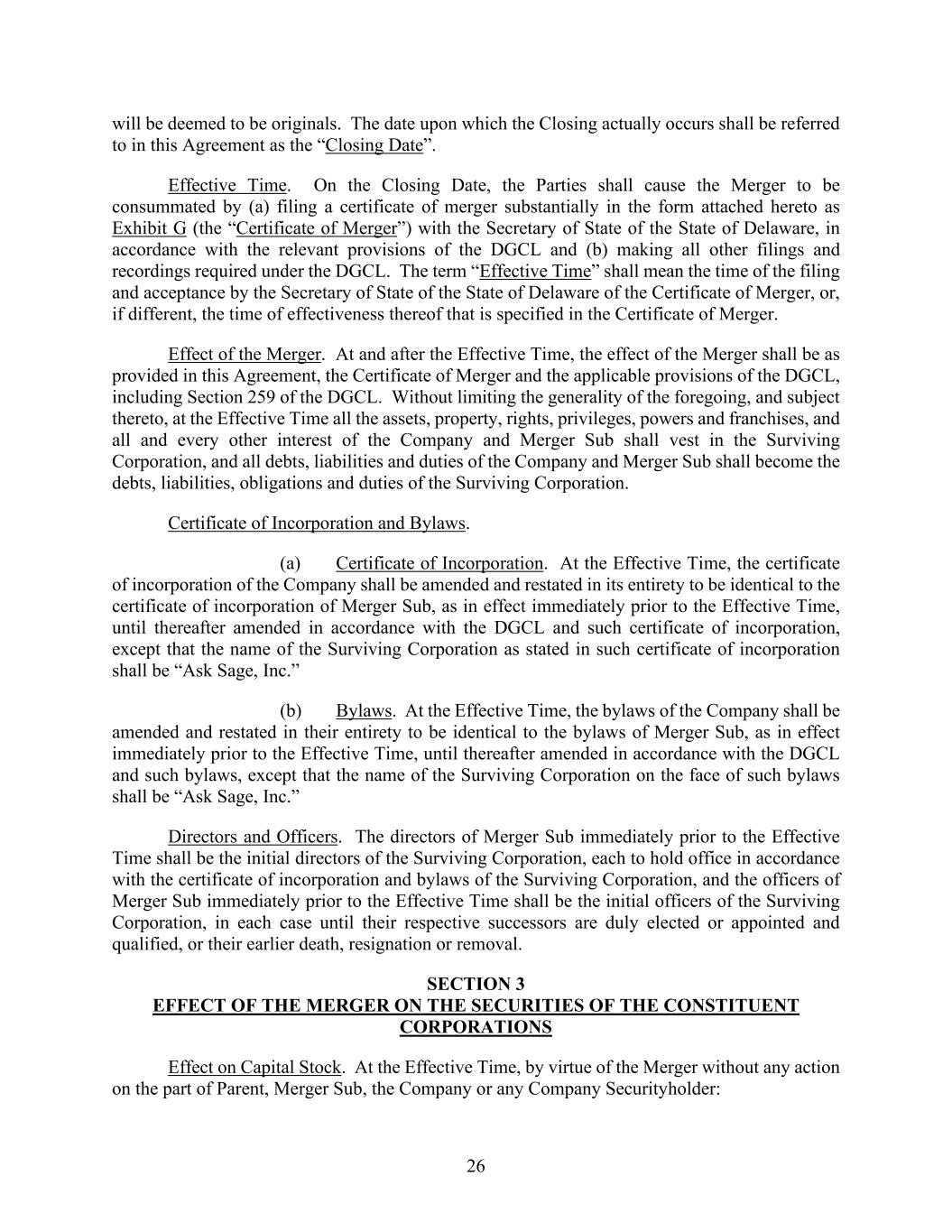 26 will be deemed to be originals. The date upon which the Closing actually occurs shall be referred to in this Agreement as the “Closing Date”. Effective Time. On the Closing Date, the Parties shall cause the Merger to be consummated by (a) filing a certificate of merger substantially in the form attached hereto as Exhibit G (the “Certificate of Merger”) with the Secretary of State of the State of Delaware, in accordance with the relevant provisions of the DGCL and (b) making all other filings and recordings required under the DGCL. The term “Effective Time” shall mean the time of the filing and acceptance by the Secretary of State of the State of Delaware of the Certificate of Merger, or, if different, the time of effectiveness thereof that is specified in the Certificate of Merger. Effect of the Merger. At and after the Effective Time, the effect of the Merger shall be as provided in this Agreement, the Certificate of Merger and the applicable provisions of the DGCL, including Section 259 of the DGCL. Without limiting the generality of the foregoing, and subject thereto, at the Effective Time all the assets, property, rights, privileges, powers and franchises, and all and every other interest of the Company and Merger Sub shall vest in the Surviving Corporation, and all debts, liabilities and duties of the Company and Merger Sub shall become the debts, liabilities, obligations and duties of the Surviving Corporation. Certificate of Incorporation and Bylaws. (a) Certificate of Incorporation. At the Effective Time, the certificate of incorporation of the Company shall be amended and restated in its entirety to be identical to the certificate of incorporation of Merger Sub, as in effect immediately prior to the Effective Time, until thereafter amended in accordance with the DGCL and such certificate of incorporation, except that the name of the Surviving Corporation as stated in such certificate of incorporation shall be “Ask Sage, Inc.” (b) Bylaws. At the Effective Time, the bylaws of the Company shall be amended and restated in their entirety to be identical to the bylaws of Merger Sub, as in effect immediately prior to the Effective Time, until thereafter amended in accordance with the DGCL and such bylaws, except that the name of the Surviving Corporation on the face of such bylaws shall be “Ask Sage, Inc.” Directors and Officers. The directors of Merger Sub immediately prior to the Effective Time shall be the initial directors of the Surviving Corporation, each to hold office in accordance with the certificate of incorporation and bylaws of the Surviving Corporation, and the officers of Merger Sub immediately prior to the Effective Time shall be the initial officers of the Surviving Corporation, in each case until their respective successors are duly elected or appointed and qualified, or their earlier death, resignation or removal. SECTION 3 EFFECT OF THE MERGER ON THE SECURITIES OF THE CONSTITUENT CORPORATIONS Effect on Capital Stock. At the Effective Time, by virtue of the Merger without any action on the part of Parent, Merger Sub, the Company or any Company Securityholder: