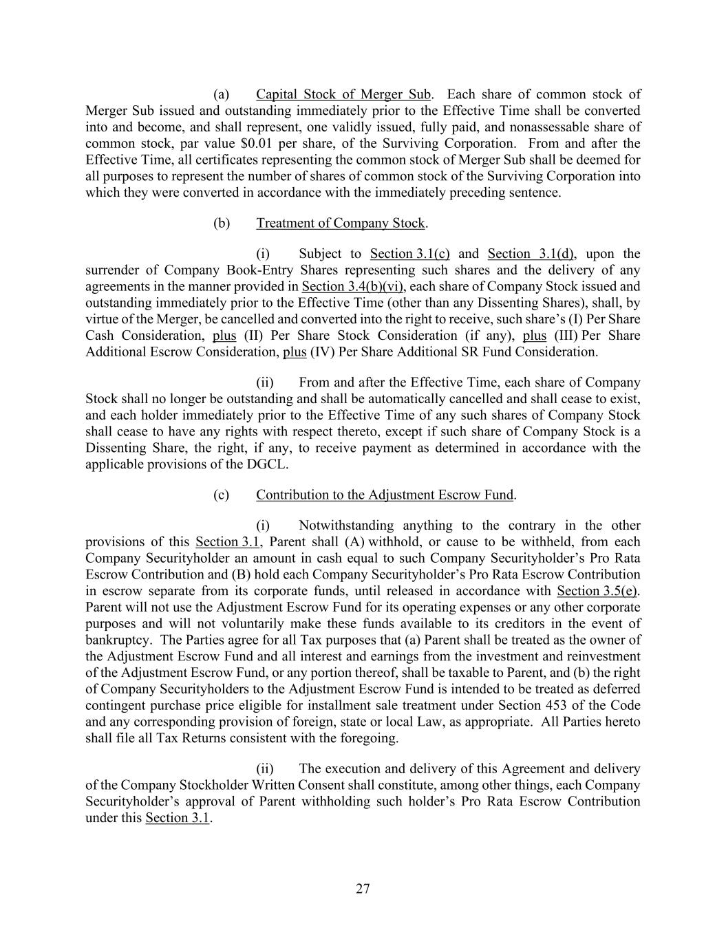 27 (a) Capital Stock of Merger Sub. Each share of common stock of Merger Sub issued and outstanding immediately prior to the Effective Time shall be converted into and become, and shall represent, one validly issued, fully paid, and nonassessable share of common stock, par value $0.01 per share, of the Surviving Corporation. From and after the Effective Time, all certificates representing the common stock of Merger Sub shall be deemed for all purposes to represent the number of shares of common stock of the Surviving Corporation into which they were converted in accordance with the immediately preceding sentence. (b) Treatment of Company Stock. (i) Subject to Section 3.1(c) and Section 3.1(d), upon the surrender of Company Book-Entry Shares representing such shares and the delivery of any agreements in the manner provided in Section 3.4(b)(vi), each share of Company Stock issued and outstanding immediately prior to the Effective Time (other than any Dissenting Shares), shall, by virtue of the Merger, be cancelled and converted into the right to receive, such share’s (I) Per Share Cash Consideration, plus (II) Per Share Stock Consideration (if any), plus (III) Per Share Additional Escrow Consideration, plus (IV) Per Share Additional SR Fund Consideration. (ii) From and after the Effective Time, each share of Company Stock shall no longer be outstanding and shall be automatically cancelled and shall cease to exist, and each holder immediately prior to the Effective Time of any such shares of Company Stock shall cease to have any rights with respect thereto, except if such share of Company Stock is a Dissenting Share, the right, if any, to receive payment as determined in accordance with the applicable provisions of the DGCL. (c) Contribution to the Adjustment Escrow Fund. (i) Notwithstanding anything to the contrary in the other provisions of this Section 3.1, Parent shall (A) withhold, or cause to be withheld, from each Company Securityholder an amount in cash equal to such Company Securityholder’s Pro Rata Escrow Contribution and (B) hold each Company Securityholder’s Pro Rata Escrow Contribution in escrow separate from its corporate funds, until released in accordance with Section 3.5(e). Parent will not use the Adjustment Escrow Fund for its operating expenses or any other corporate purposes and will not voluntarily make these funds available to its creditors in the event of bankruptcy. The Parties agree for all Tax purposes that (a) Parent shall be treated as the owner of the Adjustment Escrow Fund and all interest and earnings from the investment and reinvestment of the Adjustment Escrow Fund, or any portion thereof, shall be taxable to Parent, and (b) the right of Company Securityholders to the Adjustment Escrow Fund is intended to be treated as deferred contingent purchase price eligible for installment sale treatment under Section 453 of the Code and any corresponding provision of foreign, state or local Law, as appropriate. All Parties hereto shall file all Tax Returns consistent with the foregoing. (ii) The execution and delivery of this Agreement and delivery of the Company Stockholder Written Consent shall constitute, among other things, each Company Securityholder’s approval of Parent withholding such holder’s Pro Rata Escrow Contribution under this Section 3.1.