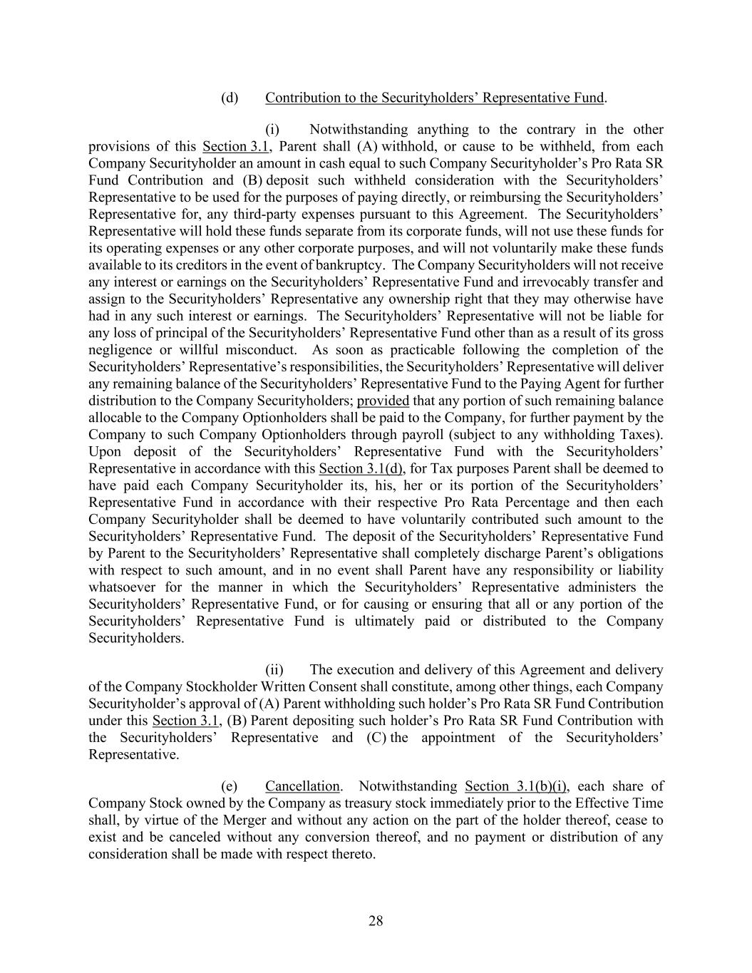 28 (d) Contribution to the Securityholders’ Representative Fund. (i) Notwithstanding anything to the contrary in the other provisions of this Section 3.1, Parent shall (A) withhold, or cause to be withheld, from each Company Securityholder an amount in cash equal to such Company Securityholder’s Pro Rata SR Fund Contribution and (B) deposit such withheld consideration with the Securityholders’ Representative to be used for the purposes of paying directly, or reimbursing the Securityholders’ Representative for, any third-party expenses pursuant to this Agreement. The Securityholders’ Representative will hold these funds separate from its corporate funds, will not use these funds for its operating expenses or any other corporate purposes, and will not voluntarily make these funds available to its creditors in the event of bankruptcy. The Company Securityholders will not receive any interest or earnings on the Securityholders’ Representative Fund and irrevocably transfer and assign to the Securityholders’ Representative any ownership right that they may otherwise have had in any such interest or earnings. The Securityholders’ Representative will not be liable for any loss of principal of the Securityholders’ Representative Fund other than as a result of its gross negligence or willful misconduct. As soon as practicable following the completion of the Securityholders’ Representative’s responsibilities, the Securityholders’ Representative will deliver any remaining balance of the Securityholders’ Representative Fund to the Paying Agent for further distribution to the Company Securityholders; provided that any portion of such remaining balance allocable to the Company Optionholders shall be paid to the Company, for further payment by the Company to such Company Optionholders through payroll (subject to any withholding Taxes). Upon deposit of the Securityholders’ Representative Fund with the Securityholders’ Representative in accordance with this Section 3.1(d), for Tax purposes Parent shall be deemed to have paid each Company Securityholder its, his, her or its portion of the Securityholders’ Representative Fund in accordance with their respective Pro Rata Percentage and then each Company Securityholder shall be deemed to have voluntarily contributed such amount to the Securityholders’ Representative Fund. The deposit of the Securityholders’ Representative Fund by Parent to the Securityholders’ Representative shall completely discharge Parent’s obligations with respect to such amount, and in no event shall Parent have any responsibility or liability whatsoever for the manner in which the Securityholders’ Representative administers the Securityholders’ Representative Fund, or for causing or ensuring that all or any portion of the Securityholders’ Representative Fund is ultimately paid or distributed to the Company Securityholders. (ii) The execution and delivery of this Agreement and delivery of the Company Stockholder Written Consent shall constitute, among other things, each Company Securityholder’s approval of (A) Parent withholding such holder’s Pro Rata SR Fund Contribution under this Section 3.1, (B) Parent depositing such holder’s Pro Rata SR Fund Contribution with the Securityholders’ Representative and (C) the appointment of the Securityholders’ Representative. (e) Cancellation. Notwithstanding Section 3.1(b)(i), each share of Company Stock owned by the Company as treasury stock immediately prior to the Effective Time shall, by virtue of the Merger and without any action on the part of the holder thereof, cease to exist and be canceled without any conversion thereof, and no payment or distribution of any consideration shall be made with respect thereto.