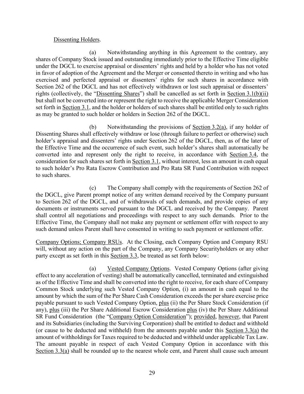 29 Dissenting Holders. (a) Notwithstanding anything in this Agreement to the contrary, any shares of Company Stock issued and outstanding immediately prior to the Effective Time eligible under the DGCL to exercise appraisal or dissenters’ rights and held by a holder who has not voted in favor of adoption of the Agreement and the Merger or consented thereto in writing and who has exercised and perfected appraisal or dissenters’ rights for such shares in accordance with Section 262 of the DGCL and has not effectively withdrawn or lost such appraisal or dissenters’ rights (collectively, the “Dissenting Shares”) shall be cancelled as set forth in Section 3.1(b)(ii) but shall not be converted into or represent the right to receive the applicable Merger Consideration set forth in Section 3.1, and the holder or holders of such shares shall be entitled only to such rights as may be granted to such holder or holders in Section 262 of the DGCL. (b) Notwithstanding the provisions of Section 3.2(a), if any holder of Dissenting Shares shall effectively withdraw or lose (through failure to perfect or otherwise) such holder’s appraisal and dissenters’ rights under Section 262 of the DGCL, then, as of the later of the Effective Time and the occurrence of such event, such holder’s shares shall automatically be converted into and represent only the right to receive, in accordance with Section 3.4, the consideration for such shares set forth in Section 3.1, without interest, less an amount in cash equal to such holder’s Pro Rata Escrow Contribution and Pro Rata SR Fund Contribution with respect to such shares. (c) The Company shall comply with the requirements of Section 262 of the DGCL, give Parent prompt notice of any written demand received by the Company pursuant to Section 262 of the DGCL, and of withdrawals of such demands, and provide copies of any documents or instruments served pursuant to the DGCL and received by the Company. Parent shall control all negotiations and proceedings with respect to any such demands. Prior to the Effective Time, the Company shall not make any payment or settlement offer with respect to any such demand unless Parent shall have consented in writing to such payment or settlement offer. Company Options; Company RSUs. At the Closing, each Company Option and Company RSU will, without any action on the part of the Company, any Company Securityholders or any other party except as set forth in this Section 3.3, be treated as set forth below: (a) Vested Company Options. Vested Company Options (after giving effect to any acceleration of vesting) shall be automatically cancelled, terminated and extinguished as of the Effective Time and shall be converted into the right to receive, for each share of Company Common Stock underlying such Vested Company Option, (i) an amount in cash equal to the amount by which the sum of the Per Share Cash Consideration exceeds the per share exercise price payable pursuant to such Vested Company Option, plus (ii) the Per Share Stock Consideration (if any), plus (iii) the Per Share Additional Escrow Consideration plus (iv) the Per Share Additional SR Fund Consideration (the “Company Option Consideration”); provided, however, that Parent and its Subsidiaries (including the Surviving Corporation) shall be entitled to deduct and withhold (or cause to be deducted and withheld) from the amounts payable under this Section 3.3(a) the amount of withholdings for Taxes required to be deducted and withheld under applicable Tax Law. The amount payable in respect of each Vested Company Option in accordance with this Section 3.3(a) shall be rounded up to the nearest whole cent, and Parent shall cause such amount