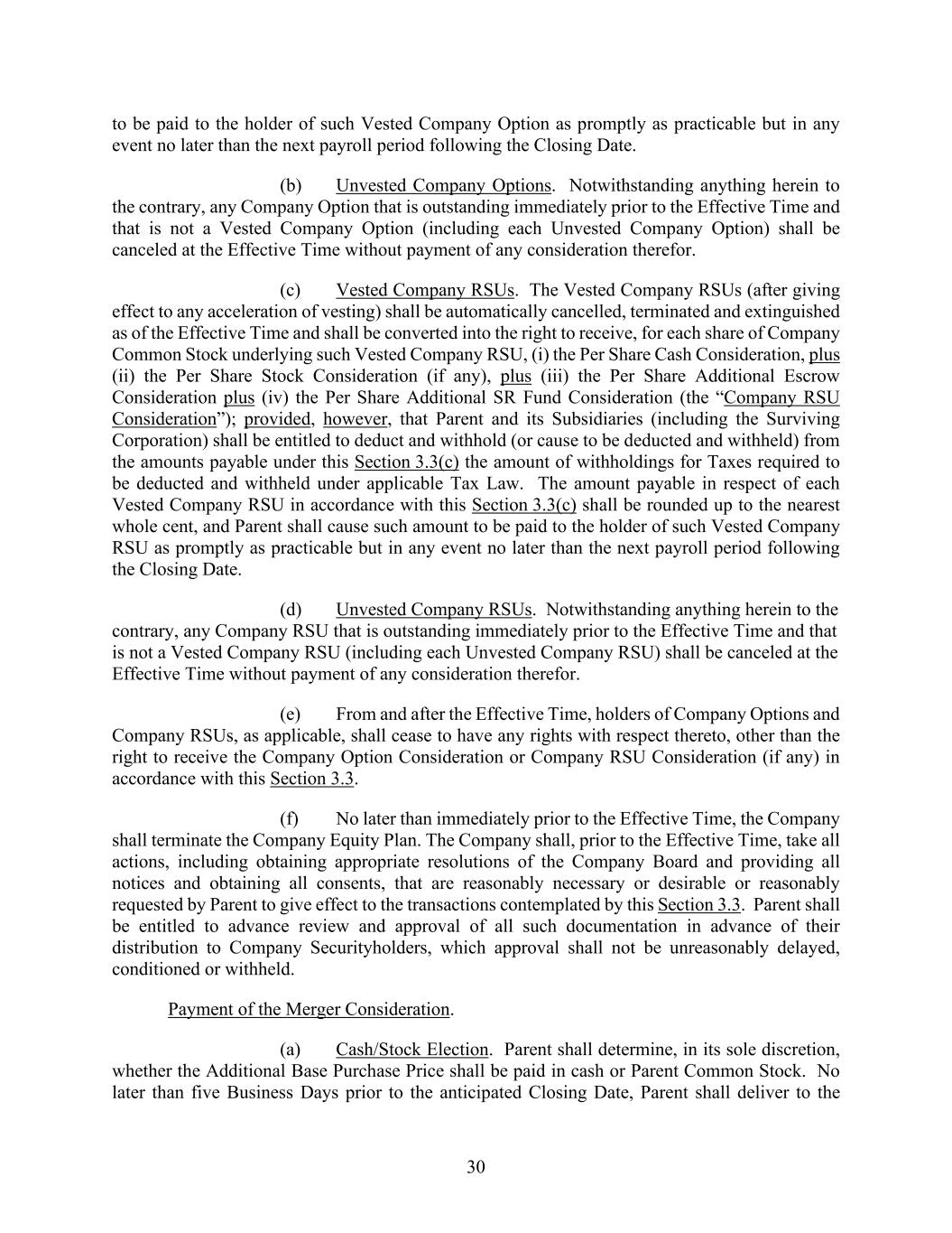 30 to be paid to the holder of such Vested Company Option as promptly as practicable but in any event no later than the next payroll period following the Closing Date. (b) Unvested Company Options. Notwithstanding anything herein to the contrary, any Company Option that is outstanding immediately prior to the Effective Time and that is not a Vested Company Option (including each Unvested Company Option) shall be canceled at the Effective Time without payment of any consideration therefor. (c) Vested Company RSUs. The Vested Company RSUs (after giving effect to any acceleration of vesting) shall be automatically cancelled, terminated and extinguished as of the Effective Time and shall be converted into the right to receive, for each share of Company Common Stock underlying such Vested Company RSU, (i) the Per Share Cash Consideration, plus (ii) the Per Share Stock Consideration (if any), plus (iii) the Per Share Additional Escrow Consideration plus (iv) the Per Share Additional SR Fund Consideration (the “Company RSU Consideration”); provided, however, that Parent and its Subsidiaries (including the Surviving Corporation) shall be entitled to deduct and withhold (or cause to be deducted and withheld) from the amounts payable under this Section 3.3(c) the amount of withholdings for Taxes required to be deducted and withheld under applicable Tax Law. The amount payable in respect of each Vested Company RSU in accordance with this Section 3.3(c) shall be rounded up to the nearest whole cent, and Parent shall cause such amount to be paid to the holder of such Vested Company RSU as promptly as practicable but in any event no later than the next payroll period following the Closing Date. (d) Unvested Company RSUs. Notwithstanding anything herein to the contrary, any Company RSU that is outstanding immediately prior to the Effective Time and that is not a Vested Company RSU (including each Unvested Company RSU) shall be canceled at the Effective Time without payment of any consideration therefor. (e) From and after the Effective Time, holders of Company Options and Company RSUs, as applicable, shall cease to have any rights with respect thereto, other than the right to receive the Company Option Consideration or Company RSU Consideration (if any) in accordance with this Section 3.3. (f) No later than immediately prior to the Effective Time, the Company shall terminate the Company Equity Plan. The Company shall, prior to the Effective Time, take all actions, including obtaining appropriate resolutions of the Company Board and providing all notices and obtaining all consents, that are reasonably necessary or desirable or reasonably requested by Parent to give effect to the transactions contemplated by this Section 3.3. Parent shall be entitled to advance review and approval of all such documentation in advance of their distribution to Company Securityholders, which approval shall not be unreasonably delayed, conditioned or withheld. Payment of the Merger Consideration. (a) Cash/Stock Election. Parent shall determine, in its sole discretion, whether the Additional Base Purchase Price shall be paid in cash or Parent Common Stock. No later than five Business Days prior to the anticipated Closing Date, Parent shall deliver to the