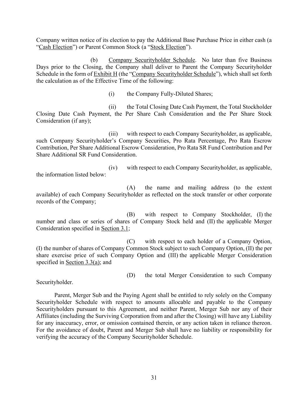 31 Company written notice of its election to pay the Additional Base Purchase Price in either cash (a “Cash Election”) or Parent Common Stock (a “Stock Election”). (b) Company Securityholder Schedule. No later than five Business Days prior to the Closing, the Company shall deliver to Parent the Company Securityholder Schedule in the form of Exhibit H (the “Company Securityholder Schedule”), which shall set forth the calculation as of the Effective Time of the following: (i) the Company Fully-Diluted Shares; (ii) the Total Closing Date Cash Payment, the Total Stockholder Closing Date Cash Payment, the Per Share Cash Consideration and the Per Share Stock Consideration (if any); (iii) with respect to each Company Securityholder, as applicable, such Company Securityholder’s Company Securities, Pro Rata Percentage, Pro Rata Escrow Contribution, Per Share Additional Escrow Consideration, Pro Rata SR Fund Contribution and Per Share Additional SR Fund Consideration. (iv) with respect to each Company Securityholder, as applicable, the information listed below: (A) the name and mailing address (to the extent available) of each Company Securityholder as reflected on the stock transfer or other corporate records of the Company; (B) with respect to Company Stockholder, (I) the number and class or series of shares of Company Stock held and (II) the applicable Merger Consideration specified in Section 3.1; (C) with respect to each holder of a Company Option, (I) the number of shares of Company Common Stock subject to such Company Option, (II) the per share exercise price of such Company Option and (III) the applicable Merger Consideration specified in Section 3.3(a); and (D) the total Merger Consideration to such Company Securityholder. Parent, Merger Sub and the Paying Agent shall be entitled to rely solely on the Company Securityholder Schedule with respect to amounts allocable and payable to the Company Securityholders pursuant to this Agreement, and neither Parent, Merger Sub nor any of their Affiliates (including the Surviving Corporation from and after the Closing) will have any Liability for any inaccuracy, error, or omission contained therein, or any action taken in reliance thereon. For the avoidance of doubt, Parent and Merger Sub shall have no liability or responsibility for verifying the accuracy of the Company Securityholder Schedule.