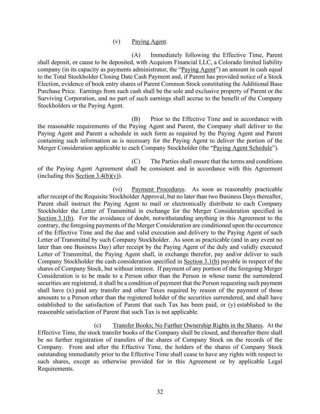32 (v) Paying Agent. (A) Immediately following the Effective Time, Parent shall deposit, or cause to be deposited, with Acquiom Financial LLC, a Colorado limited liability company (in its capacity as payments administrator, the “Paying Agent”) an amount in cash equal to the Total Stockholder Closing Date Cash Payment and, if Parent has provided notice of a Stock Election, evidence of book entry shares of Parent Common Stock constituting the Additional Base Purchase Price. Earnings from such cash shall be the sole and exclusive property of Parent or the Surviving Corporation, and no part of such earnings shall accrue to the benefit of the Company Stockholders or the Paying Agent. (B) Prior to the Effective Time and in accordance with the reasonable requirements of the Paying Agent and Parent, the Company shall deliver to the Paying Agent and Parent a schedule in such form as required by the Paying Agent and Parent containing such information as is necessary for the Paying Agent to deliver the portion of the Merger Consideration applicable to each Company Stockholder (the “Paying Agent Schedule”). (C) The Parties shall ensure that the terms and conditions of the Paying Agent Agreement shall be consistent and in accordance with this Agreement (including this Section 3.4(b)(v)). (vi) Payment Procedures. As soon as reasonably practicable after receipt of the Requisite Stockholder Approval, but no later than two Business Days thereafter, Parent shall instruct the Paying Agent to mail or electronically distribute to each Company Stockholder the Letter of Transmittal in exchange for the Merger Consideration specified in Section 3.1(b). For the avoidance of doubt, notwithstanding anything in this Agreement to the contrary, the foregoing payments of the Merger Consideration are conditioned upon the occurrence of the Effective Time and the due and valid execution and delivery to the Paying Agent of such Letter of Transmittal by such Company Stockholder. As soon as practicable (and in any event no later than one Business Day) after receipt by the Paying Agent of the duly and validly executed Letter of Transmittal, the Paying Agent shall, in exchange therefor, pay and/or deliver to such Company Stockholder the cash consideration specified in Section 3.1(b) payable in respect of the shares of Company Stock, but without interest. If payment of any portion of the foregoing Merger Consideration is to be made to a Person other than the Person in whose name the surrendered securities are registered, it shall be a condition of payment that the Person requesting such payment shall have (x) paid any transfer and other Taxes required by reason of the payment of those amounts to a Person other than the registered holder of the securities surrendered, and shall have established to the satisfaction of Parent that such Tax has been paid, or (y) established to the reasonable satisfaction of Parent that such Tax is not applicable. (c) Transfer Books; No Further Ownership Rights in the Shares. At the Effective Time, the stock transfer books of the Company shall be closed, and thereafter there shall be no further registration of transfers of the shares of Company Stock on the records of the Company. From and after the Effective Time, the holders of the shares of Company Stock outstanding immediately prior to the Effective Time shall cease to have any rights with respect to such shares, except as otherwise provided for in this Agreement or by applicable Legal Requirements.
