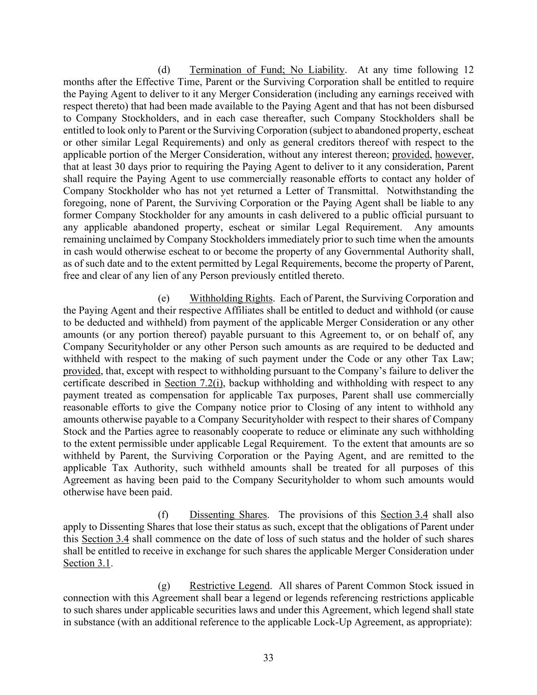 33 (d) Termination of Fund; No Liability. At any time following 12 months after the Effective Time, Parent or the Surviving Corporation shall be entitled to require the Paying Agent to deliver to it any Merger Consideration (including any earnings received with respect thereto) that had been made available to the Paying Agent and that has not been disbursed to Company Stockholders, and in each case thereafter, such Company Stockholders shall be entitled to look only to Parent or the Surviving Corporation (subject to abandoned property, escheat or other similar Legal Requirements) and only as general creditors thereof with respect to the applicable portion of the Merger Consideration, without any interest thereon; provided, however, that at least 30 days prior to requiring the Paying Agent to deliver to it any consideration, Parent shall require the Paying Agent to use commercially reasonable efforts to contact any holder of Company Stockholder who has not yet returned a Letter of Transmittal. Notwithstanding the foregoing, none of Parent, the Surviving Corporation or the Paying Agent shall be liable to any former Company Stockholder for any amounts in cash delivered to a public official pursuant to any applicable abandoned property, escheat or similar Legal Requirement. Any amounts remaining unclaimed by Company Stockholders immediately prior to such time when the amounts in cash would otherwise escheat to or become the property of any Governmental Authority shall, as of such date and to the extent permitted by Legal Requirements, become the property of Parent, free and clear of any lien of any Person previously entitled thereto. (e) Withholding Rights. Each of Parent, the Surviving Corporation and the Paying Agent and their respective Affiliates shall be entitled to deduct and withhold (or cause to be deducted and withheld) from payment of the applicable Merger Consideration or any other amounts (or any portion thereof) payable pursuant to this Agreement to, or on behalf of, any Company Securityholder or any other Person such amounts as are required to be deducted and withheld with respect to the making of such payment under the Code or any other Tax Law; provided, that, except with respect to withholding pursuant to the Company’s failure to deliver the certificate described in Section 7.2(i), backup withholding and withholding with respect to any payment treated as compensation for applicable Tax purposes, Parent shall use commercially reasonable efforts to give the Company notice prior to Closing of any intent to withhold any amounts otherwise payable to a Company Securityholder with respect to their shares of Company Stock and the Parties agree to reasonably cooperate to reduce or eliminate any such withholding to the extent permissible under applicable Legal Requirement. To the extent that amounts are so withheld by Parent, the Surviving Corporation or the Paying Agent, and are remitted to the applicable Tax Authority, such withheld amounts shall be treated for all purposes of this Agreement as having been paid to the Company Securityholder to whom such amounts would otherwise have been paid. (f) Dissenting Shares. The provisions of this Section 3.4 shall also apply to Dissenting Shares that lose their status as such, except that the obligations of Parent under this Section 3.4 shall commence on the date of loss of such status and the holder of such shares shall be entitled to receive in exchange for such shares the applicable Merger Consideration under Section 3.1. (g) Restrictive Legend. All shares of Parent Common Stock issued in connection with this Agreement shall bear a legend or legends referencing restrictions applicable to such shares under applicable securities laws and under this Agreement, which legend shall state in substance (with an additional reference to the applicable Lock-Up Agreement, as appropriate):