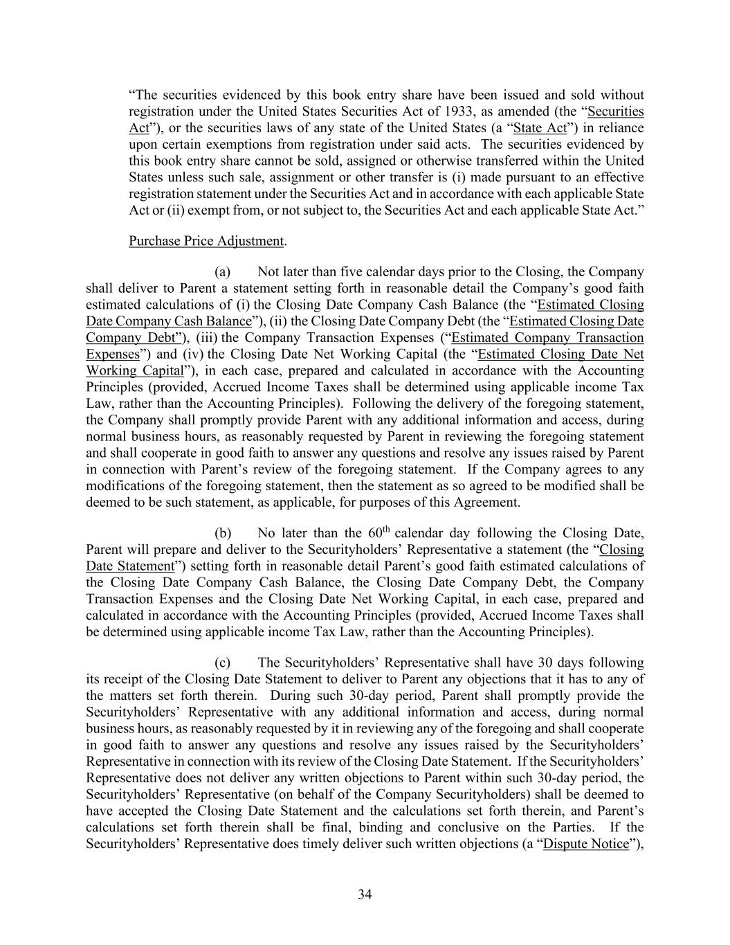 34 “The securities evidenced by this book entry share have been issued and sold without registration under the United States Securities Act of 1933, as amended (the “Securities Act”), or the securities laws of any state of the United States (a “State Act”) in reliance upon certain exemptions from registration under said acts. The securities evidenced by this book entry share cannot be sold, assigned or otherwise transferred within the United States unless such sale, assignment or other transfer is (i) made pursuant to an effective registration statement under the Securities Act and in accordance with each applicable State Act or (ii) exempt from, or not subject to, the Securities Act and each applicable State Act.” Purchase Price Adjustment. (a) Not later than five calendar days prior to the Closing, the Company shall deliver to Parent a statement setting forth in reasonable detail the Company’s good faith estimated calculations of (i) the Closing Date Company Cash Balance (the “Estimated Closing Date Company Cash Balance”), (ii) the Closing Date Company Debt (the “Estimated Closing Date Company Debt”), (iii) the Company Transaction Expenses (“Estimated Company Transaction Expenses”) and (iv) the Closing Date Net Working Capital (the “Estimated Closing Date Net Working Capital”), in each case, prepared and calculated in accordance with the Accounting Principles (provided, Accrued Income Taxes shall be determined using applicable income Tax Law, rather than the Accounting Principles). Following the delivery of the foregoing statement, the Company shall promptly provide Parent with any additional information and access, during normal business hours, as reasonably requested by Parent in reviewing the foregoing statement and shall cooperate in good faith to answer any questions and resolve any issues raised by Parent in connection with Parent’s review of the foregoing statement. If the Company agrees to any modifications of the foregoing statement, then the statement as so agreed to be modified shall be deemed to be such statement, as applicable, for purposes of this Agreement. (b) No later than the 60th calendar day following the Closing Date, Parent will prepare and deliver to the Securityholders’ Representative a statement (the “Closing Date Statement”) setting forth in reasonable detail Parent’s good faith estimated calculations of the Closing Date Company Cash Balance, the Closing Date Company Debt, the Company Transaction Expenses and the Closing Date Net Working Capital, in each case, prepared and calculated in accordance with the Accounting Principles (provided, Accrued Income Taxes shall be determined using applicable income Tax Law, rather than the Accounting Principles). (c) The Securityholders’ Representative shall have 30 days following its receipt of the Closing Date Statement to deliver to Parent any objections that it has to any of the matters set forth therein. During such 30-day period, Parent shall promptly provide the Securityholders’ Representative with any additional information and access, during normal business hours, as reasonably requested by it in reviewing any of the foregoing and shall cooperate in good faith to answer any questions and resolve any issues raised by the Securityholders’ Representative in connection with its review of the Closing Date Statement. If the Securityholders’ Representative does not deliver any written objections to Parent within such 30-day period, the Securityholders’ Representative (on behalf of the Company Securityholders) shall be deemed to have accepted the Closing Date Statement and the calculations set forth therein, and Parent’s calculations set forth therein shall be final, binding and conclusive on the Parties. If the Securityholders’ Representative does timely deliver such written objections (a “Dispute Notice”),