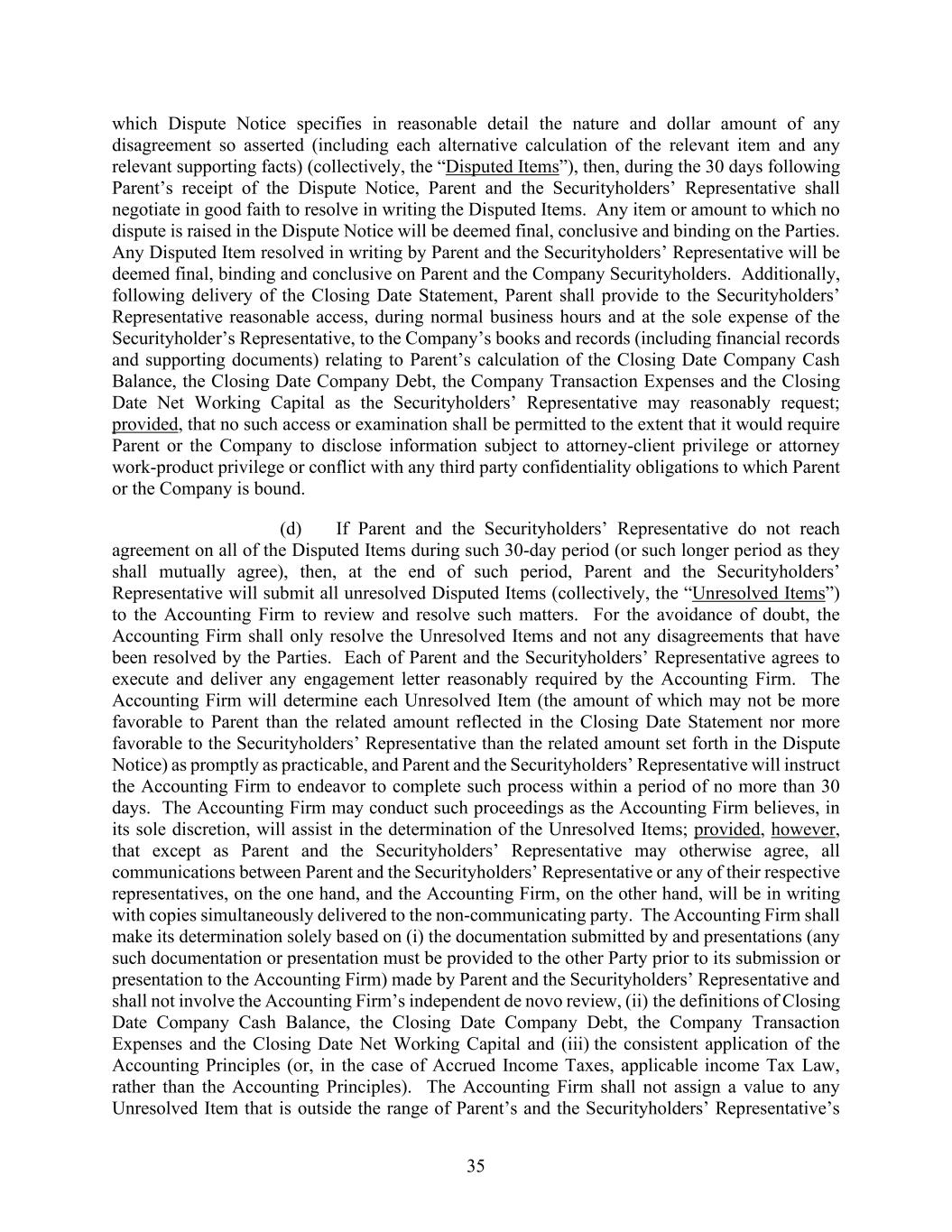 35 which Dispute Notice specifies in reasonable detail the nature and dollar amount of any disagreement so asserted (including each alternative calculation of the relevant item and any relevant supporting facts) (collectively, the “Disputed Items”), then, during the 30 days following Parent’s receipt of the Dispute Notice, Parent and the Securityholders’ Representative shall negotiate in good faith to resolve in writing the Disputed Items. Any item or amount to which no dispute is raised in the Dispute Notice will be deemed final, conclusive and binding on the Parties. Any Disputed Item resolved in writing by Parent and the Securityholders’ Representative will be deemed final, binding and conclusive on Parent and the Company Securityholders. Additionally, following delivery of the Closing Date Statement, Parent shall provide to the Securityholders’ Representative reasonable access, during normal business hours and at the sole expense of the Securityholder’s Representative, to the Company’s books and records (including financial records and supporting documents) relating to Parent’s calculation of the Closing Date Company Cash Balance, the Closing Date Company Debt, the Company Transaction Expenses and the Closing Date Net Working Capital as the Securityholders’ Representative may reasonably request; provided, that no such access or examination shall be permitted to the extent that it would require Parent or the Company to disclose information subject to attorney-client privilege or attorney work-product privilege or conflict with any third party confidentiality obligations to which Parent or the Company is bound. (d) If Parent and the Securityholders’ Representative do not reach agreement on all of the Disputed Items during such 30-day period (or such longer period as they shall mutually agree), then, at the end of such period, Parent and the Securityholders’ Representative will submit all unresolved Disputed Items (collectively, the “Unresolved Items”) to the Accounting Firm to review and resolve such matters. For the avoidance of doubt, the Accounting Firm shall only resolve the Unresolved Items and not any disagreements that have been resolved by the Parties. Each of Parent and the Securityholders’ Representative agrees to execute and deliver any engagement letter reasonably required by the Accounting Firm. The Accounting Firm will determine each Unresolved Item (the amount of which may not be more favorable to Parent than the related amount reflected in the Closing Date Statement nor more favorable to the Securityholders’ Representative than the related amount set forth in the Dispute Notice) as promptly as practicable, and Parent and the Securityholders’ Representative will instruct the Accounting Firm to endeavor to complete such process within a period of no more than 30 days. The Accounting Firm may conduct such proceedings as the Accounting Firm believes, in its sole discretion, will assist in the determination of the Unresolved Items; provided, however, that except as Parent and the Securityholders’ Representative may otherwise agree, all communications between Parent and the Securityholders’ Representative or any of their respective representatives, on the one hand, and the Accounting Firm, on the other hand, will be in writing with copies simultaneously delivered to the non-communicating party. The Accounting Firm shall make its determination solely based on (i) the documentation submitted by and presentations (any such documentation or presentation must be provided to the other Party prior to its submission or presentation to the Accounting Firm) made by Parent and the Securityholders’ Representative and shall not involve the Accounting Firm’s independent de novo review, (ii) the definitions of Closing Date Company Cash Balance, the Closing Date Company Debt, the Company Transaction Expenses and the Closing Date Net Working Capital and (iii) the consistent application of the Accounting Principles (or, in the case of Accrued Income Taxes, applicable income Tax Law, rather than the Accounting Principles). The Accounting Firm shall not assign a value to any Unresolved Item that is outside the range of Parent’s and the Securityholders’ Representative’s