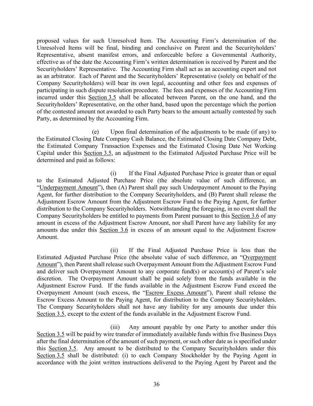 36 proposed values for such Unresolved Item. The Accounting Firm’s determination of the Unresolved Items will be final, binding and conclusive on Parent and the Securityholders’ Representative, absent manifest errors, and enforceable before a Governmental Authority, effective as of the date the Accounting Firm’s written determination is received by Parent and the Securityholders’ Representative. The Accounting Firm shall act as an accounting expert and not as an arbitrator. Each of Parent and the Securityholders’ Representative (solely on behalf of the Company Securityholders) will bear its own legal, accounting and other fees and expenses of participating in such dispute resolution procedure. The fees and expenses of the Accounting Firm incurred under this Section 3.5 shall be allocated between Parent, on the one hand, and the Securityholders’ Representative, on the other hand, based upon the percentage which the portion of the contested amount not awarded to each Party bears to the amount actually contested by such Party, as determined by the Accounting Firm. (e) Upon final determination of the adjustments to be made (if any) to the Estimated Closing Date Company Cash Balance, the Estimated Closing Date Company Debt, the Estimated Company Transaction Expenses and the Estimated Closing Date Net Working Capital under this Section 3.5, an adjustment to the Estimated Adjusted Purchase Price will be determined and paid as follows: (i) If the Final Adjusted Purchase Price is greater than or equal to the Estimated Adjusted Purchase Price (the absolute value of such difference, an “Underpayment Amount”), then (A) Parent shall pay such Underpayment Amount to the Paying Agent, for further distribution to the Company Securityholders, and (B) Parent shall release the Adjustment Escrow Amount from the Adjustment Escrow Fund to the Paying Agent, for further distribution to the Company Securityholders. Notwithstanding the foregoing, in no event shall the Company Securityholders be entitled to payments from Parent pursuant to this Section 3.6 of any amount in excess of the Adjustment Escrow Amount, nor shall Parent have any liability for any amounts due under this Section 3.6 in excess of an amount equal to the Adjustment Escrow Amount. (ii) If the Final Adjusted Purchase Price is less than the Estimated Adjusted Purchase Price (the absolute value of such difference, an “Overpayment Amount”), then Parent shall release such Overpayment Amount from the Adjustment Escrow Fund and deliver such Overpayment Amount to any corporate fund(s) or account(s) of Parent’s sole discretion. The Overpayment Amount shall be paid solely from the funds available in the Adjustment Escrow Fund. If the funds available in the Adjustment Escrow Fund exceed the Overpayment Amount (such excess, the “Escrow Excess Amount”), Parent shall release the Escrow Excess Amount to the Paying Agent, for distribution to the Company Securityholders. The Company Securityholders shall not have any liability for any amounts due under this Section 3.5, except to the extent of the funds available in the Adjustment Escrow Fund. (iii) Any amount payable by one Party to another under this Section 3.5 will be paid by wire transfer of immediately available funds within five Business Days after the final determination of the amount of such payment, or such other date as is specified under this Section 3.5. Any amount to be distributed to the Company Securityholders under this Section 3.5 shall be distributed: (i) to each Company Stockholder by the Paying Agent in accordance with the joint written instructions delivered to the Paying Agent by Parent and the