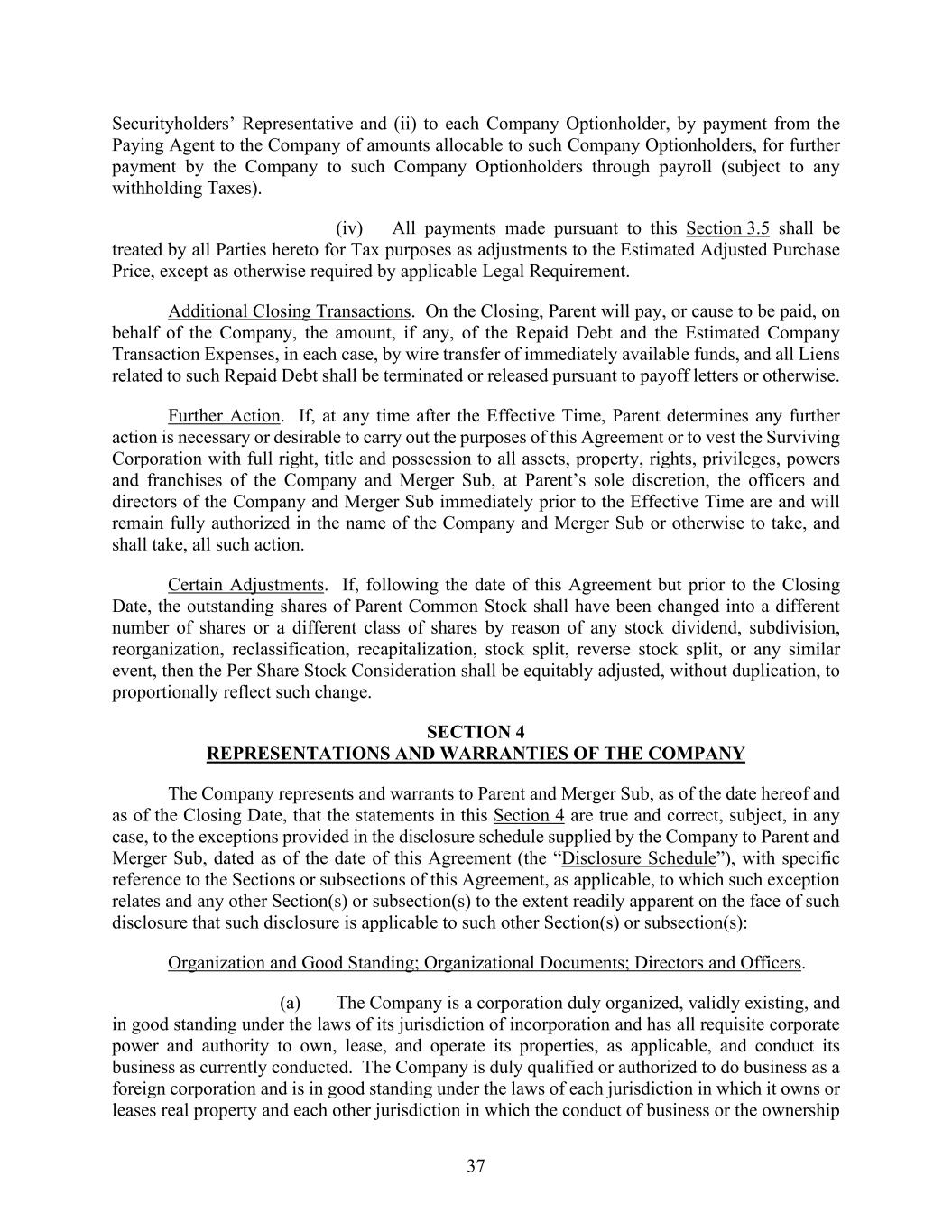 37 Securityholders’ Representative and (ii) to each Company Optionholder, by payment from the Paying Agent to the Company of amounts allocable to such Company Optionholders, for further payment by the Company to such Company Optionholders through payroll (subject to any withholding Taxes). (iv) All payments made pursuant to this Section 3.5 shall be treated by all Parties hereto for Tax purposes as adjustments to the Estimated Adjusted Purchase Price, except as otherwise required by applicable Legal Requirement. Additional Closing Transactions. On the Closing, Parent will pay, or cause to be paid, on behalf of the Company, the amount, if any, of the Repaid Debt and the Estimated Company Transaction Expenses, in each case, by wire transfer of immediately available funds, and all Liens related to such Repaid Debt shall be terminated or released pursuant to payoff letters or otherwise. Further Action. If, at any time after the Effective Time, Parent determines any further action is necessary or desirable to carry out the purposes of this Agreement or to vest the Surviving Corporation with full right, title and possession to all assets, property, rights, privileges, powers and franchises of the Company and Merger Sub, at Parent’s sole discretion, the officers and directors of the Company and Merger Sub immediately prior to the Effective Time are and will remain fully authorized in the name of the Company and Merger Sub or otherwise to take, and shall take, all such action. Certain Adjustments. If, following the date of this Agreement but prior to the Closing Date, the outstanding shares of Parent Common Stock shall have been changed into a different number of shares or a different class of shares by reason of any stock dividend, subdivision, reorganization, reclassification, recapitalization, stock split, reverse stock split, or any similar event, then the Per Share Stock Consideration shall be equitably adjusted, without duplication, to proportionally reflect such change. SECTION 4 REPRESENTATIONS AND WARRANTIES OF THE COMPANY The Company represents and warrants to Parent and Merger Sub, as of the date hereof and as of the Closing Date, that the statements in this Section 4 are true and correct, subject, in any case, to the exceptions provided in the disclosure schedule supplied by the Company to Parent and Merger Sub, dated as of the date of this Agreement (the “Disclosure Schedule”), with specific reference to the Sections or subsections of this Agreement, as applicable, to which such exception relates and any other Section(s) or subsection(s) to the extent readily apparent on the face of such disclosure that such disclosure is applicable to such other Section(s) or subsection(s): Organization and Good Standing; Organizational Documents; Directors and Officers. (a) The Company is a corporation duly organized, validly existing, and in good standing under the laws of its jurisdiction of incorporation and has all requisite corporate power and authority to own, lease, and operate its properties, as applicable, and conduct its business as currently conducted. The Company is duly qualified or authorized to do business as a foreign corporation and is in good standing under the laws of each jurisdiction in which it owns or leases real property and each other jurisdiction in which the conduct of business or the ownership