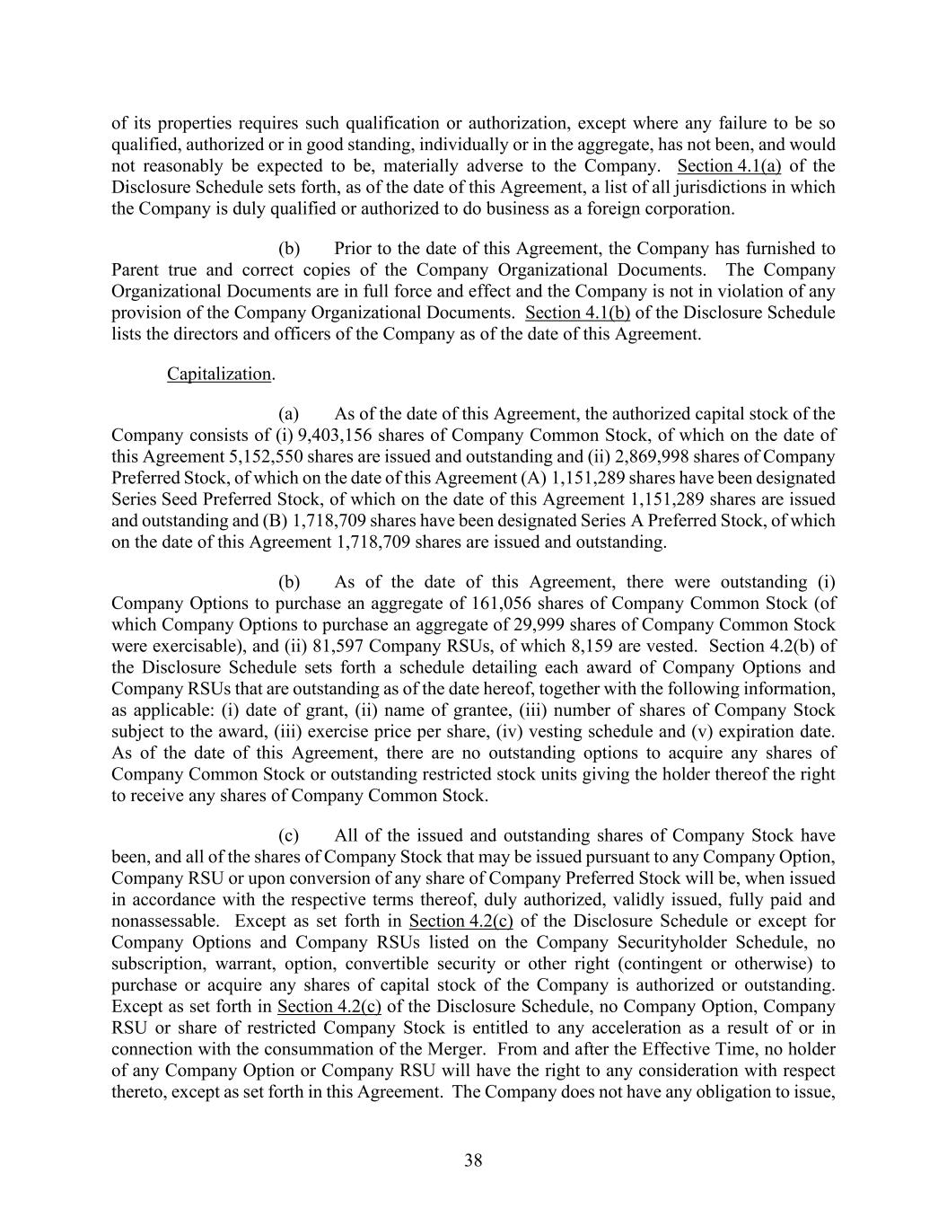 38 of its properties requires such qualification or authorization, except where any failure to be so qualified, authorized or in good standing, individually or in the aggregate, has not been, and would not reasonably be expected to be, materially adverse to the Company. Section 4.1(a) of the Disclosure Schedule sets forth, as of the date of this Agreement, a list of all jurisdictions in which the Company is duly qualified or authorized to do business as a foreign corporation. (b) Prior to the date of this Agreement, the Company has furnished to Parent true and correct copies of the Company Organizational Documents. The Company Organizational Documents are in full force and effect and the Company is not in violation of any provision of the Company Organizational Documents. Section 4.1(b) of the Disclosure Schedule lists the directors and officers of the Company as of the date of this Agreement. Capitalization. (a) As of the date of this Agreement, the authorized capital stock of the Company consists of (i) 9,403,156 shares of Company Common Stock, of which on the date of this Agreement 5,152,550 shares are issued and outstanding and (ii) 2,869,998 shares of Company Preferred Stock, of which on the date of this Agreement (A) 1,151,289 shares have been designated Series Seed Preferred Stock, of which on the date of this Agreement 1,151,289 shares are issued and outstanding and (B) 1,718,709 shares have been designated Series A Preferred Stock, of which on the date of this Agreement 1,718,709 shares are issued and outstanding. (b) As of the date of this Agreement, there were outstanding (i) Company Options to purchase an aggregate of 161,056 shares of Company Common Stock (of which Company Options to purchase an aggregate of 29,999 shares of Company Common Stock were exercisable), and (ii) 81,597 Company RSUs, of which 8,159 are vested. Section 4.2(b) of the Disclosure Schedule sets forth a schedule detailing each award of Company Options and Company RSUs that are outstanding as of the date hereof, together with the following information, as applicable: (i) date of grant, (ii) name of grantee, (iii) number of shares of Company Stock subject to the award, (iii) exercise price per share, (iv) vesting schedule and (v) expiration date. As of the date of this Agreement, there are no outstanding options to acquire any shares of Company Common Stock or outstanding restricted stock units giving the holder thereof the right to receive any shares of Company Common Stock. (c) All of the issued and outstanding shares of Company Stock have been, and all of the shares of Company Stock that may be issued pursuant to any Company Option, Company RSU or upon conversion of any share of Company Preferred Stock will be, when issued in accordance with the respective terms thereof, duly authorized, validly issued, fully paid and nonassessable. Except as set forth in Section 4.2(c) of the Disclosure Schedule or except for Company Options and Company RSUs listed on the Company Securityholder Schedule, no subscription, warrant, option, convertible security or other right (contingent or otherwise) to purchase or acquire any shares of capital stock of the Company is authorized or outstanding. Except as set forth in Section 4.2(c) of the Disclosure Schedule, no Company Option, Company RSU or share of restricted Company Stock is entitled to any acceleration as a result of or in connection with the consummation of the Merger. From and after the Effective Time, no holder of any Company Option or Company RSU will have the right to any consideration with respect thereto, except as set forth in this Agreement. The Company does not have any obligation to issue,