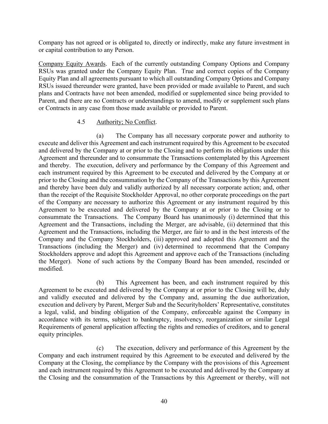 40 Company has not agreed or is obligated to, directly or indirectly, make any future investment in or capital contribution to any Person. Company Equity Awards. Each of the currently outstanding Company Options and Company RSUs was granted under the Company Equity Plan. True and correct copies of the Company Equity Plan and all agreements pursuant to which all outstanding Company Options and Company RSUs issued thereunder were granted, have been provided or made available to Parent, and such plans and Contracts have not been amended, modified or supplemented since being provided to Parent, and there are no Contracts or understandings to amend, modify or supplement such plans or Contracts in any case from those made available or provided to Parent. 4.5 Authority; No Conflict. (a) The Company has all necessary corporate power and authority to execute and deliver this Agreement and each instrument required by this Agreement to be executed and delivered by the Company at or prior to the Closing and to perform its obligations under this Agreement and thereunder and to consummate the Transactions contemplated by this Agreement and thereby. The execution, delivery and performance by the Company of this Agreement and each instrument required by this Agreement to be executed and delivered by the Company at or prior to the Closing and the consummation by the Company of the Transactions by this Agreement and thereby have been duly and validly authorized by all necessary corporate action; and, other than the receipt of the Requisite Stockholder Approval, no other corporate proceedings on the part of the Company are necessary to authorize this Agreement or any instrument required by this Agreement to be executed and delivered by the Company at or prior to the Closing or to consummate the Transactions. The Company Board has unanimously (i) determined that this Agreement and the Transactions, including the Merger, are advisable, (ii) determined that this Agreement and the Transactions, including the Merger, are fair to and in the best interests of the Company and the Company Stockholders, (iii) approved and adopted this Agreement and the Transactions (including the Merger) and (iv) determined to recommend that the Company Stockholders approve and adopt this Agreement and approve each of the Transactions (including the Merger). None of such actions by the Company Board has been amended, rescinded or modified. (b) This Agreement has been, and each instrument required by this Agreement to be executed and delivered by the Company at or prior to the Closing will be, duly and validly executed and delivered by the Company and, assuming the due authorization, execution and delivery by Parent, Merger Sub and the Securityholders’ Representative, constitutes a legal, valid, and binding obligation of the Company, enforceable against the Company in accordance with its terms, subject to bankruptcy, insolvency, reorganization or similar Legal Requirements of general application affecting the rights and remedies of creditors, and to general equity principles. (c) The execution, delivery and performance of this Agreement by the Company and each instrument required by this Agreement to be executed and delivered by the Company at the Closing, the compliance by the Company with the provisions of this Agreement and each instrument required by this Agreement to be executed and delivered by the Company at the Closing and the consummation of the Transactions by this Agreement or thereby, will not