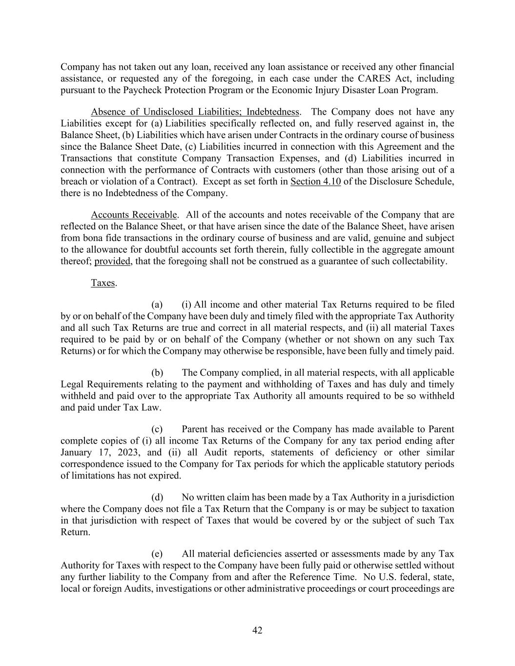 42 Company has not taken out any loan, received any loan assistance or received any other financial assistance, or requested any of the foregoing, in each case under the CARES Act, including pursuant to the Paycheck Protection Program or the Economic Injury Disaster Loan Program. Absence of Undisclosed Liabilities; Indebtedness. The Company does not have any Liabilities except for (a) Liabilities specifically reflected on, and fully reserved against in, the Balance Sheet, (b) Liabilities which have arisen under Contracts in the ordinary course of business since the Balance Sheet Date, (c) Liabilities incurred in connection with this Agreement and the Transactions that constitute Company Transaction Expenses, and (d) Liabilities incurred in connection with the performance of Contracts with customers (other than those arising out of a breach or violation of a Contract). Except as set forth in Section 4.10 of the Disclosure Schedule, there is no Indebtedness of the Company. Accounts Receivable. All of the accounts and notes receivable of the Company that are reflected on the Balance Sheet, or that have arisen since the date of the Balance Sheet, have arisen from bona fide transactions in the ordinary course of business and are valid, genuine and subject to the allowance for doubtful accounts set forth therein, fully collectible in the aggregate amount thereof; provided, that the foregoing shall not be construed as a guarantee of such collectability. Taxes. (a) (i) All income and other material Tax Returns required to be filed by or on behalf of the Company have been duly and timely filed with the appropriate Tax Authority and all such Tax Returns are true and correct in all material respects, and (ii) all material Taxes required to be paid by or on behalf of the Company (whether or not shown on any such Tax Returns) or for which the Company may otherwise be responsible, have been fully and timely paid. (b) The Company complied, in all material respects, with all applicable Legal Requirements relating to the payment and withholding of Taxes and has duly and timely withheld and paid over to the appropriate Tax Authority all amounts required to be so withheld and paid under Tax Law. (c) Parent has received or the Company has made available to Parent complete copies of (i) all income Tax Returns of the Company for any tax period ending after January 17, 2023, and (ii) all Audit reports, statements of deficiency or other similar correspondence issued to the Company for Tax periods for which the applicable statutory periods of limitations has not expired. (d) No written claim has been made by a Tax Authority in a jurisdiction where the Company does not file a Tax Return that the Company is or may be subject to taxation in that jurisdiction with respect of Taxes that would be covered by or the subject of such Tax Return. (e) All material deficiencies asserted or assessments made by any Tax Authority for Taxes with respect to the Company have been fully paid or otherwise settled without any further liability to the Company from and after the Reference Time. No U.S. federal, state, local or foreign Audits, investigations or other administrative proceedings or court proceedings are