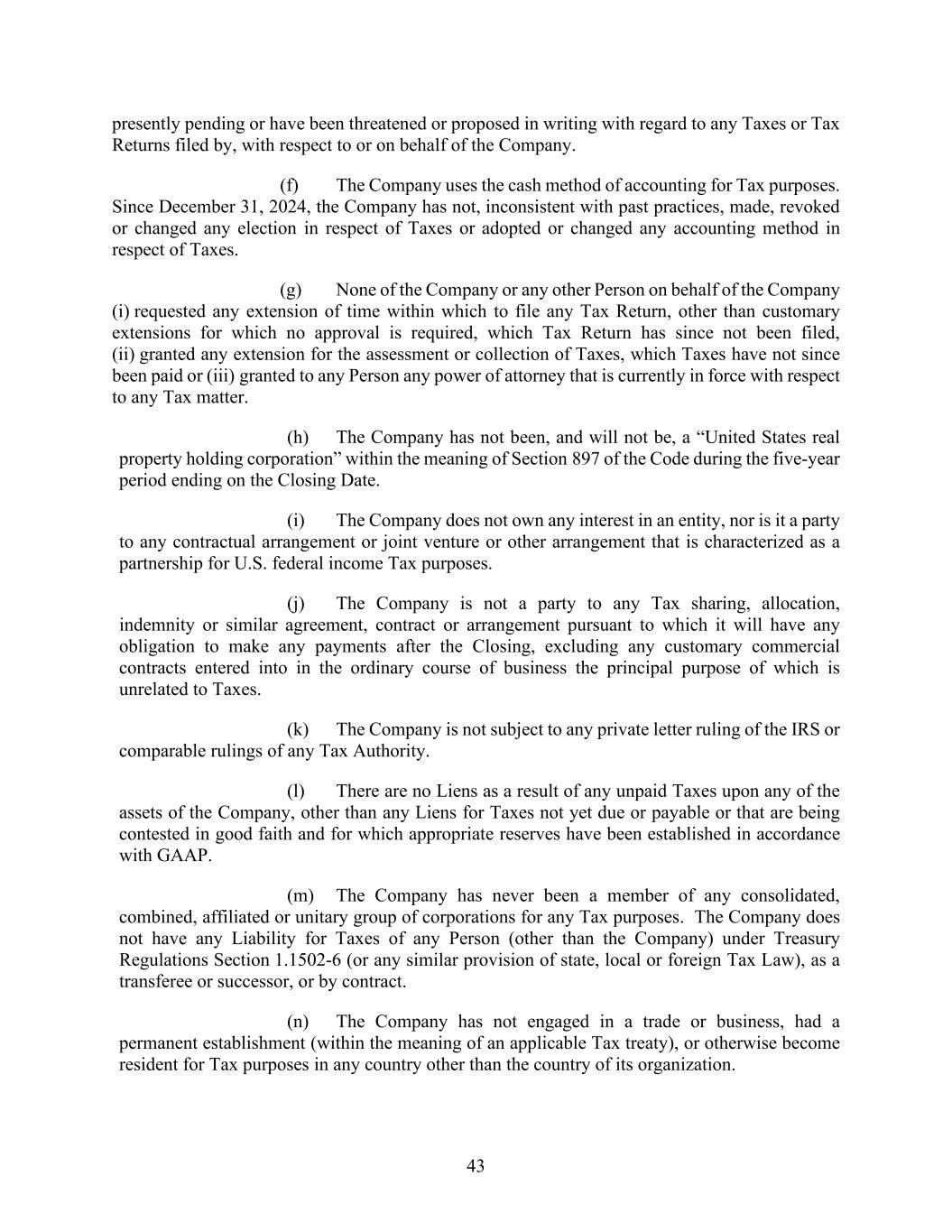43 presently pending or have been threatened or proposed in writing with regard to any Taxes or Tax Returns filed by, with respect to or on behalf of the Company. (f) The Company uses the cash method of accounting for Tax purposes. Since December 31, 2024, the Company has not, inconsistent with past practices, made, revoked or changed any election in respect of Taxes or adopted or changed any accounting method in respect of Taxes. (g) None of the Company or any other Person on behalf of the Company (i) requested any extension of time within which to file any Tax Return, other than customary extensions for which no approval is required, which Tax Return has since not been filed, (ii) granted any extension for the assessment or collection of Taxes, which Taxes have not since been paid or (iii) granted to any Person any power of attorney that is currently in force with respect to any Tax matter. (h) The Company has not been, and will not be, a “United States real property holding corporation” within the meaning of Section 897 of the Code during the five-year period ending on the Closing Date. (i) The Company does not own any interest in an entity, nor is it a party to any contractual arrangement or joint venture or other arrangement that is characterized as a partnership for U.S. federal income Tax purposes. (j) The Company is not a party to any Tax sharing, allocation, indemnity or similar agreement, contract or arrangement pursuant to which it will have any obligation to make any payments after the Closing, excluding any customary commercial contracts entered into in the ordinary course of business the principal purpose of which is unrelated to Taxes. (k) The Company is not subject to any private letter ruling of the IRS or comparable rulings of any Tax Authority. (l) There are no Liens as a result of any unpaid Taxes upon any of the assets of the Company, other than any Liens for Taxes not yet due or payable or that are being contested in good faith and for which appropriate reserves have been established in accordance with GAAP. (m) The Company has never been a member of any consolidated, combined, affiliated or unitary group of corporations for any Tax purposes. The Company does not have any Liability for Taxes of any Person (other than the Company) under Treasury Regulations Section 1.1502-6 (or any similar provision of state, local or foreign Tax Law), as a transferee or successor, or by contract. (n) The Company has not engaged in a trade or business, had a permanent establishment (within the meaning of an applicable Tax treaty), or otherwise become resident for Tax purposes in any country other than the country of its organization.