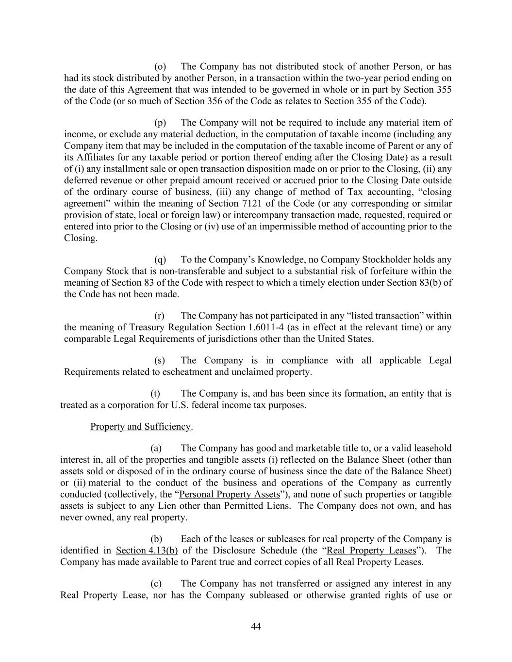 44 (o) The Company has not distributed stock of another Person, or has had its stock distributed by another Person, in a transaction within the two-year period ending on the date of this Agreement that was intended to be governed in whole or in part by Section 355 of the Code (or so much of Section 356 of the Code as relates to Section 355 of the Code). (p) The Company will not be required to include any material item of income, or exclude any material deduction, in the computation of taxable income (including any Company item that may be included in the computation of the taxable income of Parent or any of its Affiliates for any taxable period or portion thereof ending after the Closing Date) as a result of (i) any installment sale or open transaction disposition made on or prior to the Closing, (ii) any deferred revenue or other prepaid amount received or accrued prior to the Closing Date outside of the ordinary course of business, (iii) any change of method of Tax accounting, “closing agreement” within the meaning of Section 7121 of the Code (or any corresponding or similar provision of state, local or foreign law) or intercompany transaction made, requested, required or entered into prior to the Closing or (iv) use of an impermissible method of accounting prior to the Closing. (q) To the Company’s Knowledge, no Company Stockholder holds any Company Stock that is non-transferable and subject to a substantial risk of forfeiture within the meaning of Section 83 of the Code with respect to which a timely election under Section 83(b) of the Code has not been made. (r) The Company has not participated in any “listed transaction” within the meaning of Treasury Regulation Section 1.6011-4 (as in effect at the relevant time) or any comparable Legal Requirements of jurisdictions other than the United States. (s) The Company is in compliance with all applicable Legal Requirements related to escheatment and unclaimed property. (t) The Company is, and has been since its formation, an entity that is treated as a corporation for U.S. federal income tax purposes. Property and Sufficiency. (a) The Company has good and marketable title to, or a valid leasehold interest in, all of the properties and tangible assets (i) reflected on the Balance Sheet (other than assets sold or disposed of in the ordinary course of business since the date of the Balance Sheet) or (ii) material to the conduct of the business and operations of the Company as currently conducted (collectively, the “Personal Property Assets”), and none of such properties or tangible assets is subject to any Lien other than Permitted Liens. The Company does not own, and has never owned, any real property. (b) Each of the leases or subleases for real property of the Company is identified in Section 4.13(b) of the Disclosure Schedule (the “Real Property Leases”). The Company has made available to Parent true and correct copies of all Real Property Leases. (c) The Company has not transferred or assigned any interest in any Real Property Lease, nor has the Company subleased or otherwise granted rights of use or