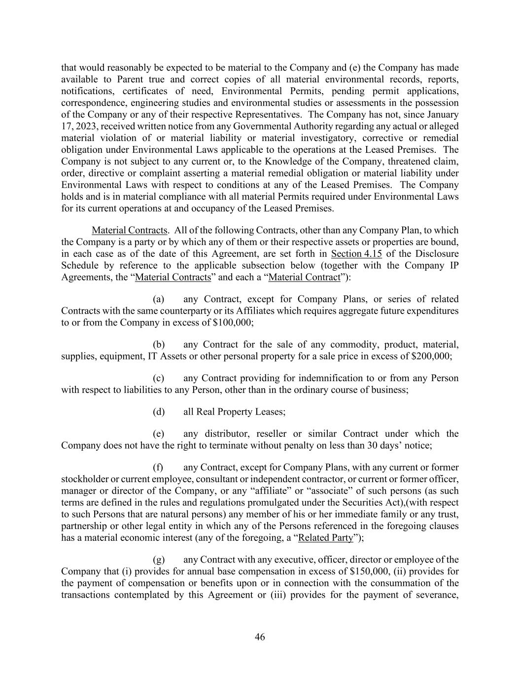 46 that would reasonably be expected to be material to the Company and (e) the Company has made available to Parent true and correct copies of all material environmental records, reports, notifications, certificates of need, Environmental Permits, pending permit applications, correspondence, engineering studies and environmental studies or assessments in the possession of the Company or any of their respective Representatives. The Company has not, since January 17, 2023, received written notice from any Governmental Authority regarding any actual or alleged material violation of or material liability or material investigatory, corrective or remedial obligation under Environmental Laws applicable to the operations at the Leased Premises. The Company is not subject to any current or, to the Knowledge of the Company, threatened claim, order, directive or complaint asserting a material remedial obligation or material liability under Environmental Laws with respect to conditions at any of the Leased Premises. The Company holds and is in material compliance with all material Permits required under Environmental Laws for its current operations at and occupancy of the Leased Premises. Material Contracts. All of the following Contracts, other than any Company Plan, to which the Company is a party or by which any of them or their respective assets or properties are bound, in each case as of the date of this Agreement, are set forth in Section 4.15 of the Disclosure Schedule by reference to the applicable subsection below (together with the Company IP Agreements, the “Material Contracts” and each a “Material Contract”): (a) any Contract, except for Company Plans, or series of related Contracts with the same counterparty or its Affiliates which requires aggregate future expenditures to or from the Company in excess of $100,000; (b) any Contract for the sale of any commodity, product, material, supplies, equipment, IT Assets or other personal property for a sale price in excess of $200,000; (c) any Contract providing for indemnification to or from any Person with respect to liabilities to any Person, other than in the ordinary course of business; (d) all Real Property Leases; (e) any distributor, reseller or similar Contract under which the Company does not have the right to terminate without penalty on less than 30 days’ notice; (f) any Contract, except for Company Plans, with any current or former stockholder or current employee, consultant or independent contractor, or current or former officer, manager or director of the Company, or any “affiliate” or “associate” of such persons (as such terms are defined in the rules and regulations promulgated under the Securities Act),(with respect to such Persons that are natural persons) any member of his or her immediate family or any trust, partnership or other legal entity in which any of the Persons referenced in the foregoing clauses has a material economic interest (any of the foregoing, a “Related Party”); (g) any Contract with any executive, officer, director or employee of the Company that (i) provides for annual base compensation in excess of $150,000, (ii) provides for the payment of compensation or benefits upon or in connection with the consummation of the transactions contemplated by this Agreement or (iii) provides for the payment of severance,