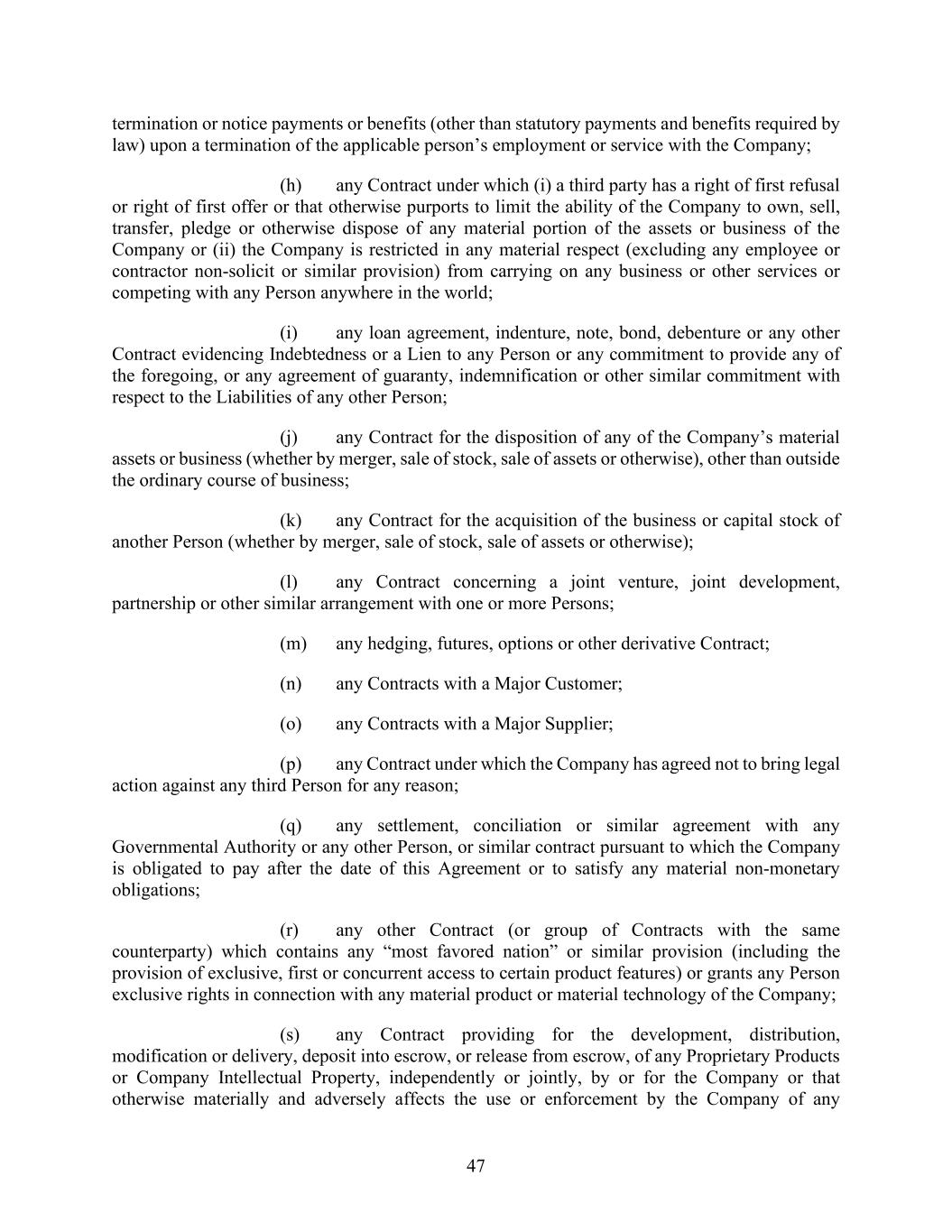 47 termination or notice payments or benefits (other than statutory payments and benefits required by law) upon a termination of the applicable person’s employment or service with the Company; (h) any Contract under which (i) a third party has a right of first refusal or right of first offer or that otherwise purports to limit the ability of the Company to own, sell, transfer, pledge or otherwise dispose of any material portion of the assets or business of the Company or (ii) the Company is restricted in any material respect (excluding any employee or contractor non-solicit or similar provision) from carrying on any business or other services or competing with any Person anywhere in the world; (i) any loan agreement, indenture, note, bond, debenture or any other Contract evidencing Indebtedness or a Lien to any Person or any commitment to provide any of the foregoing, or any agreement of guaranty, indemnification or other similar commitment with respect to the Liabilities of any other Person; (j) any Contract for the disposition of any of the Company’s material assets or business (whether by merger, sale of stock, sale of assets or otherwise), other than outside the ordinary course of business; (k) any Contract for the acquisition of the business or capital stock of another Person (whether by merger, sale of stock, sale of assets or otherwise); (l) any Contract concerning a joint venture, joint development, partnership or other similar arrangement with one or more Persons; (m) any hedging, futures, options or other derivative Contract; (n) any Contracts with a Major Customer; (o) any Contracts with a Major Supplier; (p) any Contract under which the Company has agreed not to bring legal action against any third Person for any reason; (q) any settlement, conciliation or similar agreement with any Governmental Authority or any other Person, or similar contract pursuant to which the Company is obligated to pay after the date of this Agreement or to satisfy any material non-monetary obligations; (r) any other Contract (or group of Contracts with the same counterparty) which contains any “most favored nation” or similar provision (including the provision of exclusive, first or concurrent access to certain product features) or grants any Person exclusive rights in connection with any material product or material technology of the Company; (s) any Contract providing for the development, distribution, modification or delivery, deposit into escrow, or release from escrow, of any Proprietary Products or Company Intellectual Property, independently or jointly, by or for the Company or that otherwise materially and adversely affects the use or enforcement by the Company of any