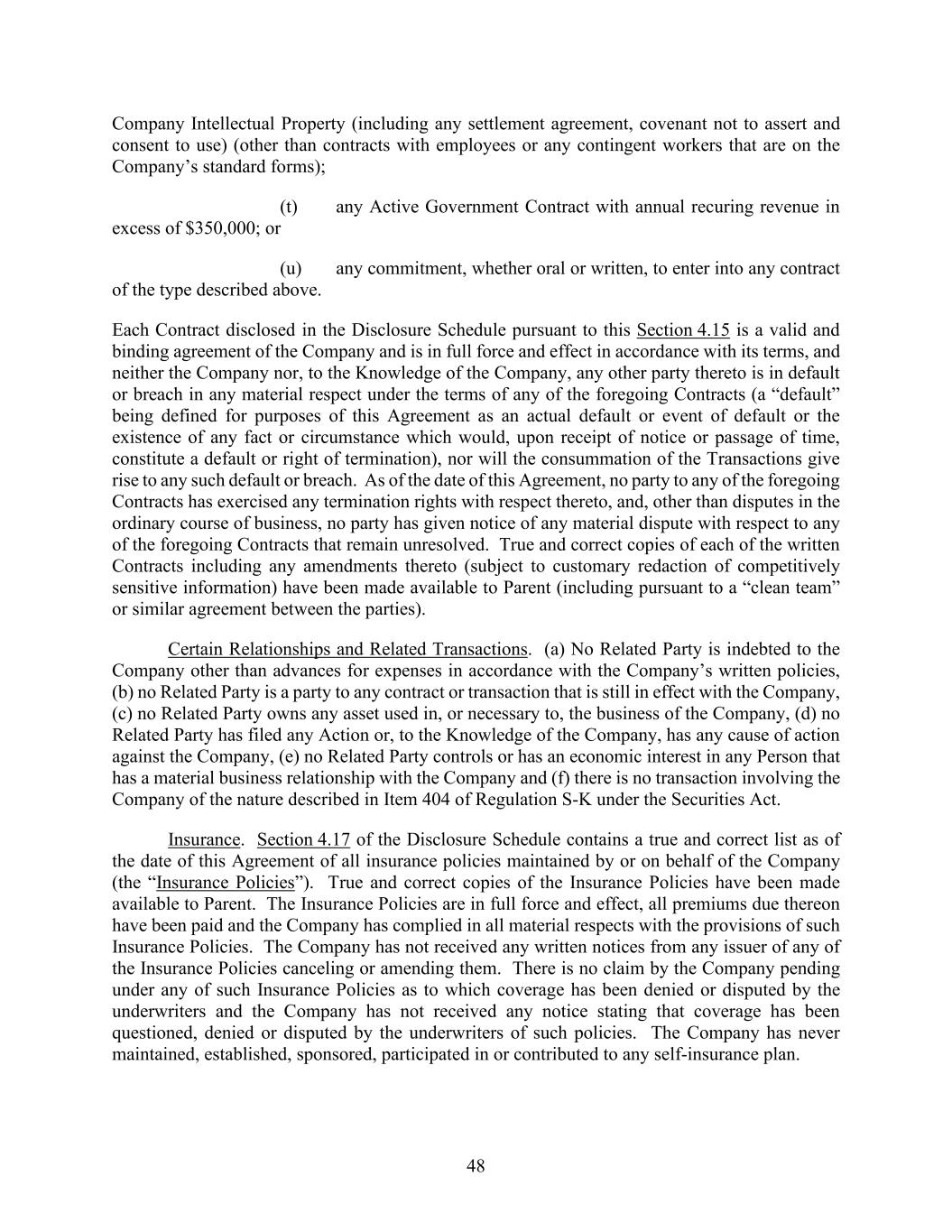 48 Company Intellectual Property (including any settlement agreement, covenant not to assert and consent to use) (other than contracts with employees or any contingent workers that are on the Company’s standard forms); (t) any Active Government Contract with annual recuring revenue in excess of $350,000; or (u) any commitment, whether oral or written, to enter into any contract of the type described above. Each Contract disclosed in the Disclosure Schedule pursuant to this Section 4.15 is a valid and binding agreement of the Company and is in full force and effect in accordance with its terms, and neither the Company nor, to the Knowledge of the Company, any other party thereto is in default or breach in any material respect under the terms of any of the foregoing Contracts (a “default” being defined for purposes of this Agreement as an actual default or event of default or the existence of any fact or circumstance which would, upon receipt of notice or passage of time, constitute a default or right of termination), nor will the consummation of the Transactions give rise to any such default or breach. As of the date of this Agreement, no party to any of the foregoing Contracts has exercised any termination rights with respect thereto, and, other than disputes in the ordinary course of business, no party has given notice of any material dispute with respect to any of the foregoing Contracts that remain unresolved. True and correct copies of each of the written Contracts including any amendments thereto (subject to customary redaction of competitively sensitive information) have been made available to Parent (including pursuant to a “clean team” or similar agreement between the parties). Certain Relationships and Related Transactions. (a) No Related Party is indebted to the Company other than advances for expenses in accordance with the Company’s written policies, (b) no Related Party is a party to any contract or transaction that is still in effect with the Company, (c) no Related Party owns any asset used in, or necessary to, the business of the Company, (d) no Related Party has filed any Action or, to the Knowledge of the Company, has any cause of action against the Company, (e) no Related Party controls or has an economic interest in any Person that has a material business relationship with the Company and (f) there is no transaction involving the Company of the nature described in Item 404 of Regulation S-K under the Securities Act. Insurance. Section 4.17 of the Disclosure Schedule contains a true and correct list as of the date of this Agreement of all insurance policies maintained by or on behalf of the Company (the “Insurance Policies”). True and correct copies of the Insurance Policies have been made available to Parent. The Insurance Policies are in full force and effect, all premiums due thereon have been paid and the Company has complied in all material respects with the provisions of such Insurance Policies. The Company has not received any written notices from any issuer of any of the Insurance Policies canceling or amending them. There is no claim by the Company pending under any of such Insurance Policies as to which coverage has been denied or disputed by the underwriters and the Company has not received any notice stating that coverage has been questioned, denied or disputed by the underwriters of such policies. The Company has never maintained, established, sponsored, participated in or contributed to any self-insurance plan.