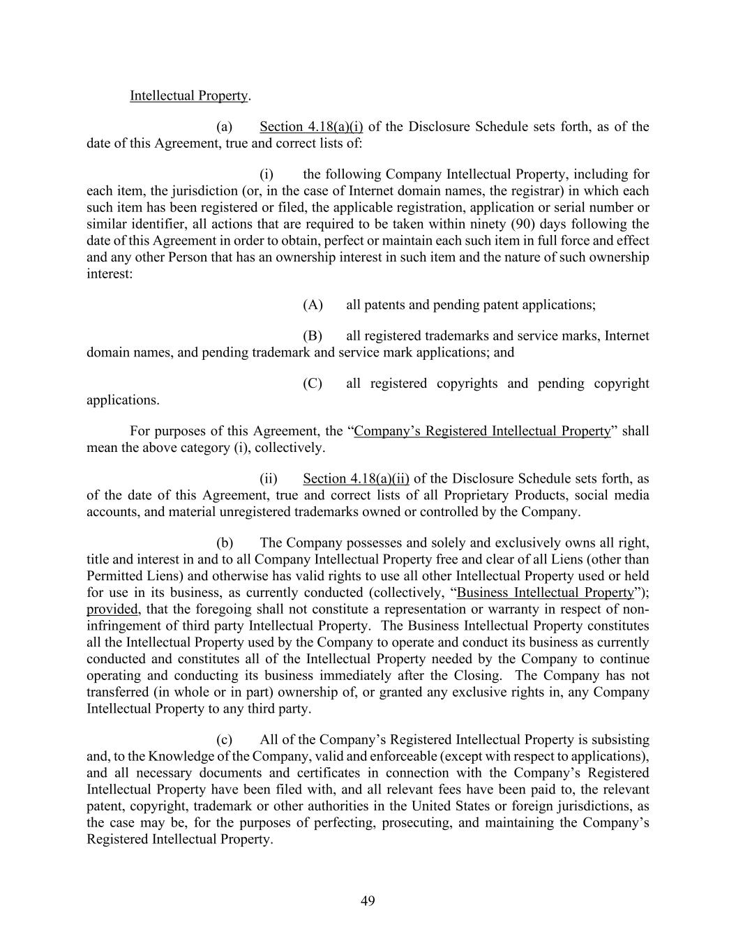 49 Intellectual Property. (a) Section 4.18(a)(i) of the Disclosure Schedule sets forth, as of the date of this Agreement, true and correct lists of: (i) the following Company Intellectual Property, including for each item, the jurisdiction (or, in the case of Internet domain names, the registrar) in which each such item has been registered or filed, the applicable registration, application or serial number or similar identifier, all actions that are required to be taken within ninety (90) days following the date of this Agreement in order to obtain, perfect or maintain each such item in full force and effect and any other Person that has an ownership interest in such item and the nature of such ownership interest: (A) all patents and pending patent applications; (B) all registered trademarks and service marks, Internet domain names, and pending trademark and service mark applications; and (C) all registered copyrights and pending copyright applications. For purposes of this Agreement, the “Company’s Registered Intellectual Property” shall mean the above category (i), collectively. (ii) Section 4.18(a)(ii) of the Disclosure Schedule sets forth, as of the date of this Agreement, true and correct lists of all Proprietary Products, social media accounts, and material unregistered trademarks owned or controlled by the Company. (b) The Company possesses and solely and exclusively owns all right, title and interest in and to all Company Intellectual Property free and clear of all Liens (other than Permitted Liens) and otherwise has valid rights to use all other Intellectual Property used or held for use in its business, as currently conducted (collectively, “Business Intellectual Property”); provided, that the foregoing shall not constitute a representation or warranty in respect of non- infringement of third party Intellectual Property. The Business Intellectual Property constitutes all the Intellectual Property used by the Company to operate and conduct its business as currently conducted and constitutes all of the Intellectual Property needed by the Company to continue operating and conducting its business immediately after the Closing. The Company has not transferred (in whole or in part) ownership of, or granted any exclusive rights in, any Company Intellectual Property to any third party. (c) All of the Company’s Registered Intellectual Property is subsisting and, to the Knowledge of the Company, valid and enforceable (except with respect to applications), and all necessary documents and certificates in connection with the Company’s Registered Intellectual Property have been filed with, and all relevant fees have been paid to, the relevant patent, copyright, trademark or other authorities in the United States or foreign jurisdictions, as the case may be, for the purposes of perfecting, prosecuting, and maintaining the Company’s Registered Intellectual Property.