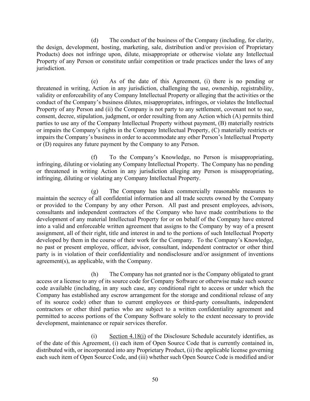 50 (d) The conduct of the business of the Company (including, for clarity, the design, development, hosting, marketing, sale, distribution and/or provision of Proprietary Products) does not infringe upon, dilute, misappropriate or otherwise violate any Intellectual Property of any Person or constitute unfair competition or trade practices under the laws of any jurisdiction. (e) As of the date of this Agreement, (i) there is no pending or threatened in writing, Action in any jurisdiction, challenging the use, ownership, registrability, validity or enforceability of any Company Intellectual Property or alleging that the activities or the conduct of the Company’s business dilutes, misappropriates, infringes, or violates the Intellectual Property of any Person and (ii) the Company is not party to any settlement, covenant not to sue, consent, decree, stipulation, judgment, or order resulting from any Action which (A) permits third parties to use any of the Company Intellectual Property without payment, (B) materially restricts or impairs the Company’s rights in the Company Intellectual Property, (C) materially restricts or impairs the Company’s business in order to accommodate any other Person’s Intellectual Property or (D) requires any future payment by the Company to any Person. (f) To the Company’s Knowledge, no Person is misappropriating, infringing, diluting or violating any Company Intellectual Property. The Company has no pending or threatened in writing Action in any jurisdiction alleging any Person is misappropriating, infringing, diluting or violating any Company Intellectual Property. (g) The Company has taken commercially reasonable measures to maintain the secrecy of all confidential information and all trade secrets owned by the Company or provided to the Company by any other Person. All past and present employees, advisors, consultants and independent contractors of the Company who have made contributions to the development of any material Intellectual Property for or on behalf of the Company have entered into a valid and enforceable written agreement that assigns to the Company by way of a present assignment, all of their right, title and interest in and to the portions of such Intellectual Property developed by them in the course of their work for the Company. To the Company’s Knowledge, no past or present employee, officer, advisor, consultant, independent contractor or other third party is in violation of their confidentiality and nondisclosure and/or assignment of inventions agreement(s), as applicable, with the Company. (h) The Company has not granted nor is the Company obligated to grant access or a license to any of its source code for Company Software or otherwise make such source code available (including, in any such case, any conditional right to access or under which the Company has established any escrow arrangement for the storage and conditional release of any of its source code) other than to current employees or third-party consultants, independent contractors or other third parties who are subject to a written confidentiality agreement and permitted to access portions of the Company Software solely to the extent necessary to provide development, maintenance or repair services therefor. (i) Section 4.18(i) of the Disclosure Schedule accurately identifies, as of the date of this Agreement, (i) each item of Open Source Code that is currently contained in, distributed with, or incorporated into any Proprietary Product, (ii) the applicable license governing each such item of Open Source Code, and (iii) whether such Open Source Code is modified and/or