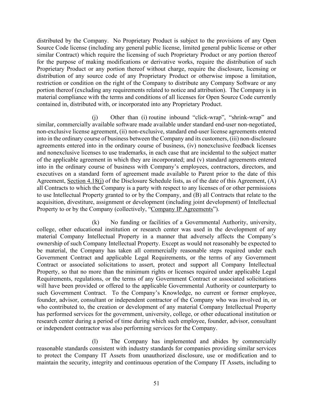 51 distributed by the Company. No Proprietary Product is subject to the provisions of any Open Source Code license (including any general public license, limited general public license or other similar Contract) which require the licensing of such Proprietary Product or any portion thereof for the purpose of making modifications or derivative works, require the distribution of such Proprietary Product or any portion thereof without charge, require the disclosure, licensing or distribution of any source code of any Proprietary Product or otherwise impose a limitation, restriction or condition on the right of the Company to distribute any Company Software or any portion thereof (excluding any requirements related to notice and attribution). The Company is in material compliance with the terms and conditions of all licenses for Open Source Code currently contained in, distributed with, or incorporated into any Proprietary Product. (j) Other than (i) routine inbound “click-wrap”, “shrink-wrap” and similar, commercially available software made available under standard end-user non-negotiated, non-exclusive license agreement, (ii) non-exclusive, standard end-user license agreements entered into in the ordinary course of business between the Company and its customers, (iii) non-disclosure agreements entered into in the ordinary course of business, (iv) nonexclusive feedback licenses and nonexclusive licenses to use trademarks, in each case that are incidental to the subject matter of the applicable agreement in which they are incorporated; and (v) standard agreements entered into in the ordinary course of business with Company’s employees, contractors, directors, and executives on a standard form of agreement made available to Parent prior to the date of this Agreement, Section 4.18(j) of the Disclosure Schedule lists, as of the date of this Agreement, (A) all Contracts to which the Company is a party with respect to any licenses of or other permissions to use Intellectual Property granted to or by the Company, and (B) all Contracts that relate to the acquisition, divestiture, assignment or development (including joint development) of Intellectual Property to or by the Company (collectively, “Company IP Agreements”). (k) No funding or facilities of a Governmental Authority, university, college, other educational institution or research center was used in the development of any material Company Intellectual Property in a manner that adversely affects the Company’s ownership of such Company Intellectual Property. Except as would not reasonably be expected to be material, the Company has taken all commercially reasonable steps required under each Government Contract and applicable Legal Requirements, or the terms of any Government Contract or associated solicitations to assert, protect and support all Company Intellectual Property, so that no more than the minimum rights or licenses required under applicable Legal Requirements, regulations, or the terms of any Government Contract or associated solicitations will have been provided or offered to the applicable Governmental Authority or counterparty to such Government Contract. To the Company’s Knowledge, no current or former employee, founder, advisor, consultant or independent contractor of the Company who was involved in, or who contributed to, the creation or development of any material Company Intellectual Property has performed services for the government, university, college, or other educational institution or research center during a period of time during which such employee, founder, advisor, consultant or independent contractor was also performing services for the Company. (l) The Company has implemented and abides by commercially reasonable standards consistent with industry standards for companies providing similar services to protect the Company IT Assets from unauthorized disclosure, use or modification and to maintain the security, integrity and continuous operation of the Company IT Assets, including to