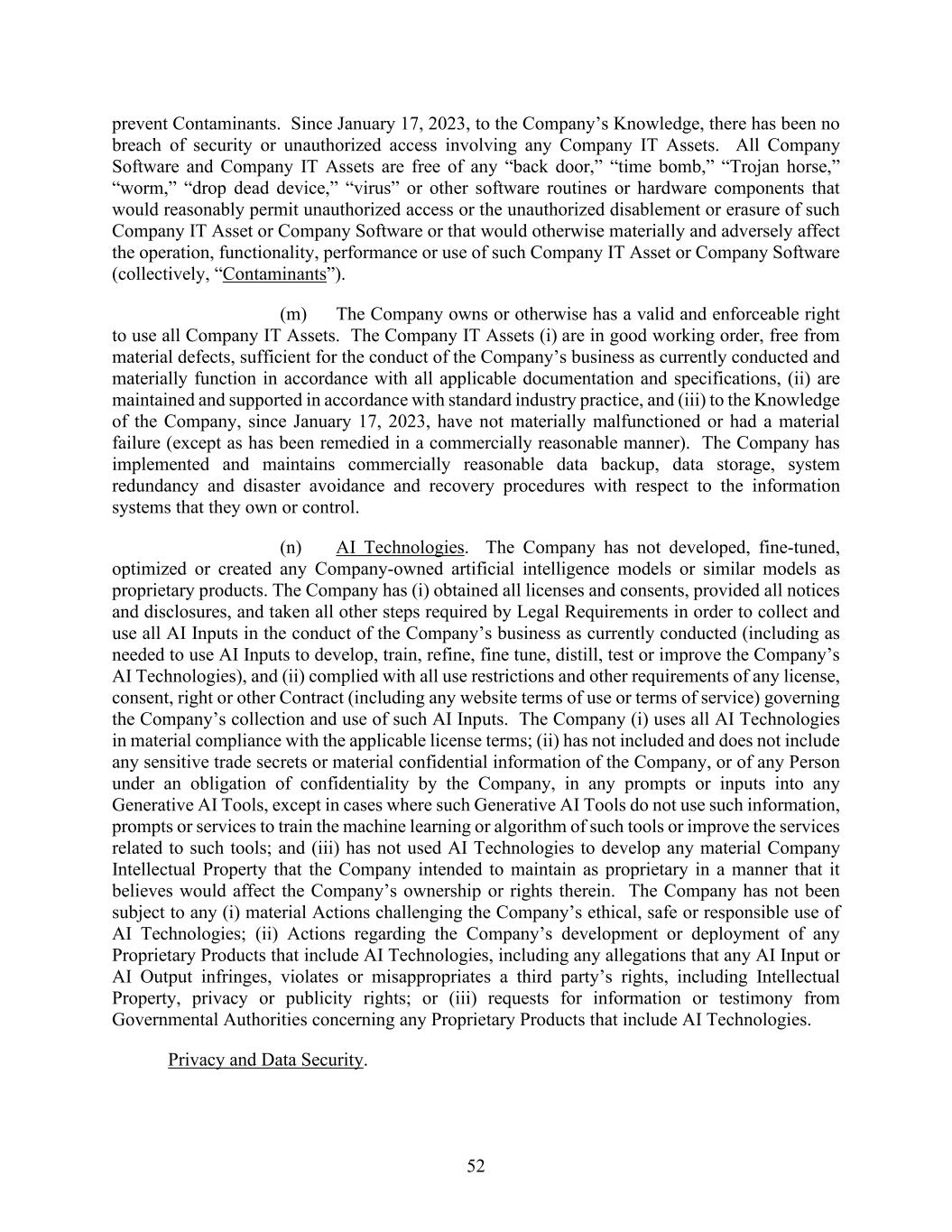 52 prevent Contaminants. Since January 17, 2023, to the Company’s Knowledge, there has been no breach of security or unauthorized access involving any Company IT Assets. All Company Software and Company IT Assets are free of any “back door,” “time bomb,” “Trojan horse,” “worm,” “drop dead device,” “virus” or other software routines or hardware components that would reasonably permit unauthorized access or the unauthorized disablement or erasure of such Company IT Asset or Company Software or that would otherwise materially and adversely affect the operation, functionality, performance or use of such Company IT Asset or Company Software (collectively, “Contaminants”). (m) The Company owns or otherwise has a valid and enforceable right to use all Company IT Assets. The Company IT Assets (i) are in good working order, free from material defects, sufficient for the conduct of the Company’s business as currently conducted and materially function in accordance with all applicable documentation and specifications, (ii) are maintained and supported in accordance with standard industry practice, and (iii) to the Knowledge of the Company, since January 17, 2023, have not materially malfunctioned or had a material failure (except as has been remedied in a commercially reasonable manner). The Company has implemented and maintains commercially reasonable data backup, data storage, system redundancy and disaster avoidance and recovery procedures with respect to the information systems that they own or control. (n) AI Technologies. The Company has not developed, fine-tuned, optimized or created any Company-owned artificial intelligence models or similar models as proprietary products. The Company has (i) obtained all licenses and consents, provided all notices and disclosures, and taken all other steps required by Legal Requirements in order to collect and use all AI Inputs in the conduct of the Company’s business as currently conducted (including as needed to use AI Inputs to develop, train, refine, fine tune, distill, test or improve the Company’s AI Technologies), and (ii) complied with all use restrictions and other requirements of any license, consent, right or other Contract (including any website terms of use or terms of service) governing the Company’s collection and use of such AI Inputs. The Company (i) uses all AI Technologies in material compliance with the applicable license terms; (ii) has not included and does not include any sensitive trade secrets or material confidential information of the Company, or of any Person under an obligation of confidentiality by the Company, in any prompts or inputs into any Generative AI Tools, except in cases where such Generative AI Tools do not use such information, prompts or services to train the machine learning or algorithm of such tools or improve the services related to such tools; and (iii) has not used AI Technologies to develop any material Company Intellectual Property that the Company intended to maintain as proprietary in a manner that it believes would affect the Company’s ownership or rights therein. The Company has not been subject to any (i) material Actions challenging the Company’s ethical, safe or responsible use of AI Technologies; (ii) Actions regarding the Company’s development or deployment of any Proprietary Products that include AI Technologies, including any allegations that any AI Input or AI Output infringes, violates or misappropriates a third party’s rights, including Intellectual Property, privacy or publicity rights; or (iii) requests for information or testimony from Governmental Authorities concerning any Proprietary Products that include AI Technologies. Privacy and Data Security.