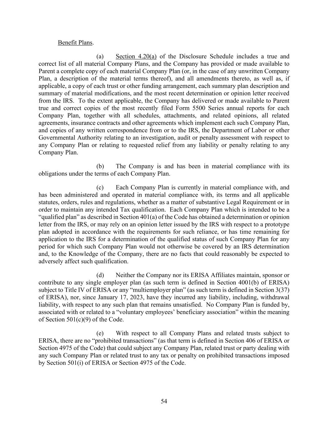 54 Benefit Plans. (a) Section 4.20(a) of the Disclosure Schedule includes a true and correct list of all material Company Plans, and the Company has provided or made available to Parent a complete copy of each material Company Plan (or, in the case of any unwritten Company Plan, a description of the material terms thereof), and all amendments thereto, as well as, if applicable, a copy of each trust or other funding arrangement, each summary plan description and summary of material modifications, and the most recent determination or opinion letter received from the IRS. To the extent applicable, the Company has delivered or made available to Parent true and correct copies of the most recently filed Form 5500 Series annual reports for each Company Plan, together with all schedules, attachments, and related opinions, all related agreements, insurance contracts and other agreements which implement each such Company Plan, and copies of any written correspondence from or to the IRS, the Department of Labor or other Governmental Authority relating to an investigation, audit or penalty assessment with respect to any Company Plan or relating to requested relief from any liability or penalty relating to any Company Plan. (b) The Company is and has been in material compliance with its obligations under the terms of each Company Plan. (c) Each Company Plan is currently in material compliance with, and has been administered and operated in material compliance with, its terms and all applicable statutes, orders, rules and regulations, whether as a matter of substantive Legal Requirement or in order to maintain any intended Tax qualification. Each Company Plan which is intended to be a “qualified plan” as described in Section 401(a) of the Code has obtained a determination or opinion letter from the IRS, or may rely on an opinion letter issued by the IRS with respect to a prototype plan adopted in accordance with the requirements for such reliance, or has time remaining for application to the IRS for a determination of the qualified status of such Company Plan for any period for which such Company Plan would not otherwise be covered by an IRS determination and, to the Knowledge of the Company, there are no facts that could reasonably be expected to adversely affect such qualification. (d) Neither the Company nor its ERISA Affiliates maintain, sponsor or contribute to any single employer plan (as such term is defined in Section 4001(b) of ERISA) subject to Title IV of ERISA or any “multiemployer plan” (as such term is defined in Section 3(37) of ERISA), nor, since January 17, 2023, have they incurred any liability, including, withdrawal liability, with respect to any such plan that remains unsatisfied. No Company Plan is funded by, associated with or related to a “voluntary employees’ beneficiary association” within the meaning of Section 501(c)(9) of the Code. (e) With respect to all Company Plans and related trusts subject to ERISA, there are no “prohibited transactions” (as that term is defined in Section 406 of ERISA or Section 4975 of the Code) that could subject any Company Plan, related trust or party dealing with any such Company Plan or related trust to any tax or penalty on prohibited transactions imposed by Section 501(i) of ERISA or Section 4975 of the Code.