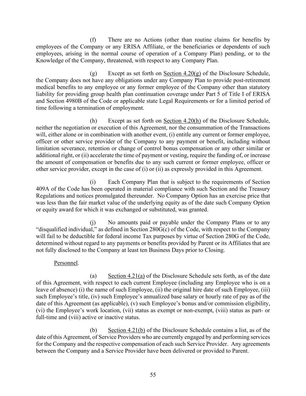 55 (f) There are no Actions (other than routine claims for benefits by employees of the Company or any ERISA Affiliate, or the beneficiaries or dependents of such employees, arising in the normal course of operation of a Company Plan) pending, or to the Knowledge of the Company, threatened, with respect to any Company Plan. (g) Except as set forth on Section 4.20(g) of the Disclosure Schedule, the Company does not have any obligations under any Company Plan to provide post-retirement medical benefits to any employee or any former employee of the Company other than statutory liability for providing group health plan continuation coverage under Part 5 of Title I of ERISA and Section 4980B of the Code or applicable state Legal Requirements or for a limited period of time following a termination of employment. (h) Except as set forth on Section 4.20(h) of the Disclosure Schedule, neither the negotiation or execution of this Agreement, nor the consummation of the Transactions will, either alone or in combination with another event, (i) entitle any current or former employee, officer or other service provider of the Company to any payment or benefit, including without limitation severance, retention or change of control bonus compensation or any other similar or additional right, or (ii) accelerate the time of payment or vesting, require the funding of, or increase the amount of compensation or benefits due to any such current or former employee, officer or other service provider, except in the case of (i) or (ii) as expressly provided in this Agreement. (i) Each Company Plan that is subject to the requirements of Section 409A of the Code has been operated in material compliance with such Section and the Treasury Regulations and notices promulgated thereunder. No Company Option has an exercise price that was less than the fair market value of the underlying equity as of the date such Company Option or equity award for which it was exchanged or substituted, was granted. (j) No amounts paid or payable under the Company Plans or to any “disqualified individual,” as defined in Section 280G(c) of the Code, with respect to the Company will fail to be deductible for federal income Tax purposes by virtue of Section 280G of the Code, determined without regard to any payments or benefits provided by Parent or its Affiliates that are not fully disclosed to the Company at least ten Business Days prior to Closing. Personnel. (a) Section 4.21(a) of the Disclosure Schedule sets forth, as of the date of this Agreement, with respect to each current Employee (including any Employee who is on a leave of absence) (i) the name of such Employee, (ii) the original hire date of such Employee, (iii) such Employee’s title, (iv) such Employee’s annualized base salary or hourly rate of pay as of the date of this Agreement (as applicable), (v) such Employee’s bonus and/or commission eligibility, (vi) the Employee’s work location, (vii) status as exempt or non-exempt, (viii) status as part- or full-time and (viii) active or inactive status. (b) Section 4.21(b) of the Disclosure Schedule contains a list, as of the date of this Agreement, of Service Providers who are currently engaged by and performing services for the Company and the respective compensation of each such Service Provider. Any agreements between the Company and a Service Provider have been delivered or provided to Parent.