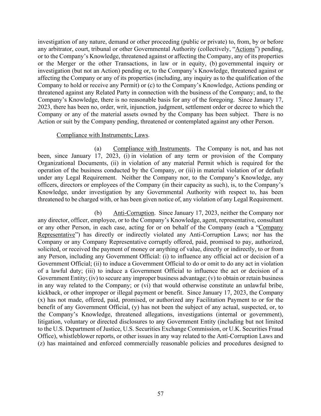 57 investigation of any nature, demand or other proceeding (public or private) to, from, by or before any arbitrator, court, tribunal or other Governmental Authority (collectively, “Actions”) pending, or to the Company’s Knowledge, threatened against or affecting the Company, any of its properties or the Merger or the other Transactions, in law or in equity, (b) governmental inquiry or investigation (but not an Action) pending or, to the Company’s Knowledge, threatened against or affecting the Company or any of its properties (including, any inquiry as to the qualification of the Company to hold or receive any Permit) or (c) to the Company’s Knowledge, Actions pending or threatened against any Related Party in connection with the business of the Company; and, to the Company’s Knowledge, there is no reasonable basis for any of the foregoing. Since January 17, 2023, there has been no, order, writ, injunction, judgment, settlement order or decree to which the Company or any of the material assets owned by the Company has been subject. There is no Action or suit by the Company pending, threatened or contemplated against any other Person. Compliance with Instruments; Laws. (a) Compliance with Instruments. The Company is not, and has not been, since January 17, 2023, (i) in violation of any term or provision of the Company Organizational Documents, (ii) in violation of any material Permit which is required for the operation of the business conducted by the Company, or (iii) in material violation of or default under any Legal Requirement. Neither the Company nor, to the Company’s Knowledge, any officers, directors or employees of the Company (in their capacity as such), is, to the Company’s Knowledge, under investigation by any Governmental Authority with respect to, has been threatened to be charged with, or has been given notice of, any violation of any Legal Requirement. (b) Anti-Corruption. Since January 17, 2023, neither the Company nor any director, officer, employee, or to the Company’s Knowledge, agent, representative, consultant or any other Person, in each case, acting for or on behalf of the Company (each a “Company Representative”) has directly or indirectly violated any Anti-Corruption Laws; nor has the Company or any Company Representative corruptly offered, paid, promised to pay, authorized, solicited, or received the payment of money or anything of value, directly or indirectly, to or from any Person, including any Government Official: (i) to influence any official act or decision of a Government Official; (ii) to induce a Government Official to do or omit to do any act in violation of a lawful duty; (iii) to induce a Government Official to influence the act or decision of a Government Entity; (iv) to secure any improper business advantage; (v) to obtain or retain business in any way related to the Company; or (vi) that would otherwise constitute an unlawful bribe, kickback, or other improper or illegal payment or benefit. Since January 17, 2023, the Company (x) has not made, offered, paid, promised, or authorized any Facilitation Payment to or for the benefit of any Government Official, (y) has not been the subject of any actual, suspected, or, to the Company’s Knowledge, threatened allegations, investigations (internal or government), litigation, voluntary or directed disclosures to any Government Entity (including but not limited to the U.S. Department of Justice, U.S. Securities Exchange Commission, or U.K. Securities Fraud Office), whistleblower reports, or other issues in any way related to the Anti-Corruption Laws and (z) has maintained and enforced commercially reasonable policies and procedures designed to