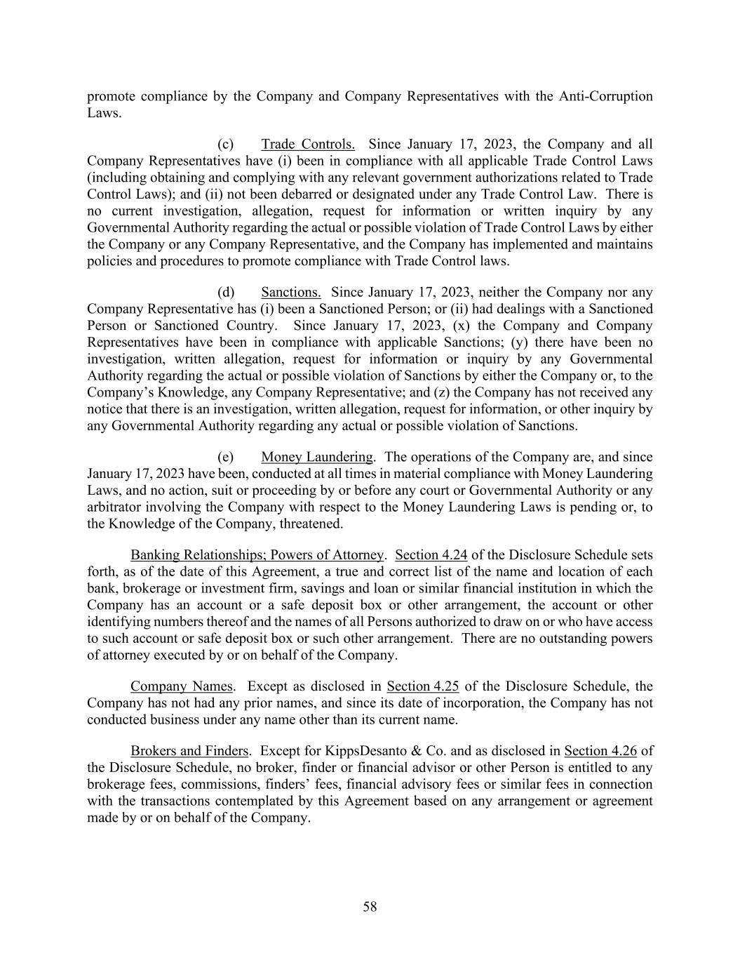 58 promote compliance by the Company and Company Representatives with the Anti-Corruption Laws. (c) Trade Controls. Since January 17, 2023, the Company and all Company Representatives have (i) been in compliance with all applicable Trade Control Laws (including obtaining and complying with any relevant government authorizations related to Trade Control Laws); and (ii) not been debarred or designated under any Trade Control Law. There is no current investigation, allegation, request for information or written inquiry by any Governmental Authority regarding the actual or possible violation of Trade Control Laws by either the Company or any Company Representative, and the Company has implemented and maintains policies and procedures to promote compliance with Trade Control laws. (d) Sanctions. Since January 17, 2023, neither the Company nor any Company Representative has (i) been a Sanctioned Person; or (ii) had dealings with a Sanctioned Person or Sanctioned Country. Since January 17, 2023, (x) the Company and Company Representatives have been in compliance with applicable Sanctions; (y) there have been no investigation, written allegation, request for information or inquiry by any Governmental Authority regarding the actual or possible violation of Sanctions by either the Company or, to the Company’s Knowledge, any Company Representative; and (z) the Company has not received any notice that there is an investigation, written allegation, request for information, or other inquiry by any Governmental Authority regarding any actual or possible violation of Sanctions. (e) Money Laundering. The operations of the Company are, and since January 17, 2023 have been, conducted at all times in material compliance with Money Laundering Laws, and no action, suit or proceeding by or before any court or Governmental Authority or any arbitrator involving the Company with respect to the Money Laundering Laws is pending or, to the Knowledge of the Company, threatened. Banking Relationships; Powers of Attorney. Section 4.24 of the Disclosure Schedule sets forth, as of the date of this Agreement, a true and correct list of the name and location of each bank, brokerage or investment firm, savings and loan or similar financial institution in which the Company has an account or a safe deposit box or other arrangement, the account or other identifying numbers thereof and the names of all Persons authorized to draw on or who have access to such account or safe deposit box or such other arrangement. There are no outstanding powers of attorney executed by or on behalf of the Company. Company Names. Except as disclosed in Section 4.25 of the Disclosure Schedule, the Company has not had any prior names, and since its date of incorporation, the Company has not conducted business under any name other than its current name. Brokers and Finders. Except for KippsDesanto & Co. and as disclosed in Section 4.26 of the Disclosure Schedule, no broker, finder or financial advisor or other Person is entitled to any brokerage fees, commissions, finders’ fees, financial advisory fees or similar fees in connection with the transactions contemplated by this Agreement based on any arrangement or agreement made by or on behalf of the Company.