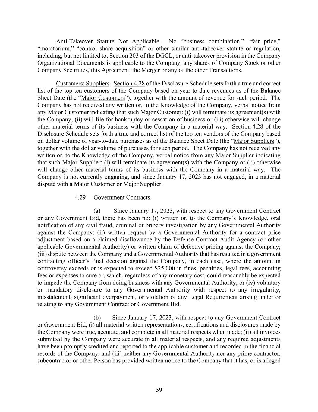 59 Anti-Takeover Statute Not Applicable. No “business combination,” “fair price,” “moratorium,” “control share acquisition” or other similar anti-takeover statute or regulation, including, but not limited to, Section 203 of the DGCL, or anti-takeover provision in the Company Organizational Documents is applicable to the Company, any shares of Company Stock or other Company Securities, this Agreement, the Merger or any of the other Transactions. Customers; Suppliers. Section 4.28 of the Disclosure Schedule sets forth a true and correct list of the top ten customers of the Company based on year-to-date revenues as of the Balance Sheet Date (the “Major Customers”), together with the amount of revenue for such period. The Company has not received any written or, to the Knowledge of the Company, verbal notice from any Major Customer indicating that such Major Customer: (i) will terminate its agreement(s) with the Company, (ii) will file for bankruptcy or cessation of business or (iii) otherwise will change other material terms of its business with the Company in a material way. Section 4.28 of the Disclosure Schedule sets forth a true and correct list of the top ten vendors of the Company based on dollar volume of year-to-date purchases as of the Balance Sheet Date (the “Major Suppliers”), together with the dollar volume of purchases for such period. The Company has not received any written or, to the Knowledge of the Company, verbal notice from any Major Supplier indicating that such Major Supplier: (i) will terminate its agreement(s) with the Company or (ii) otherwise will change other material terms of its business with the Company in a material way. The Company is not currently engaging, and since January 17, 2023 has not engaged, in a material dispute with a Major Customer or Major Supplier. 4.29 Government Contracts. (a) Since January 17, 2023, with respect to any Government Contract or any Government Bid, there has been no: (i) written or, to the Company’s Knowledge, oral notification of any civil fraud, criminal or bribery investigation by any Governmental Authority against the Company; (ii) written request by a Governmental Authority for a contract price adjustment based on a claimed disallowance by the Defense Contract Audit Agency (or other applicable Governmental Authority) or written claim of defective pricing against the Company; (iii) dispute between the Company and a Governmental Authority that has resulted in a government contracting officer’s final decision against the Company, in each case, where the amount in controversy exceeds or is expected to exceed $25,000 in fines, penalties, legal fees, accounting fees or expenses to cure or, which, regardless of any monetary cost, could reasonably be expected to impede the Company from doing business with any Governmental Authority; or (iv) voluntary or mandatory disclosure to any Governmental Authority with respect to any irregularity, misstatement, significant overpayment, or violation of any Legal Requirement arising under or relating to any Government Contract or Government Bid. (b) Since January 17, 2023, with respect to any Government Contract or Government Bid, (i) all material written representations, certifications and disclosures made by the Company were true, accurate, and complete in all material respects when made; (ii) all invoices submitted by the Company were accurate in all material respects, and any required adjustments have been promptly credited and reported to the applicable customer and recorded in the financial records of the Company; and (iii) neither any Governmental Authority nor any prime contractor, subcontractor or other Person has provided written notice to the Company that it has, or is alleged