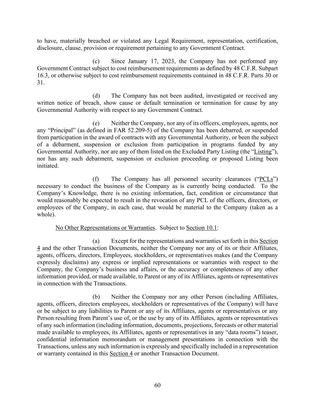 60 to have, materially breached or violated any Legal Requirement, representation, certification, disclosure, clause, provision or requirement pertaining to any Government Contract. (c) Since January 17, 2023, the Company has not performed any Government Contract subject to cost reimbursement requirements as defined by 48 C.F.R. Subpart 16.3, or otherwise subject to cost reimbursement requirements contained in 48 C.F.R. Parts 30 or 31. (d) The Company has not been audited, investigated or received any written notice of breach, show cause or default termination or termination for cause by any Governmental Authority with respect to any Government Contract. (e) Neither the Company, nor any of its officers, employees, agents, nor any “Principal” (as defined in FAR 52.209-5) of the Company has been debarred, or suspended from participation in the award of contracts with any Governmental Authority, or been the subject of a debarment, suspension or exclusion from participation in programs funded by any Governmental Authority, nor are any of them listed on the Excluded Party Listing (the “Listing”), nor has any such debarment, suspension or exclusion proceeding or proposed Listing been initiated. (f) The Company has all personnel security clearances (“PCLs”) necessary to conduct the business of the Company as is currently being conducted. To the Company’s Knowledge, there is no existing information, fact, condition or circumstance that would reasonably be expected to result in the revocation of any PCL of the officers, directors, or employees of the Company, in each case, that would be material to the Company (taken as a whole). No Other Representations or Warranties. Subject to Section 10.1: (a) Except for the representations and warranties set forth in this Section 4 and the other Transaction Documents, neither the Company nor any of its or their Affiliates, agents, officers, directors, Employees, stockholders, or representatives makes (and the Company expressly disclaims) any express or implied representations or warranties with respect to the Company, the Company’s business and affairs, or the accuracy or completeness of any other information provided, or made available, to Parent or any of its Affiliates, agents or representatives in connection with the Transactions. (b) Neither the Company nor any other Person (including Affiliates, agents, officers, directors employees, stockholders or representatives of the Company) will have or be subject to any liabilities to Parent or any of its Affiliates, agents or representatives or any Person resulting from Parent’s use of, or the use by any of its Affiliates, agents or representatives of any such information (including information, documents, projections, forecasts or other material made available to employees, its Affiliates, agents or representatives in any “data rooms”) teaser, confidential information memorandum or management presentations in connection with the Transactions, unless any such information is expressly and specifically included in a representation or warranty contained in this Section 4 or another Transaction Document.