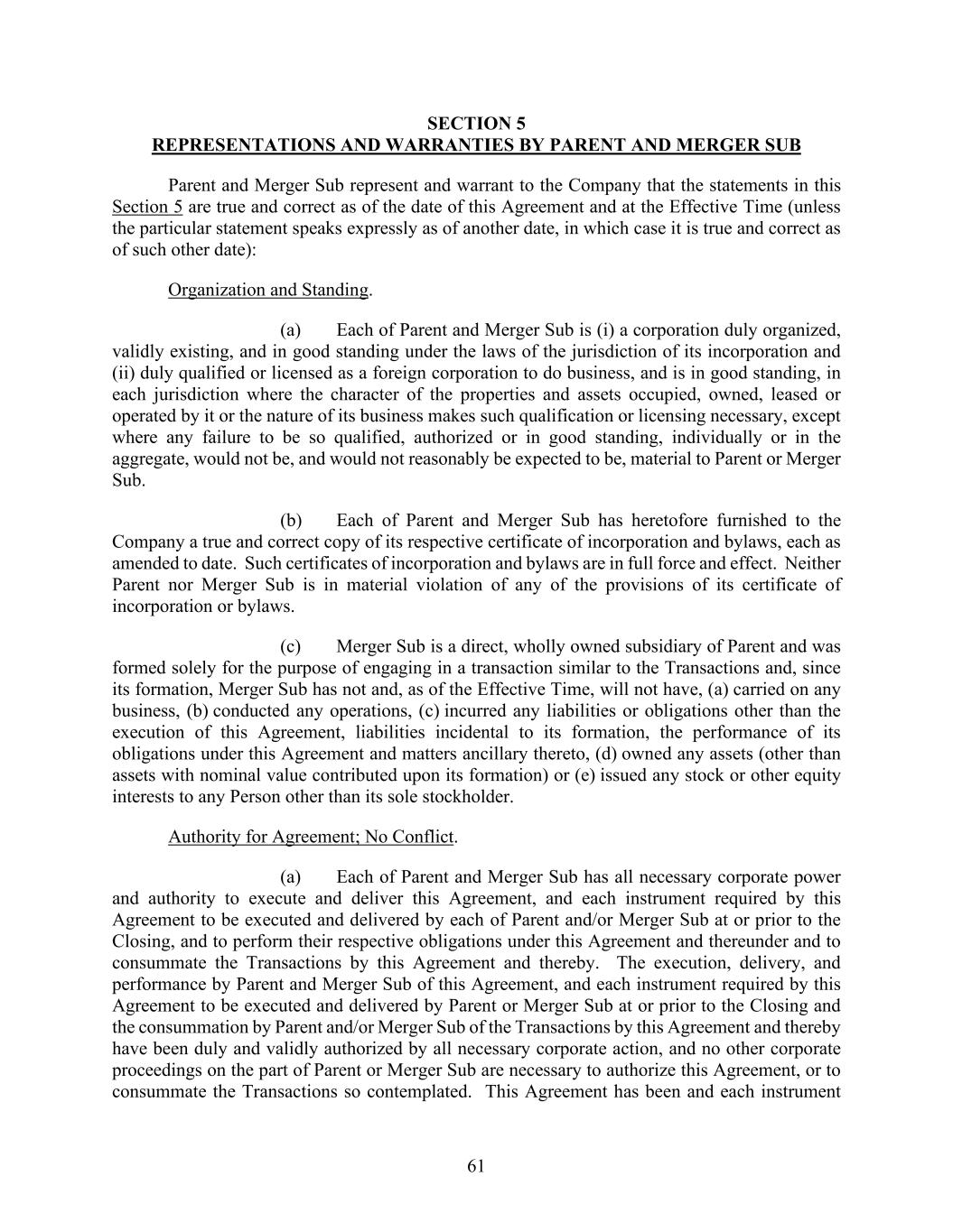 61 SECTION 5 REPRESENTATIONS AND WARRANTIES BY PARENT AND MERGER SUB Parent and Merger Sub represent and warrant to the Company that the statements in this Section 5 are true and correct as of the date of this Agreement and at the Effective Time (unless the particular statement speaks expressly as of another date, in which case it is true and correct as of such other date): Organization and Standing. (a) Each of Parent and Merger Sub is (i) a corporation duly organized, validly existing, and in good standing under the laws of the jurisdiction of its incorporation and (ii) duly qualified or licensed as a foreign corporation to do business, and is in good standing, in each jurisdiction where the character of the properties and assets occupied, owned, leased or operated by it or the nature of its business makes such qualification or licensing necessary, except where any failure to be so qualified, authorized or in good standing, individually or in the aggregate, would not be, and would not reasonably be expected to be, material to Parent or Merger Sub. (b) Each of Parent and Merger Sub has heretofore furnished to the Company a true and correct copy of its respective certificate of incorporation and bylaws, each as amended to date. Such certificates of incorporation and bylaws are in full force and effect. Neither Parent nor Merger Sub is in material violation of any of the provisions of its certificate of incorporation or bylaws. (c) Merger Sub is a direct, wholly owned subsidiary of Parent and was formed solely for the purpose of engaging in a transaction similar to the Transactions and, since its formation, Merger Sub has not and, as of the Effective Time, will not have, (a) carried on any business, (b) conducted any operations, (c) incurred any liabilities or obligations other than the execution of this Agreement, liabilities incidental to its formation, the performance of its obligations under this Agreement and matters ancillary thereto, (d) owned any assets (other than assets with nominal value contributed upon its formation) or (e) issued any stock or other equity interests to any Person other than its sole stockholder. Authority for Agreement; No Conflict. (a) Each of Parent and Merger Sub has all necessary corporate power and authority to execute and deliver this Agreement, and each instrument required by this Agreement to be executed and delivered by each of Parent and/or Merger Sub at or prior to the Closing, and to perform their respective obligations under this Agreement and thereunder and to consummate the Transactions by this Agreement and thereby. The execution, delivery, and performance by Parent and Merger Sub of this Agreement, and each instrument required by this Agreement to be executed and delivered by Parent or Merger Sub at or prior to the Closing and the consummation by Parent and/or Merger Sub of the Transactions by this Agreement and thereby have been duly and validly authorized by all necessary corporate action, and no other corporate proceedings on the part of Parent or Merger Sub are necessary to authorize this Agreement, or to consummate the Transactions so contemplated. This Agreement has been and each instrument