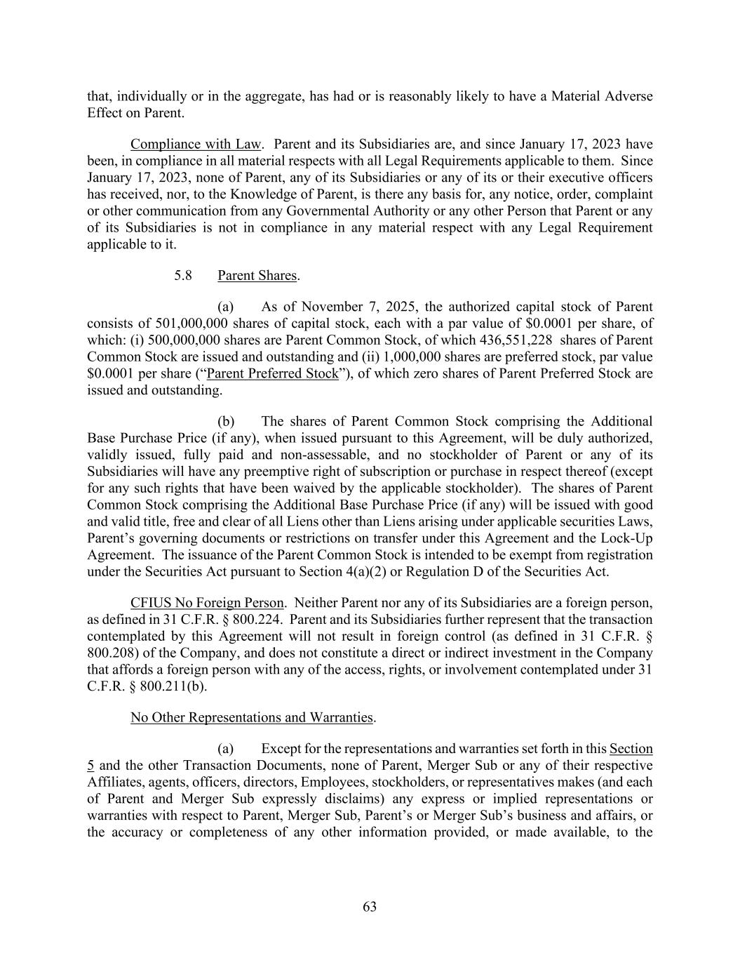 63 that, individually or in the aggregate, has had or is reasonably likely to have a Material Adverse Effect on Parent. Compliance with Law. Parent and its Subsidiaries are, and since January 17, 2023 have been, in compliance in all material respects with all Legal Requirements applicable to them. Since January 17, 2023, none of Parent, any of its Subsidiaries or any of its or their executive officers has received, nor, to the Knowledge of Parent, is there any basis for, any notice, order, complaint or other communication from any Governmental Authority or any other Person that Parent or any of its Subsidiaries is not in compliance in any material respect with any Legal Requirement applicable to it. 5.8 Parent Shares. (a) As of November 7, 2025, the authorized capital stock of Parent consists of 501,000,000 shares of capital stock, each with a par value of $0.0001 per share, of which: (i) 500,000,000 shares are Parent Common Stock, of which 436,551,228 shares of Parent Common Stock are issued and outstanding and (ii) 1,000,000 shares are preferred stock, par value $0.0001 per share (“Parent Preferred Stock”), of which zero shares of Parent Preferred Stock are issued and outstanding. (b) The shares of Parent Common Stock comprising the Additional Base Purchase Price (if any), when issued pursuant to this Agreement, will be duly authorized, validly issued, fully paid and non-assessable, and no stockholder of Parent or any of its Subsidiaries will have any preemptive right of subscription or purchase in respect thereof (except for any such rights that have been waived by the applicable stockholder). The shares of Parent Common Stock comprising the Additional Base Purchase Price (if any) will be issued with good and valid title, free and clear of all Liens other than Liens arising under applicable securities Laws, Parent’s governing documents or restrictions on transfer under this Agreement and the Lock-Up Agreement. The issuance of the Parent Common Stock is intended to be exempt from registration under the Securities Act pursuant to Section 4(a)(2) or Regulation D of the Securities Act. CFIUS No Foreign Person. Neither Parent nor any of its Subsidiaries are a foreign person, as defined in 31 C.F.R. § 800.224. Parent and its Subsidiaries further represent that the transaction contemplated by this Agreement will not result in foreign control (as defined in 31 C.F.R. § 800.208) of the Company, and does not constitute a direct or indirect investment in the Company that affords a foreign person with any of the access, rights, or involvement contemplated under 31 C.F.R. § 800.211(b). No Other Representations and Warranties. (a) Except for the representations and warranties set forth in this Section 5 and the other Transaction Documents, none of Parent, Merger Sub or any of their respective Affiliates, agents, officers, directors, Employees, stockholders, or representatives makes (and each of Parent and Merger Sub expressly disclaims) any express or implied representations or warranties with respect to Parent, Merger Sub, Parent’s or Merger Sub’s business and affairs, or the accuracy or completeness of any other information provided, or made available, to the