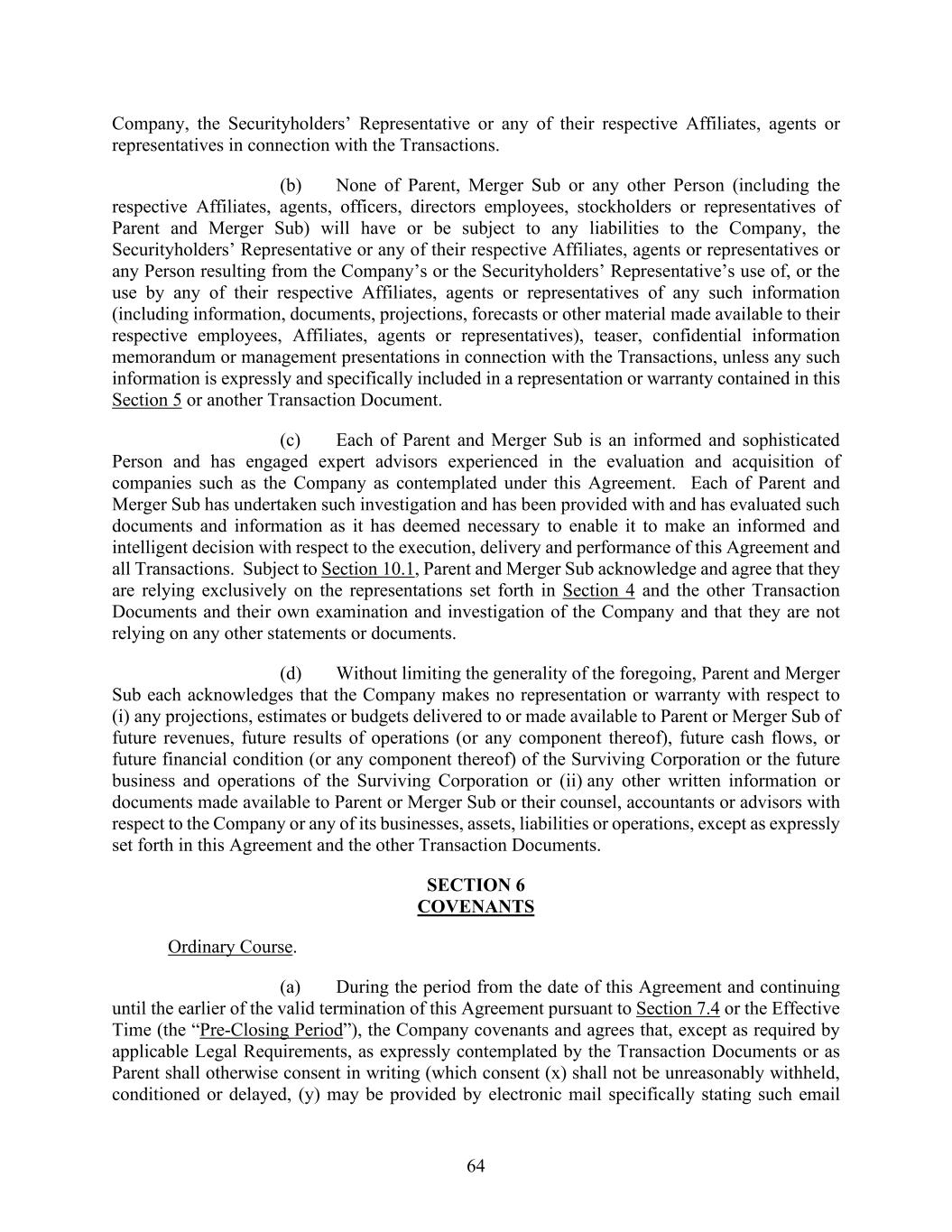64 Company, the Securityholders’ Representative or any of their respective Affiliates, agents or representatives in connection with the Transactions. (b) None of Parent, Merger Sub or any other Person (including the respective Affiliates, agents, officers, directors employees, stockholders or representatives of Parent and Merger Sub) will have or be subject to any liabilities to the Company, the Securityholders’ Representative or any of their respective Affiliates, agents or representatives or any Person resulting from the Company’s or the Securityholders’ Representative’s use of, or the use by any of their respective Affiliates, agents or representatives of any such information (including information, documents, projections, forecasts or other material made available to their respective employees, Affiliates, agents or representatives), teaser, confidential information memorandum or management presentations in connection with the Transactions, unless any such information is expressly and specifically included in a representation or warranty contained in this Section 5 or another Transaction Document. (c) Each of Parent and Merger Sub is an informed and sophisticated Person and has engaged expert advisors experienced in the evaluation and acquisition of companies such as the Company as contemplated under this Agreement. Each of Parent and Merger Sub has undertaken such investigation and has been provided with and has evaluated such documents and information as it has deemed necessary to enable it to make an informed and intelligent decision with respect to the execution, delivery and performance of this Agreement and all Transactions. Subject to Section 10.1, Parent and Merger Sub acknowledge and agree that they are relying exclusively on the representations set forth in Section 4 and the other Transaction Documents and their own examination and investigation of the Company and that they are not relying on any other statements or documents. (d) Without limiting the generality of the foregoing, Parent and Merger Sub each acknowledges that the Company makes no representation or warranty with respect to (i) any projections, estimates or budgets delivered to or made available to Parent or Merger Sub of future revenues, future results of operations (or any component thereof), future cash flows, or future financial condition (or any component thereof) of the Surviving Corporation or the future business and operations of the Surviving Corporation or (ii) any other written information or documents made available to Parent or Merger Sub or their counsel, accountants or advisors with respect to the Company or any of its businesses, assets, liabilities or operations, except as expressly set forth in this Agreement and the other Transaction Documents. SECTION 6 COVENANTS Ordinary Course. (a) During the period from the date of this Agreement and continuing until the earlier of the valid termination of this Agreement pursuant to Section 7.4 or the Effective Time (the “Pre-Closing Period”), the Company covenants and agrees that, except as required by applicable Legal Requirements, as expressly contemplated by the Transaction Documents or as Parent shall otherwise consent in writing (which consent (x) shall not be unreasonably withheld, conditioned or delayed, (y) may be provided by electronic mail specifically stating such email