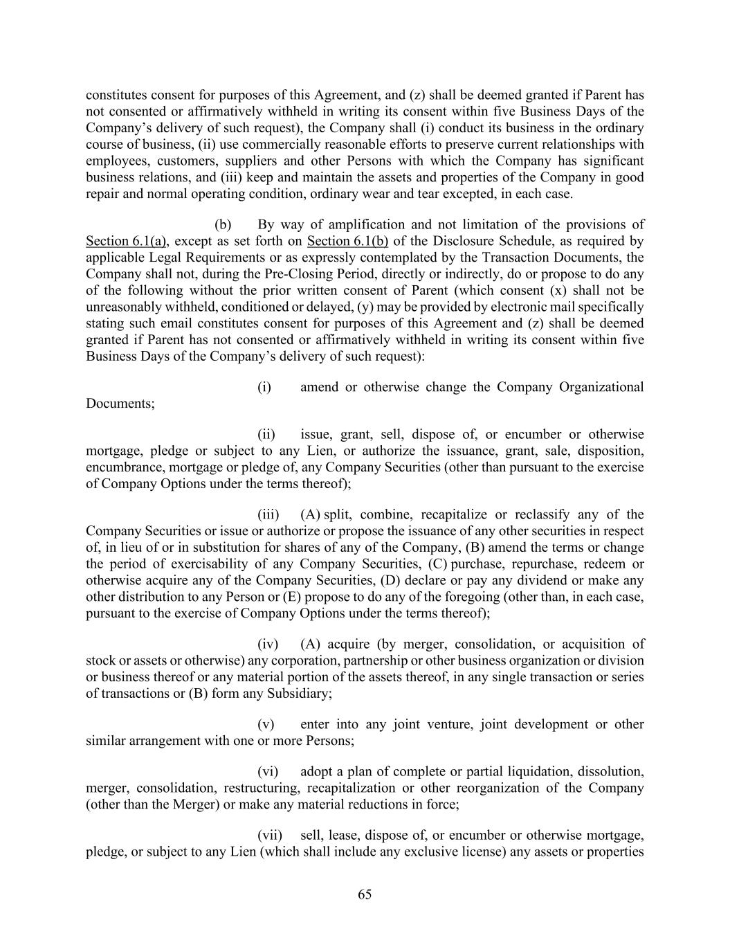65 constitutes consent for purposes of this Agreement, and (z) shall be deemed granted if Parent has not consented or affirmatively withheld in writing its consent within five Business Days of the Company’s delivery of such request), the Company shall (i) conduct its business in the ordinary course of business, (ii) use commercially reasonable efforts to preserve current relationships with employees, customers, suppliers and other Persons with which the Company has significant business relations, and (iii) keep and maintain the assets and properties of the Company in good repair and normal operating condition, ordinary wear and tear excepted, in each case. (b) By way of amplification and not limitation of the provisions of Section 6.1(a), except as set forth on Section 6.1(b) of the Disclosure Schedule, as required by applicable Legal Requirements or as expressly contemplated by the Transaction Documents, the Company shall not, during the Pre-Closing Period, directly or indirectly, do or propose to do any of the following without the prior written consent of Parent (which consent (x) shall not be unreasonably withheld, conditioned or delayed, (y) may be provided by electronic mail specifically stating such email constitutes consent for purposes of this Agreement and (z) shall be deemed granted if Parent has not consented or affirmatively withheld in writing its consent within five Business Days of the Company’s delivery of such request): (i) amend or otherwise change the Company Organizational Documents; (ii) issue, grant, sell, dispose of, or encumber or otherwise mortgage, pledge or subject to any Lien, or authorize the issuance, grant, sale, disposition, encumbrance, mortgage or pledge of, any Company Securities (other than pursuant to the exercise of Company Options under the terms thereof); (iii) (A) split, combine, recapitalize or reclassify any of the Company Securities or issue or authorize or propose the issuance of any other securities in respect of, in lieu of or in substitution for shares of any of the Company, (B) amend the terms or change the period of exercisability of any Company Securities, (C) purchase, repurchase, redeem or otherwise acquire any of the Company Securities, (D) declare or pay any dividend or make any other distribution to any Person or (E) propose to do any of the foregoing (other than, in each case, pursuant to the exercise of Company Options under the terms thereof); (iv) (A) acquire (by merger, consolidation, or acquisition of stock or assets or otherwise) any corporation, partnership or other business organization or division or business thereof or any material portion of the assets thereof, in any single transaction or series of transactions or (B) form any Subsidiary; (v) enter into any joint venture, joint development or other similar arrangement with one or more Persons; (vi) adopt a plan of complete or partial liquidation, dissolution, merger, consolidation, restructuring, recapitalization or other reorganization of the Company (other than the Merger) or make any material reductions in force; (vii) sell, lease, dispose of, or encumber or otherwise mortgage, pledge, or subject to any Lien (which shall include any exclusive license) any assets or properties