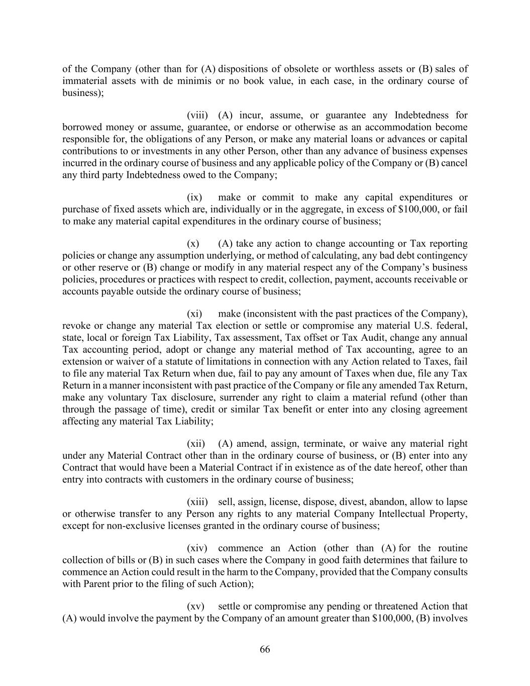 66 of the Company (other than for (A) dispositions of obsolete or worthless assets or (B) sales of immaterial assets with de minimis or no book value, in each case, in the ordinary course of business); (viii) (A) incur, assume, or guarantee any Indebtedness for borrowed money or assume, guarantee, or endorse or otherwise as an accommodation become responsible for, the obligations of any Person, or make any material loans or advances or capital contributions to or investments in any other Person, other than any advance of business expenses incurred in the ordinary course of business and any applicable policy of the Company or (B) cancel any third party Indebtedness owed to the Company; (ix) make or commit to make any capital expenditures or purchase of fixed assets which are, individually or in the aggregate, in excess of $100,000, or fail to make any material capital expenditures in the ordinary course of business; (x) (A) take any action to change accounting or Tax reporting policies or change any assumption underlying, or method of calculating, any bad debt contingency or other reserve or (B) change or modify in any material respect any of the Company’s business policies, procedures or practices with respect to credit, collection, payment, accounts receivable or accounts payable outside the ordinary course of business; (xi) make (inconsistent with the past practices of the Company), revoke or change any material Tax election or settle or compromise any material U.S. federal, state, local or foreign Tax Liability, Tax assessment, Tax offset or Tax Audit, change any annual Tax accounting period, adopt or change any material method of Tax accounting, agree to an extension or waiver of a statute of limitations in connection with any Action related to Taxes, fail to file any material Tax Return when due, fail to pay any amount of Taxes when due, file any Tax Return in a manner inconsistent with past practice of the Company or file any amended Tax Return, make any voluntary Tax disclosure, surrender any right to claim a material refund (other than through the passage of time), credit or similar Tax benefit or enter into any closing agreement affecting any material Tax Liability; (xii) (A) amend, assign, terminate, or waive any material right under any Material Contract other than in the ordinary course of business, or (B) enter into any Contract that would have been a Material Contract if in existence as of the date hereof, other than entry into contracts with customers in the ordinary course of business; (xiii) sell, assign, license, dispose, divest, abandon, allow to lapse or otherwise transfer to any Person any rights to any material Company Intellectual Property, except for non-exclusive licenses granted in the ordinary course of business; (xiv) commence an Action (other than (A) for the routine collection of bills or (B) in such cases where the Company in good faith determines that failure to commence an Action could result in the harm to the Company, provided that the Company consults with Parent prior to the filing of such Action); (xv) settle or compromise any pending or threatened Action that (A) would involve the payment by the Company of an amount greater than $100,000, (B) involves