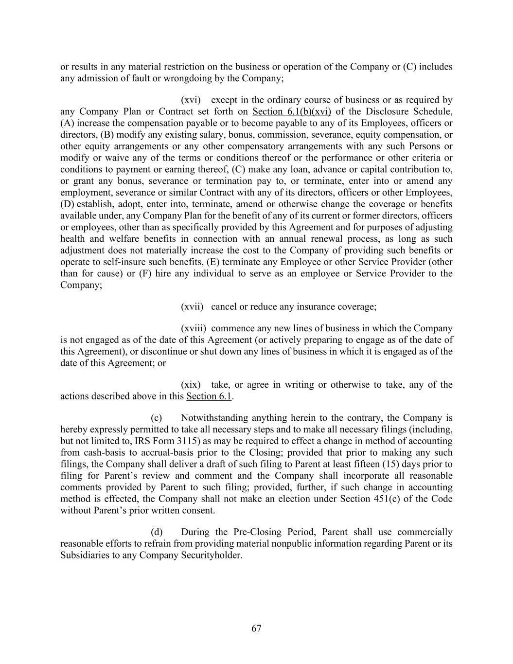 67 or results in any material restriction on the business or operation of the Company or (C) includes any admission of fault or wrongdoing by the Company; (xvi) except in the ordinary course of business or as required by any Company Plan or Contract set forth on Section 6.1(b)(xvi) of the Disclosure Schedule, (A) increase the compensation payable or to become payable to any of its Employees, officers or directors, (B) modify any existing salary, bonus, commission, severance, equity compensation, or other equity arrangements or any other compensatory arrangements with any such Persons or modify or waive any of the terms or conditions thereof or the performance or other criteria or conditions to payment or earning thereof, (C) make any loan, advance or capital contribution to, or grant any bonus, severance or termination pay to, or terminate, enter into or amend any employment, severance or similar Contract with any of its directors, officers or other Employees, (D) establish, adopt, enter into, terminate, amend or otherwise change the coverage or benefits available under, any Company Plan for the benefit of any of its current or former directors, officers or employees, other than as specifically provided by this Agreement and for purposes of adjusting health and welfare benefits in connection with an annual renewal process, as long as such adjustment does not materially increase the cost to the Company of providing such benefits or operate to self-insure such benefits, (E) terminate any Employee or other Service Provider (other than for cause) or (F) hire any individual to serve as an employee or Service Provider to the Company; (xvii) cancel or reduce any insurance coverage; (xviii) commence any new lines of business in which the Company is not engaged as of the date of this Agreement (or actively preparing to engage as of the date of this Agreement), or discontinue or shut down any lines of business in which it is engaged as of the date of this Agreement; or (xix) take, or agree in writing or otherwise to take, any of the actions described above in this Section 6.1. (c) Notwithstanding anything herein to the contrary, the Company is hereby expressly permitted to take all necessary steps and to make all necessary filings (including, but not limited to, IRS Form 3115) as may be required to effect a change in method of accounting from cash-basis to accrual-basis prior to the Closing; provided that prior to making any such filings, the Company shall deliver a draft of such filing to Parent at least fifteen (15) days prior to filing for Parent’s review and comment and the Company shall incorporate all reasonable comments provided by Parent to such filing; provided, further, if such change in accounting method is effected, the Company shall not make an election under Section 451(c) of the Code without Parent’s prior written consent. (d) During the Pre-Closing Period, Parent shall use commercially reasonable efforts to refrain from providing material nonpublic information regarding Parent or its Subsidiaries to any Company Securityholder.