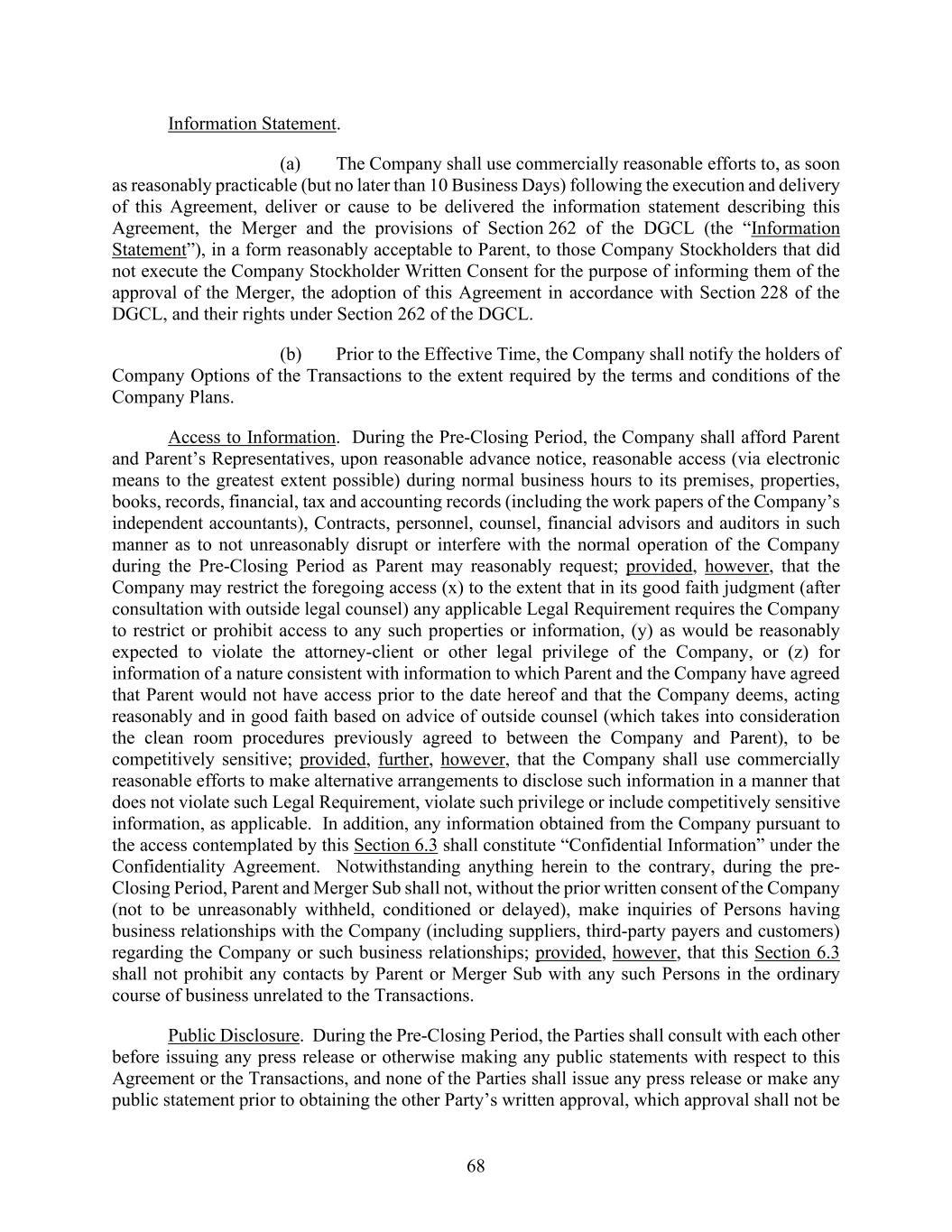 68 Information Statement. (a) The Company shall use commercially reasonable efforts to, as soon as reasonably practicable (but no later than 10 Business Days) following the execution and delivery of this Agreement, deliver or cause to be delivered the information statement describing this Agreement, the Merger and the provisions of Section 262 of the DGCL (the “Information Statement”), in a form reasonably acceptable to Parent, to those Company Stockholders that did not execute the Company Stockholder Written Consent for the purpose of informing them of the approval of the Merger, the adoption of this Agreement in accordance with Section 228 of the DGCL, and their rights under Section 262 of the DGCL. (b) Prior to the Effective Time, the Company shall notify the holders of Company Options of the Transactions to the extent required by the terms and conditions of the Company Plans. Access to Information. During the Pre-Closing Period, the Company shall afford Parent and Parent’s Representatives, upon reasonable advance notice, reasonable access (via electronic means to the greatest extent possible) during normal business hours to its premises, properties, books, records, financial, tax and accounting records (including the work papers of the Company’s independent accountants), Contracts, personnel, counsel, financial advisors and auditors in such manner as to not unreasonably disrupt or interfere with the normal operation of the Company during the Pre-Closing Period as Parent may reasonably request; provided, however, that the Company may restrict the foregoing access (x) to the extent that in its good faith judgment (after consultation with outside legal counsel) any applicable Legal Requirement requires the Company to restrict or prohibit access to any such properties or information, (y) as would be reasonably expected to violate the attorney-client or other legal privilege of the Company, or (z) for information of a nature consistent with information to which Parent and the Company have agreed that Parent would not have access prior to the date hereof and that the Company deems, acting reasonably and in good faith based on advice of outside counsel (which takes into consideration the clean room procedures previously agreed to between the Company and Parent), to be competitively sensitive; provided, further, however, that the Company shall use commercially reasonable efforts to make alternative arrangements to disclose such information in a manner that does not violate such Legal Requirement, violate such privilege or include competitively sensitive information, as applicable. In addition, any information obtained from the Company pursuant to the access contemplated by this Section 6.3 shall constitute “Confidential Information” under the Confidentiality Agreement. Notwithstanding anything herein to the contrary, during the pre- Closing Period, Parent and Merger Sub shall not, without the prior written consent of the Company (not to be unreasonably withheld, conditioned or delayed), make inquiries of Persons having business relationships with the Company (including suppliers, third-party payers and customers) regarding the Company or such business relationships; provided, however, that this Section 6.3 shall not prohibit any contacts by Parent or Merger Sub with any such Persons in the ordinary course of business unrelated to the Transactions. Public Disclosure. During the Pre-Closing Period, the Parties shall consult with each other before issuing any press release or otherwise making any public statements with respect to this Agreement or the Transactions, and none of the Parties shall issue any press release or make any public statement prior to obtaining the other Party’s written approval, which approval shall not be