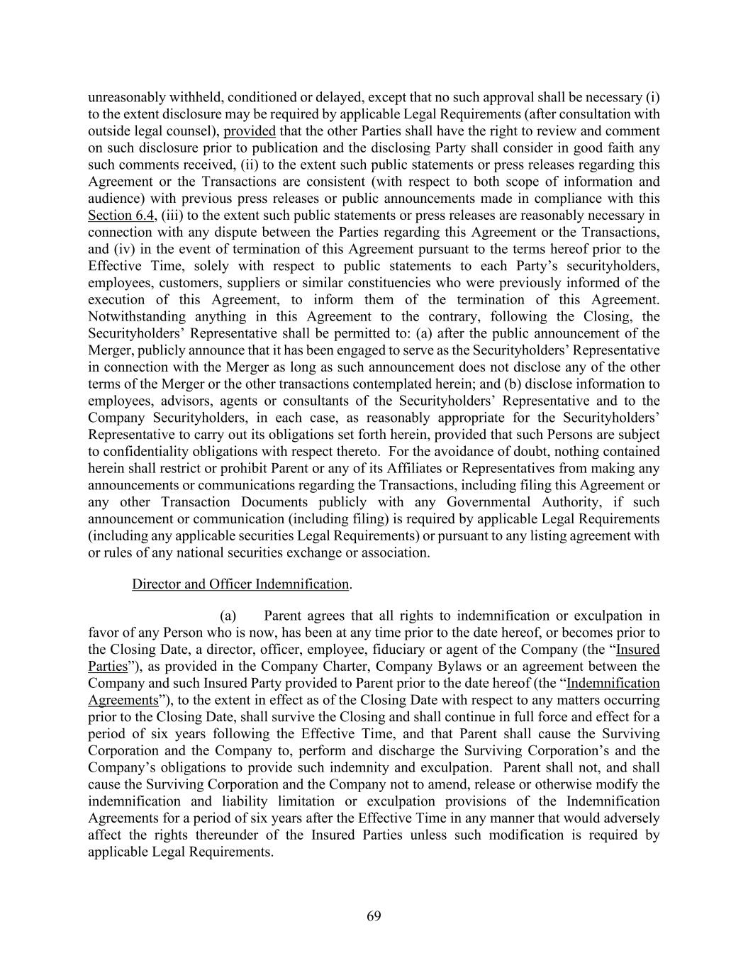 69 unreasonably withheld, conditioned or delayed, except that no such approval shall be necessary (i) to the extent disclosure may be required by applicable Legal Requirements (after consultation with outside legal counsel), provided that the other Parties shall have the right to review and comment on such disclosure prior to publication and the disclosing Party shall consider in good faith any such comments received, (ii) to the extent such public statements or press releases regarding this Agreement or the Transactions are consistent (with respect to both scope of information and audience) with previous press releases or public announcements made in compliance with this Section 6.4, (iii) to the extent such public statements or press releases are reasonably necessary in connection with any dispute between the Parties regarding this Agreement or the Transactions, and (iv) in the event of termination of this Agreement pursuant to the terms hereof prior to the Effective Time, solely with respect to public statements to each Party’s securityholders, employees, customers, suppliers or similar constituencies who were previously informed of the execution of this Agreement, to inform them of the termination of this Agreement. Notwithstanding anything in this Agreement to the contrary, following the Closing, the Securityholders’ Representative shall be permitted to: (a) after the public announcement of the Merger, publicly announce that it has been engaged to serve as the Securityholders’ Representative in connection with the Merger as long as such announcement does not disclose any of the other terms of the Merger or the other transactions contemplated herein; and (b) disclose information to employees, advisors, agents or consultants of the Securityholders’ Representative and to the Company Securityholders, in each case, as reasonably appropriate for the Securityholders’ Representative to carry out its obligations set forth herein, provided that such Persons are subject to confidentiality obligations with respect thereto. For the avoidance of doubt, nothing contained herein shall restrict or prohibit Parent or any of its Affiliates or Representatives from making any announcements or communications regarding the Transactions, including filing this Agreement or any other Transaction Documents publicly with any Governmental Authority, if such announcement or communication (including filing) is required by applicable Legal Requirements (including any applicable securities Legal Requirements) or pursuant to any listing agreement with or rules of any national securities exchange or association. Director and Officer Indemnification. (a) Parent agrees that all rights to indemnification or exculpation in favor of any Person who is now, has been at any time prior to the date hereof, or becomes prior to the Closing Date, a director, officer, employee, fiduciary or agent of the Company (the “Insured Parties”), as provided in the Company Charter, Company Bylaws or an agreement between the Company and such Insured Party provided to Parent prior to the date hereof (the “Indemnification Agreements”), to the extent in effect as of the Closing Date with respect to any matters occurring prior to the Closing Date, shall survive the Closing and shall continue in full force and effect for a period of six years following the Effective Time, and that Parent shall cause the Surviving Corporation and the Company to, perform and discharge the Surviving Corporation’s and the Company’s obligations to provide such indemnity and exculpation. Parent shall not, and shall cause the Surviving Corporation and the Company not to amend, release or otherwise modify the indemnification and liability limitation or exculpation provisions of the Indemnification Agreements for a period of six years after the Effective Time in any manner that would adversely affect the rights thereunder of the Insured Parties unless such modification is required by applicable Legal Requirements.