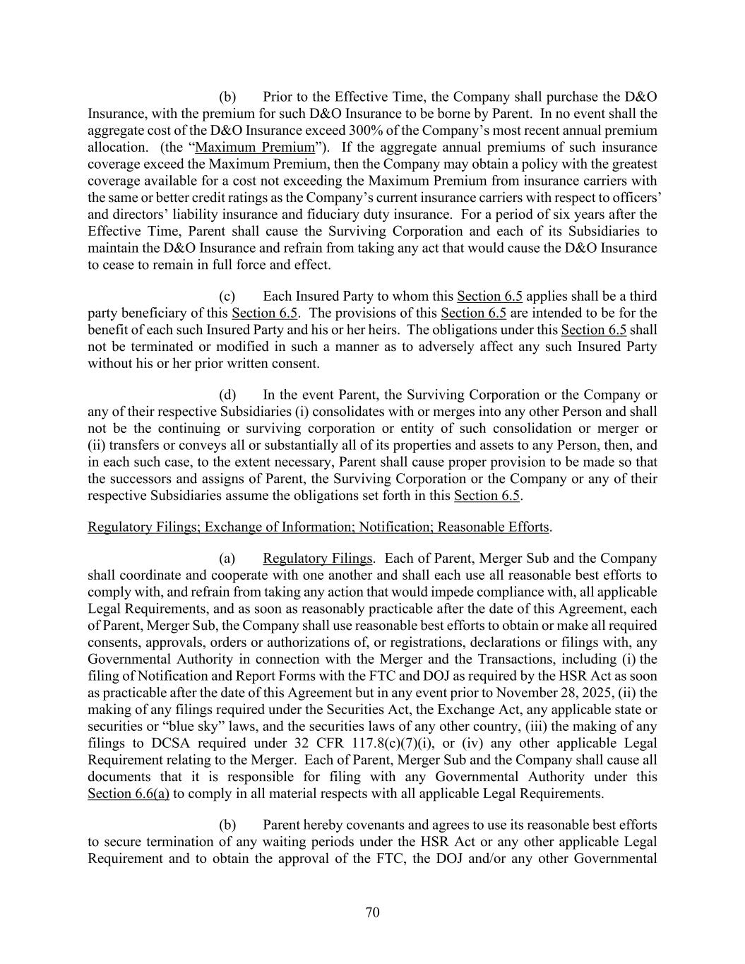70 (b) Prior to the Effective Time, the Company shall purchase the D&O Insurance, with the premium for such D&O Insurance to be borne by Parent. In no event shall the aggregate cost of the D&O Insurance exceed 300% of the Company’s most recent annual premium allocation. (the “Maximum Premium”). If the aggregate annual premiums of such insurance coverage exceed the Maximum Premium, then the Company may obtain a policy with the greatest coverage available for a cost not exceeding the Maximum Premium from insurance carriers with the same or better credit ratings as the Company’s current insurance carriers with respect to officers’ and directors’ liability insurance and fiduciary duty insurance. For a period of six years after the Effective Time, Parent shall cause the Surviving Corporation and each of its Subsidiaries to maintain the D&O Insurance and refrain from taking any act that would cause the D&O Insurance to cease to remain in full force and effect. (c) Each Insured Party to whom this Section 6.5 applies shall be a third party beneficiary of this Section 6.5. The provisions of this Section 6.5 are intended to be for the benefit of each such Insured Party and his or her heirs. The obligations under this Section 6.5 shall not be terminated or modified in such a manner as to adversely affect any such Insured Party without his or her prior written consent. (d) In the event Parent, the Surviving Corporation or the Company or any of their respective Subsidiaries (i) consolidates with or merges into any other Person and shall not be the continuing or surviving corporation or entity of such consolidation or merger or (ii) transfers or conveys all or substantially all of its properties and assets to any Person, then, and in each such case, to the extent necessary, Parent shall cause proper provision to be made so that the successors and assigns of Parent, the Surviving Corporation or the Company or any of their respective Subsidiaries assume the obligations set forth in this Section 6.5. Regulatory Filings; Exchange of Information; Notification; Reasonable Efforts. (a) Regulatory Filings. Each of Parent, Merger Sub and the Company shall coordinate and cooperate with one another and shall each use all reasonable best efforts to comply with, and refrain from taking any action that would impede compliance with, all applicable Legal Requirements, and as soon as reasonably practicable after the date of this Agreement, each of Parent, Merger Sub, the Company shall use reasonable best efforts to obtain or make all required consents, approvals, orders or authorizations of, or registrations, declarations or filings with, any Governmental Authority in connection with the Merger and the Transactions, including (i) the filing of Notification and Report Forms with the FTC and DOJ as required by the HSR Act as soon as practicable after the date of this Agreement but in any event prior to November 28, 2025, (ii) the making of any filings required under the Securities Act, the Exchange Act, any applicable state or securities or “blue sky” laws, and the securities laws of any other country, (iii) the making of any filings to DCSA required under 32 CFR 117.8(c)(7)(i), or (iv) any other applicable Legal Requirement relating to the Merger. Each of Parent, Merger Sub and the Company shall cause all documents that it is responsible for filing with any Governmental Authority under this Section 6.6(a) to comply in all material respects with all applicable Legal Requirements. (b) Parent hereby covenants and agrees to use its reasonable best efforts to secure termination of any waiting periods under the HSR Act or any other applicable Legal Requirement and to obtain the approval of the FTC, the DOJ and/or any other Governmental