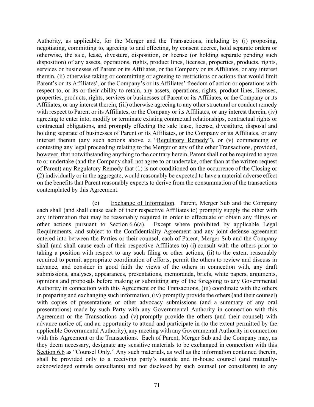 71 Authority, as applicable, for the Merger and the Transactions, including by (i) proposing, negotiating, committing to, agreeing to and effecting, by consent decree, hold separate orders or otherwise, the sale, lease, divesture, disposition, or license (or holding separate pending such disposition) of any assets, operations, rights, product lines, licenses, properties, products, rights, services or businesses of Parent or its Affiliates, or the Company or its Affiliates, or any interest therein, (ii) otherwise taking or committing or agreeing to restrictions or actions that would limit Parent’s or its Affiliates’, or the Company’s or its Affiliates’ freedom of action or operations with respect to, or its or their ability to retain, any assets, operations, rights, product lines, licenses, properties, products, rights, services or businesses of Parent or its Affiliates, or the Company or its Affiliates, or any interest therein, (iii) otherwise agreeing to any other structural or conduct remedy with respect to Parent or its Affiliates, or the Company or its Affiliates, or any interest therein, (iv) agreeing to enter into, modify or terminate existing contractual relationships, contractual rights or contractual obligations, and promptly effecting the sale lease, license, divestiture, disposal and holding separate of businesses of Parent or its Affiliates, or the Company or its Affiliates, or any interest therein (any such actions above, a “Regulatory Remedy”), or (v) commencing or contesting any legal proceeding relating to the Merger or any of the other Transactions, provided, however, that notwithstanding anything to the contrary herein, Parent shall not be required to agree to or undertake (and the Company shall not agree to or undertake, other than at the written request of Parent) any Regulatory Remedy that (1) is not conditioned on the occurrence of the Closing or (2) individually or in the aggregate, would reasonably be expected to have a material adverse effect on the benefits that Parent reasonably expects to derive from the consummation of the transactions contemplated by this Agreement. (c) Exchange of Information. Parent, Merger Sub and the Company each shall (and shall cause each of their respective Affiliates to) promptly supply the other with any information that may be reasonably required in order to effectuate or obtain any filings or other actions pursuant to Section 6.6(a). Except where prohibited by applicable Legal Requirements, and subject to the Confidentiality Agreement and any joint defense agreement entered into between the Parties or their counsel, each of Parent, Merger Sub and the Company shall (and shall cause each of their respective Affiliates to) (i) consult with the others prior to taking a position with respect to any such filing or other actions, (ii) to the extent reasonably required to permit appropriate coordination of efforts, permit the others to review and discuss in advance, and consider in good faith the views of the others in connection with, any draft submissions, analyses, appearances, presentations, memoranda, briefs, white papers, arguments, opinions and proposals before making or submitting any of the foregoing to any Governmental Authority in connection with this Agreement or the Transactions, (iii) coordinate with the others in preparing and exchanging such information, (iv) promptly provide the others (and their counsel) with copies of presentations or other advocacy submissions (and a summary of any oral presentations) made by such Party with any Governmental Authority in connection with this Agreement or the Transactions and (v) promptly provide the others (and their counsel) with advance notice of, and an opportunity to attend and participate in (to the extent permitted by the applicable Governmental Authority), any meeting with any Governmental Authority in connection with this Agreement or the Transactions. Each of Parent, Merger Sub and the Company may, as they deem necessary, designate any sensitive materials to be exchanged in connection with this Section 6.6 as “Counsel Only.” Any such materials, as well as the information contained therein, shall be provided only to a receiving party’s outside and in-house counsel (and mutually- acknowledged outside consultants) and not disclosed by such counsel (or consultants) to any