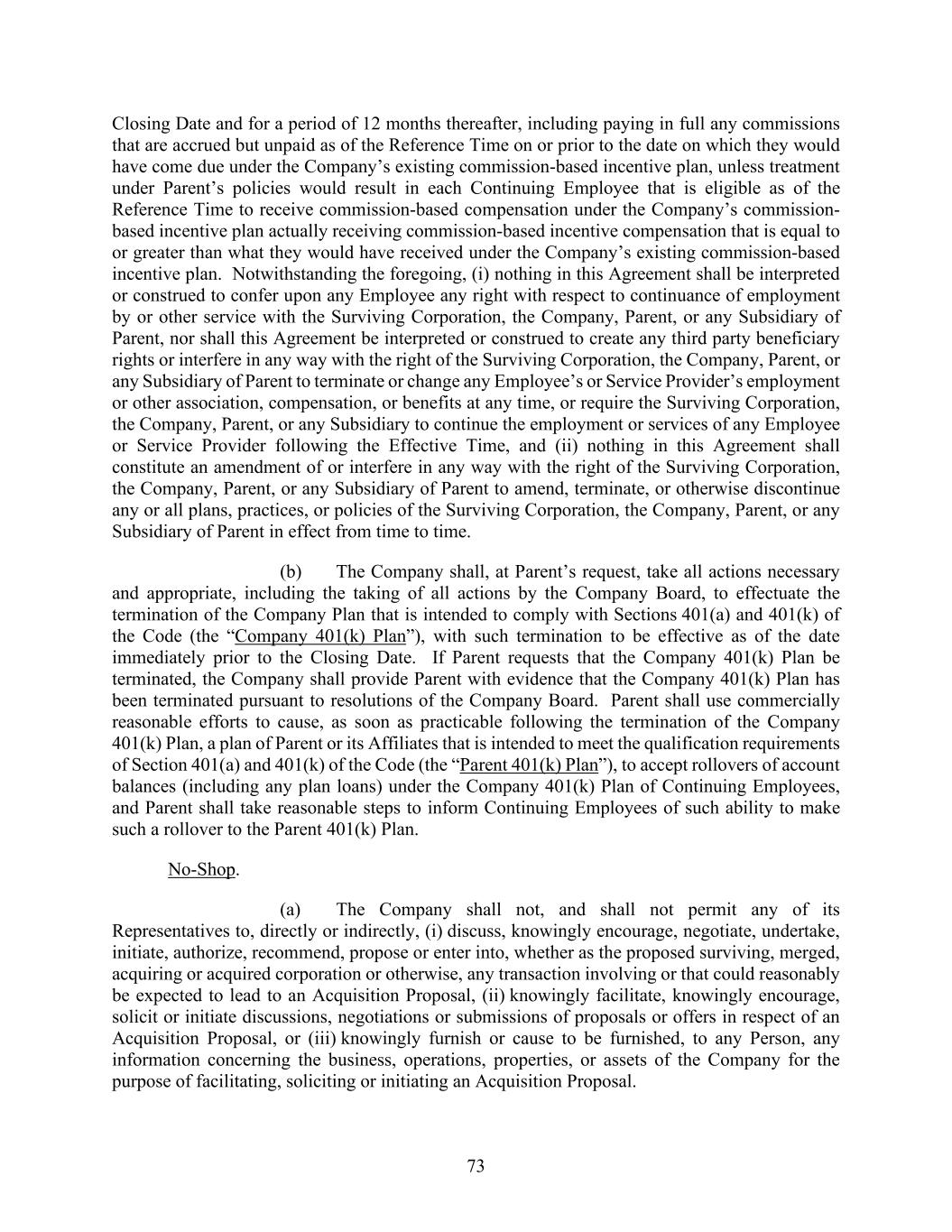 73 Closing Date and for a period of 12 months thereafter, including paying in full any commissions that are accrued but unpaid as of the Reference Time on or prior to the date on which they would have come due under the Company’s existing commission-based incentive plan, unless treatment under Parent’s policies would result in each Continuing Employee that is eligible as of the Reference Time to receive commission-based compensation under the Company’s commission- based incentive plan actually receiving commission-based incentive compensation that is equal to or greater than what they would have received under the Company’s existing commission-based incentive plan. Notwithstanding the foregoing, (i) nothing in this Agreement shall be interpreted or construed to confer upon any Employee any right with respect to continuance of employment by or other service with the Surviving Corporation, the Company, Parent, or any Subsidiary of Parent, nor shall this Agreement be interpreted or construed to create any third party beneficiary rights or interfere in any way with the right of the Surviving Corporation, the Company, Parent, or any Subsidiary of Parent to terminate or change any Employee’s or Service Provider’s employment or other association, compensation, or benefits at any time, or require the Surviving Corporation, the Company, Parent, or any Subsidiary to continue the employment or services of any Employee or Service Provider following the Effective Time, and (ii) nothing in this Agreement shall constitute an amendment of or interfere in any way with the right of the Surviving Corporation, the Company, Parent, or any Subsidiary of Parent to amend, terminate, or otherwise discontinue any or all plans, practices, or policies of the Surviving Corporation, the Company, Parent, or any Subsidiary of Parent in effect from time to time. (b) The Company shall, at Parent’s request, take all actions necessary and appropriate, including the taking of all actions by the Company Board, to effectuate the termination of the Company Plan that is intended to comply with Sections 401(a) and 401(k) of the Code (the “Company 401(k) Plan”), with such termination to be effective as of the date immediately prior to the Closing Date. If Parent requests that the Company 401(k) Plan be terminated, the Company shall provide Parent with evidence that the Company 401(k) Plan has been terminated pursuant to resolutions of the Company Board. Parent shall use commercially reasonable efforts to cause, as soon as practicable following the termination of the Company 401(k) Plan, a plan of Parent or its Affiliates that is intended to meet the qualification requirements of Section 401(a) and 401(k) of the Code (the “Parent 401(k) Plan”), to accept rollovers of account balances (including any plan loans) under the Company 401(k) Plan of Continuing Employees, and Parent shall take reasonable steps to inform Continuing Employees of such ability to make such a rollover to the Parent 401(k) Plan. No-Shop. (a) The Company shall not, and shall not permit any of its Representatives to, directly or indirectly, (i) discuss, knowingly encourage, negotiate, undertake, initiate, authorize, recommend, propose or enter into, whether as the proposed surviving, merged, acquiring or acquired corporation or otherwise, any transaction involving or that could reasonably be expected to lead to an Acquisition Proposal, (ii) knowingly facilitate, knowingly encourage, solicit or initiate discussions, negotiations or submissions of proposals or offers in respect of an Acquisition Proposal, or (iii) knowingly furnish or cause to be furnished, to any Person, any information concerning the business, operations, properties, or assets of the Company for the purpose of facilitating, soliciting or initiating an Acquisition Proposal.