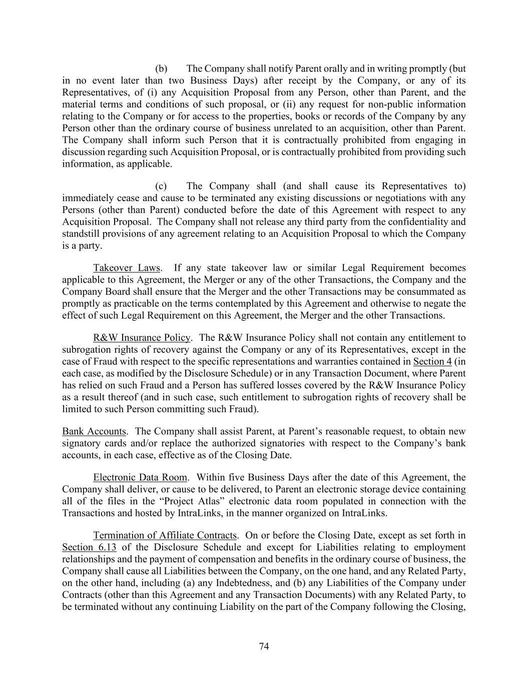 74 (b) The Company shall notify Parent orally and in writing promptly (but in no event later than two Business Days) after receipt by the Company, or any of its Representatives, of (i) any Acquisition Proposal from any Person, other than Parent, and the material terms and conditions of such proposal, or (ii) any request for non-public information relating to the Company or for access to the properties, books or records of the Company by any Person other than the ordinary course of business unrelated to an acquisition, other than Parent. The Company shall inform such Person that it is contractually prohibited from engaging in discussion regarding such Acquisition Proposal, or is contractually prohibited from providing such information, as applicable. (c) The Company shall (and shall cause its Representatives to) immediately cease and cause to be terminated any existing discussions or negotiations with any Persons (other than Parent) conducted before the date of this Agreement with respect to any Acquisition Proposal. The Company shall not release any third party from the confidentiality and standstill provisions of any agreement relating to an Acquisition Proposal to which the Company is a party. Takeover Laws. If any state takeover law or similar Legal Requirement becomes applicable to this Agreement, the Merger or any of the other Transactions, the Company and the Company Board shall ensure that the Merger and the other Transactions may be consummated as promptly as practicable on the terms contemplated by this Agreement and otherwise to negate the effect of such Legal Requirement on this Agreement, the Merger and the other Transactions. R&W Insurance Policy. The R&W Insurance Policy shall not contain any entitlement to subrogation rights of recovery against the Company or any of its Representatives, except in the case of Fraud with respect to the specific representations and warranties contained in Section 4 (in each case, as modified by the Disclosure Schedule) or in any Transaction Document, where Parent has relied on such Fraud and a Person has suffered losses covered by the R&W Insurance Policy as a result thereof (and in such case, such entitlement to subrogation rights of recovery shall be limited to such Person committing such Fraud). Bank Accounts. The Company shall assist Parent, at Parent’s reasonable request, to obtain new signatory cards and/or replace the authorized signatories with respect to the Company’s bank accounts, in each case, effective as of the Closing Date. Electronic Data Room. Within five Business Days after the date of this Agreement, the Company shall deliver, or cause to be delivered, to Parent an electronic storage device containing all of the files in the “Project Atlas” electronic data room populated in connection with the Transactions and hosted by IntraLinks, in the manner organized on IntraLinks. Termination of Affiliate Contracts. On or before the Closing Date, except as set forth in Section 6.13 of the Disclosure Schedule and except for Liabilities relating to employment relationships and the payment of compensation and benefits in the ordinary course of business, the Company shall cause all Liabilities between the Company, on the one hand, and any Related Party, on the other hand, including (a) any Indebtedness, and (b) any Liabilities of the Company under Contracts (other than this Agreement and any Transaction Documents) with any Related Party, to be terminated without any continuing Liability on the part of the Company following the Closing,